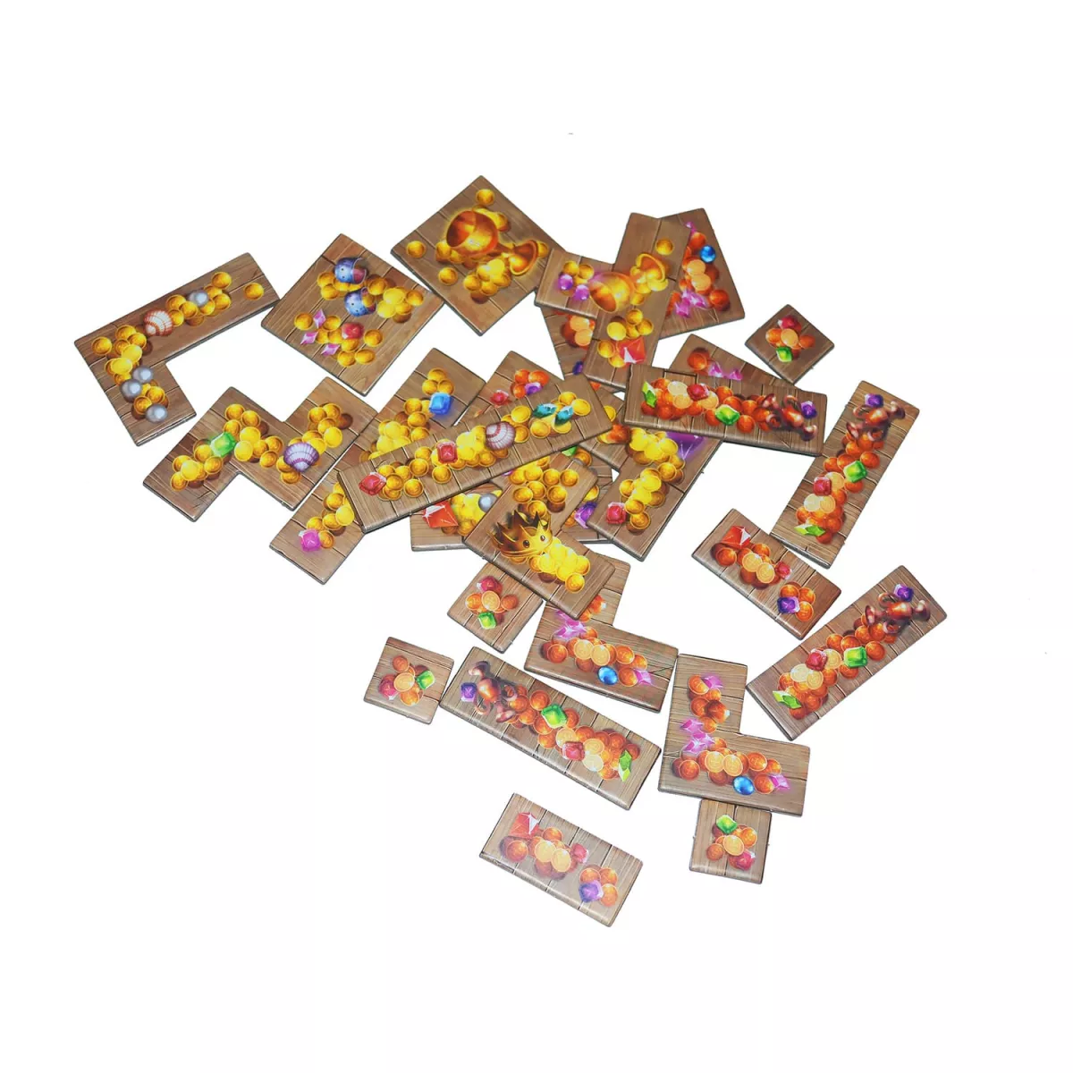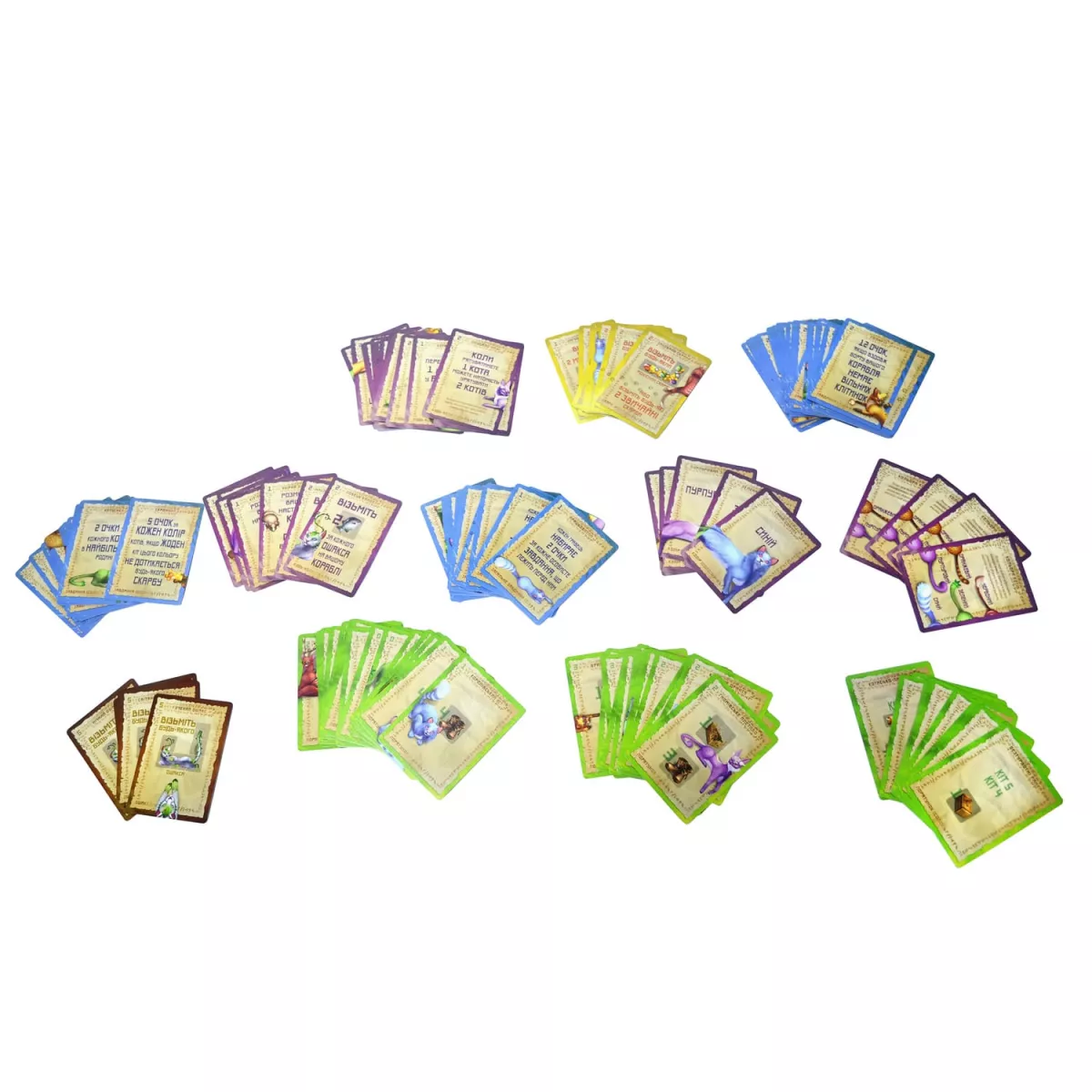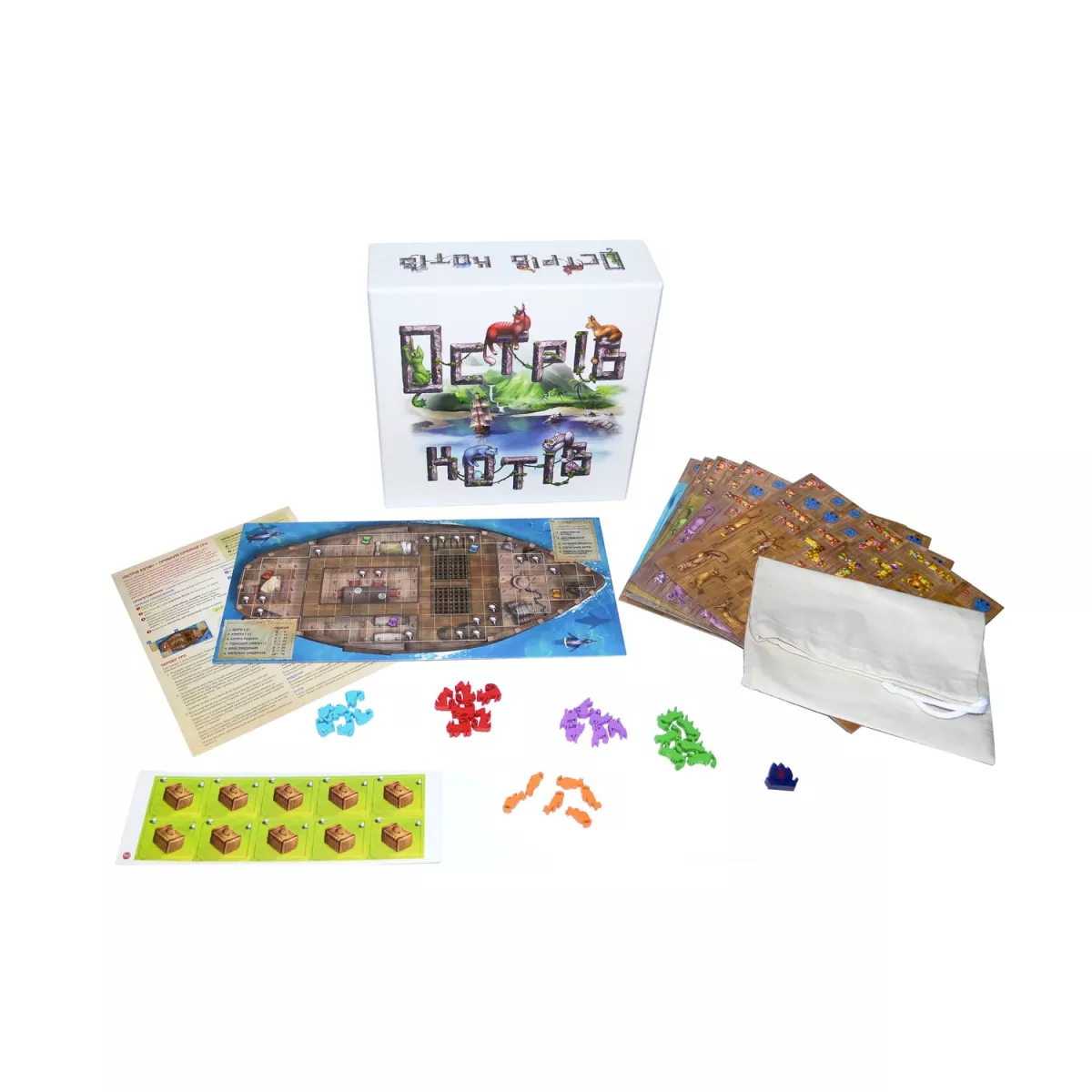 У коробці 30 фігурок котів (6 кожного кольору), корабель Веша, 85 тайлів котів (17 кожного кольору), 6 тайлів ошаксів, 44 звичайних скарбів, 20 рідкісних скарбів, 30 карт завдань, 8 карт загальних завдань, 31 раптова карта, 60 карт порятунку, 21 карта скарбів і ошаксів, 47 карт для одиночної гри, 18 карт для сімейної гри, 4 планшета кораблів, 1 планшет острова, 1 мішок дослідження, 10 жетонів кошиків, 42 жетона риби, Правила, Блокнот для підрахунку очок