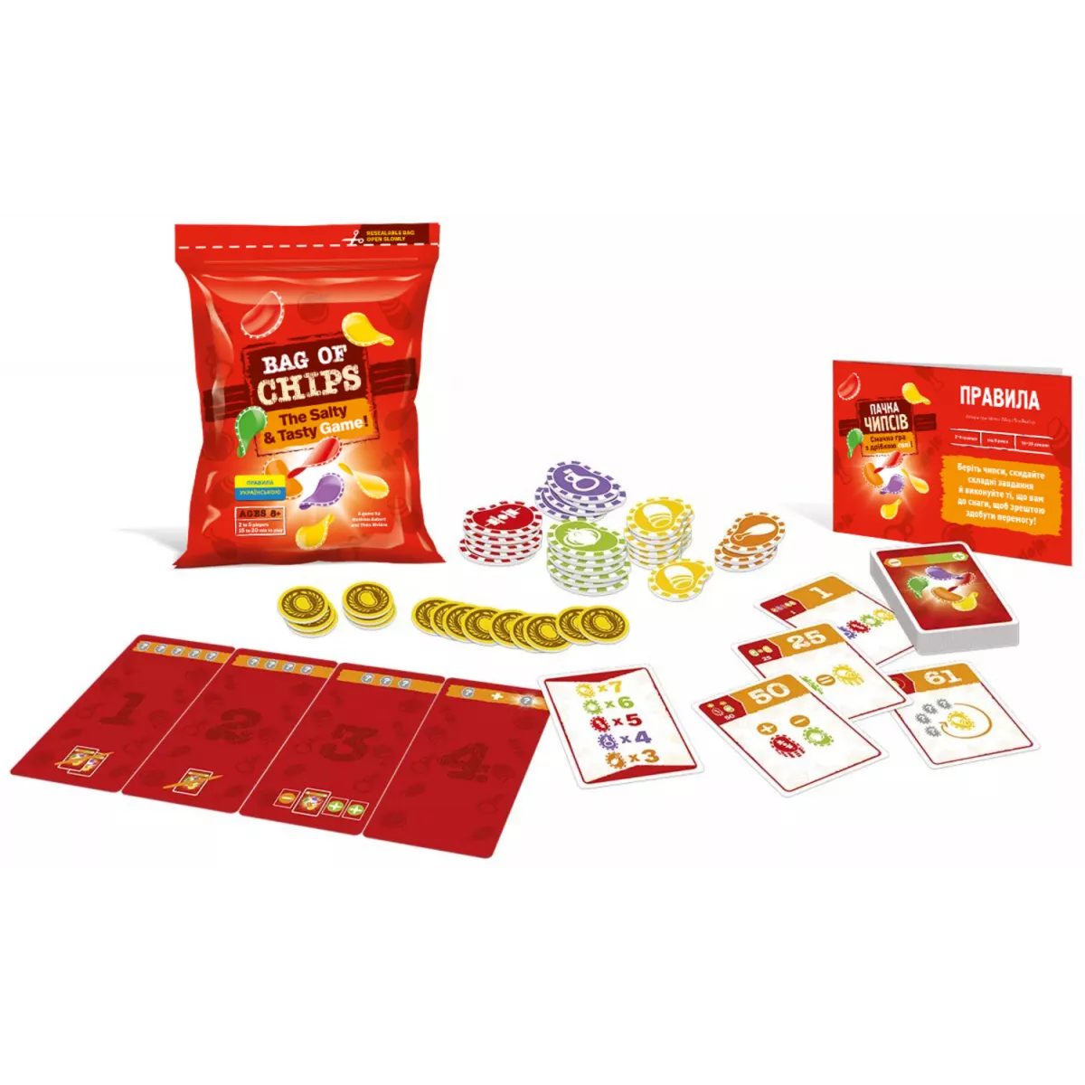 • Яскравий дизайн: картонна «пачка» чипсів та кольорові жетони створюють унікальну атмосферу.