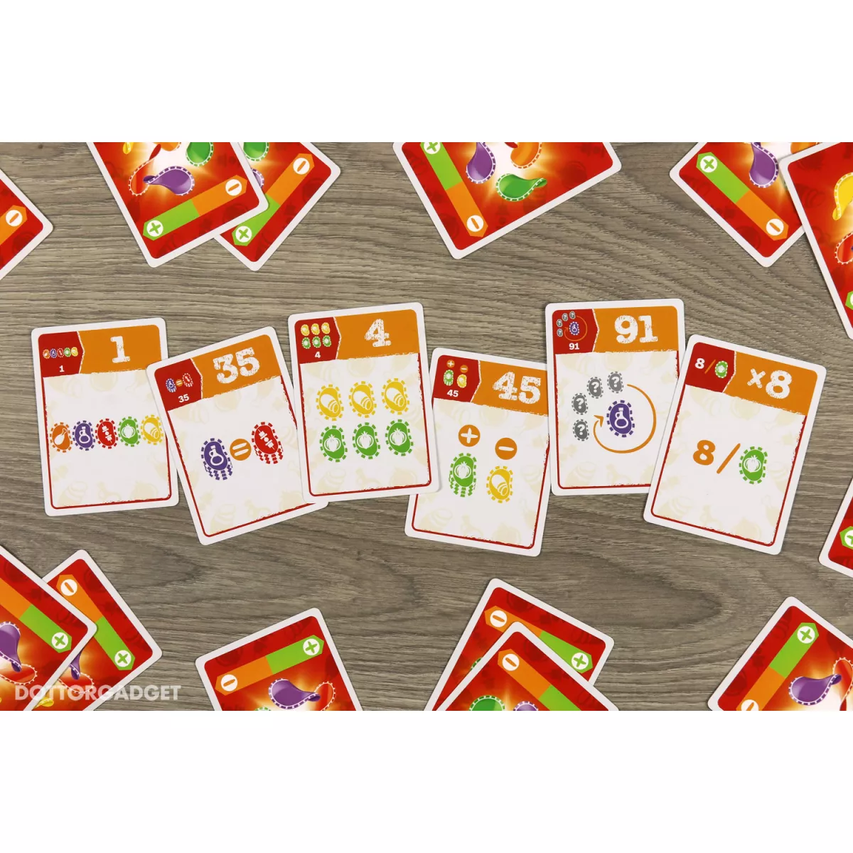 У коробці 36 карт завдань, 4 планшети, 25 жетонів чипсів (5 різних кольорів), 16 жетонів нагород, 1 пачка (пачка чипсів), 1 карта-пам’ятка, 1 правила гри