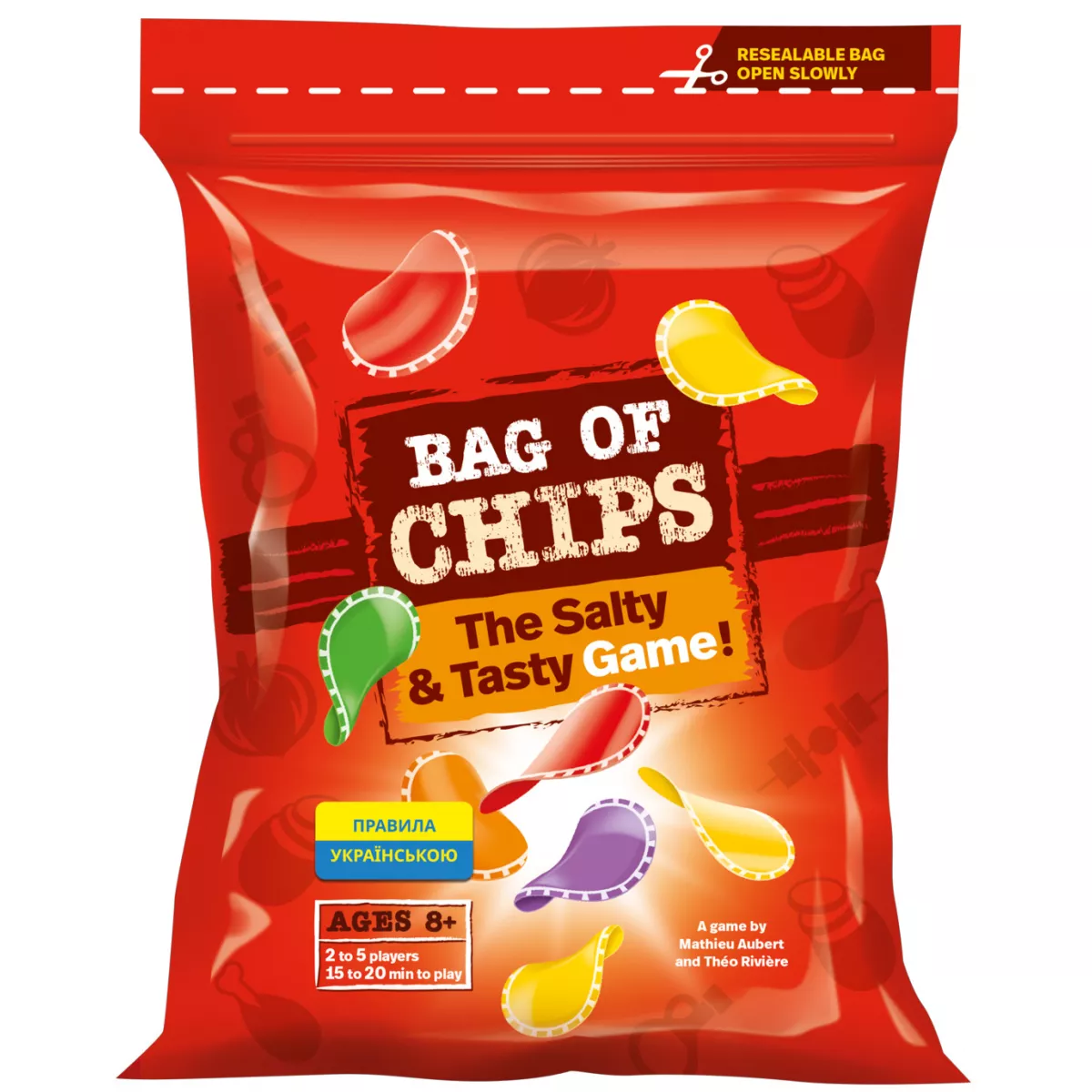 «Bag of Chips (Пачка чипсів)» – це весела гра на удачу від досвідчених геймдизайнерів. Її створили Тео Рів'єра («Петля», «Драфтозаври», «Хамелеони Ненажери») та Метью Оберта («Тіні: Амстердам»).