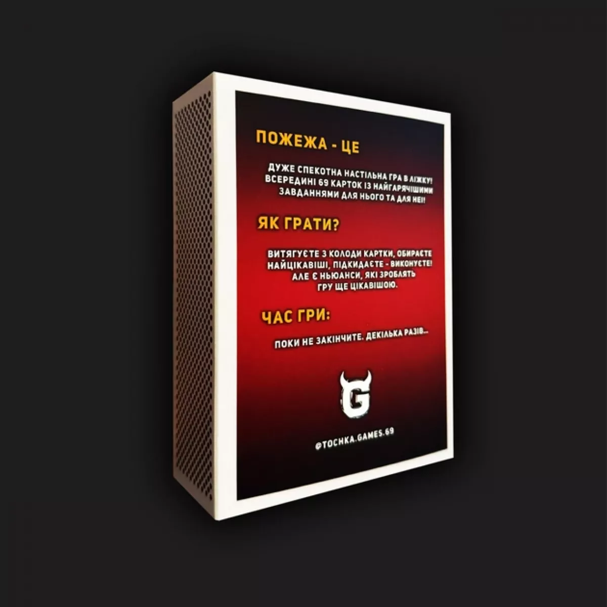 Гра містить 150 карток з відвертими завданнями, що додадуть вогню у відносини та спрямовані на максимальне посилення пристрасті та близькості між партнерами.