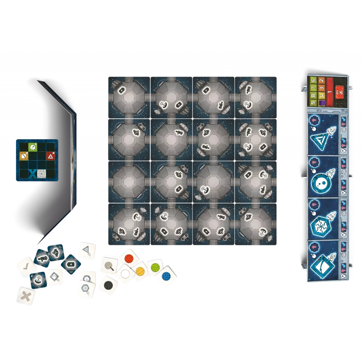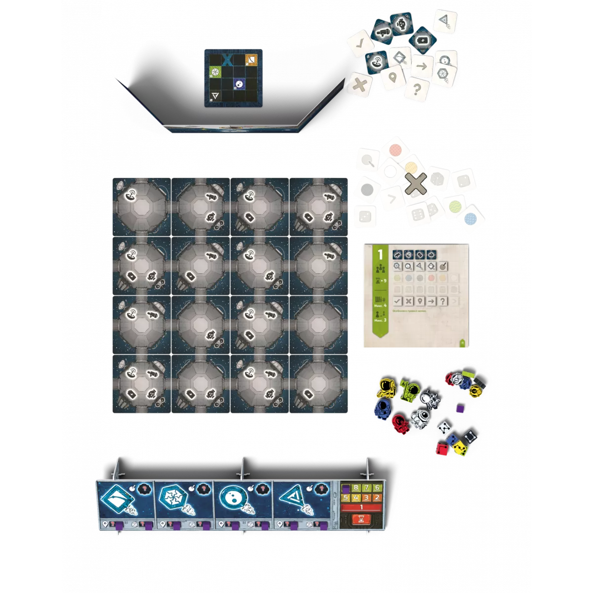 У коробці Підставка для карти фінальної комбінації, 16 плиток кают, 10 двосторонніх карт фінальних комбінацій, 3 двосторонні карти кризових фінальних комбінацій, 4 карти ролей, Ширма ШІ, 6 фішок кольорів, 6 фігурок астронавтів, 6 кольорових кубиків, Нейтральні маркери, Жетони комунікації та жетон кризи, Книжка сценаріїв, Панель ключів астронавтів, Книжка правил