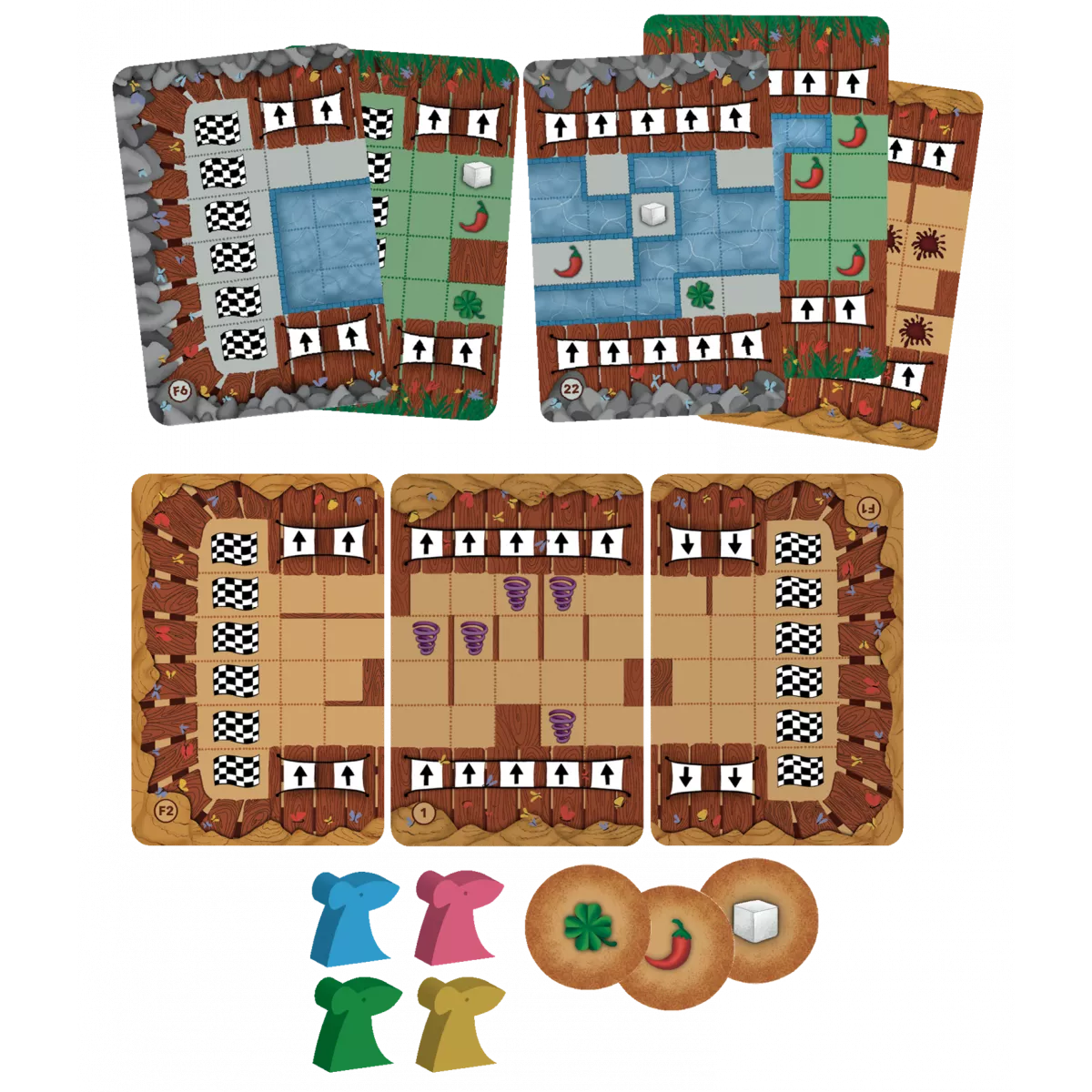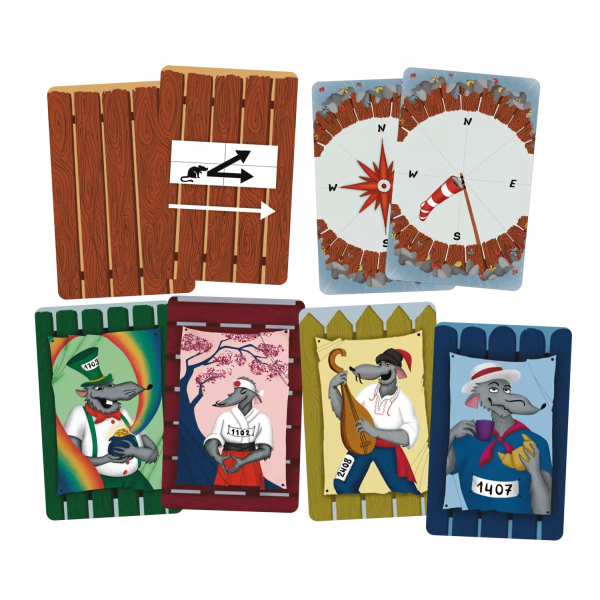 У коробці 24 карти щурів, 6 карт наказів, 6 карт старту/фінішу треку, 24 карти ділянок треку, 16 карт модуля «Вітер», 4 фішки щурів, 12 жетонів переваг, Правила