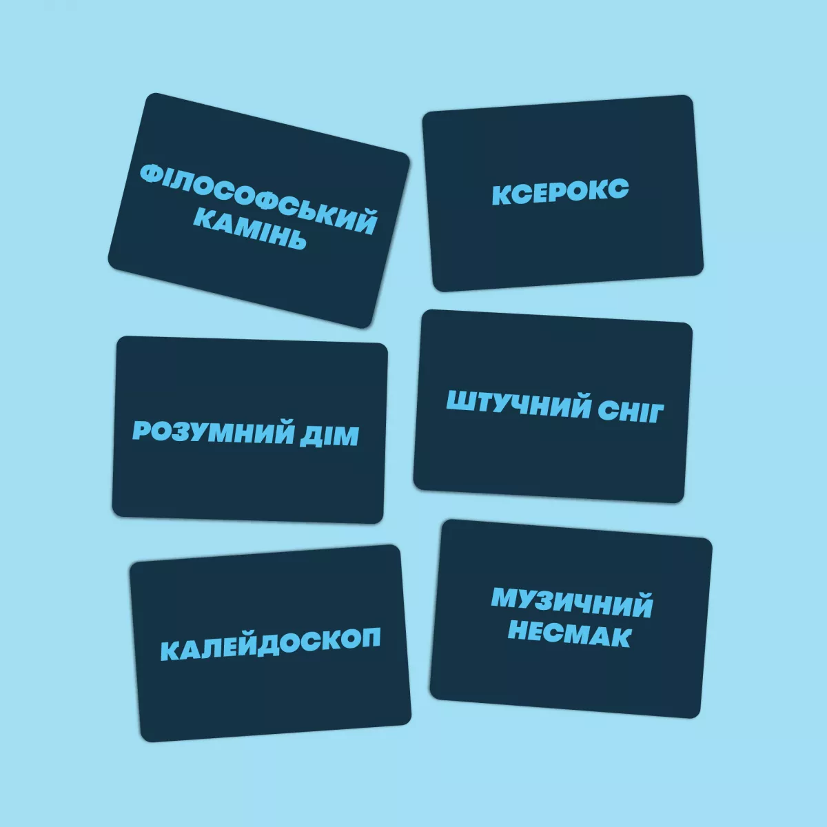 Думаєте, все так легко? А спробуйте пояснити жестами «закарпатського ніндзя» або наспівати пояснення до словосполучення «музичний несмак»? До того ж, у вас всього 1 хвилина! Переможе команда, яка відгадає більше карток за всю гру.