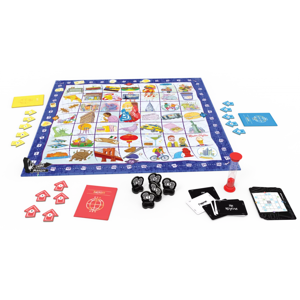 У коробці 165 карт слів, 1 фішка підрахунку очок, 5 паспортів, 5 фішок гравців, 2 ігрових поля, 25 фішок стрілок, 20 карт мапи, 5 карт з довідкою, 5 фішок слідів, 6 фішок сувенірів, Пісочний годинник, 2 путівники, Правила