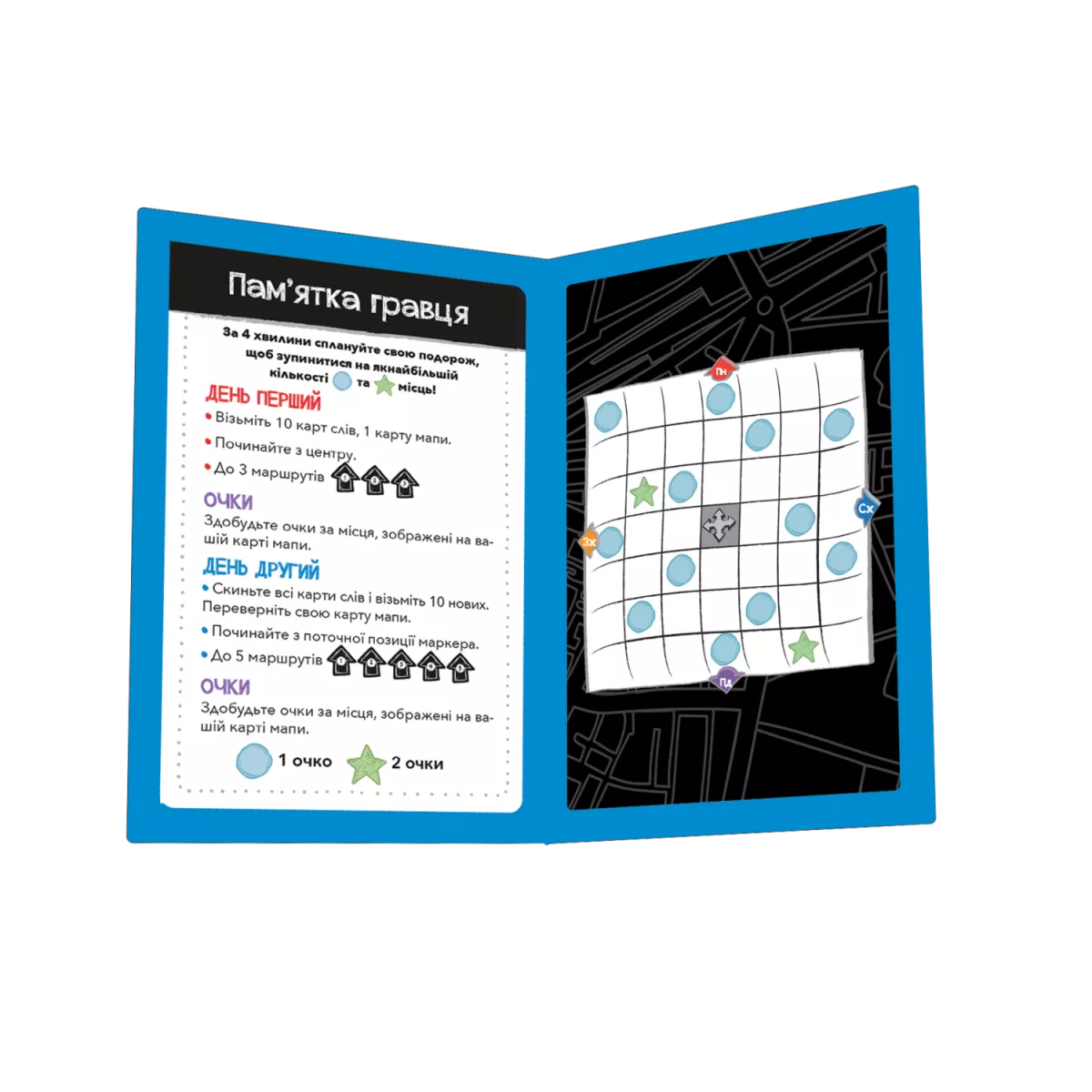 Подорож. Гравці по черзі виконують дію мандрівника. Мандрівник зачитує всім слова на картах свого запланованого маршруту, після чого замовкає. Інші гравці (місцеві жителі) обговорюють варіанти та розміщують фішки слідів, де на їхню думку хотів зупинитися мандрівник. Далі мандрівник відкриває свою мапу, гравці перевіряють правильні зупинки та отримують за них очки. Настає черга іншого мандрівника.