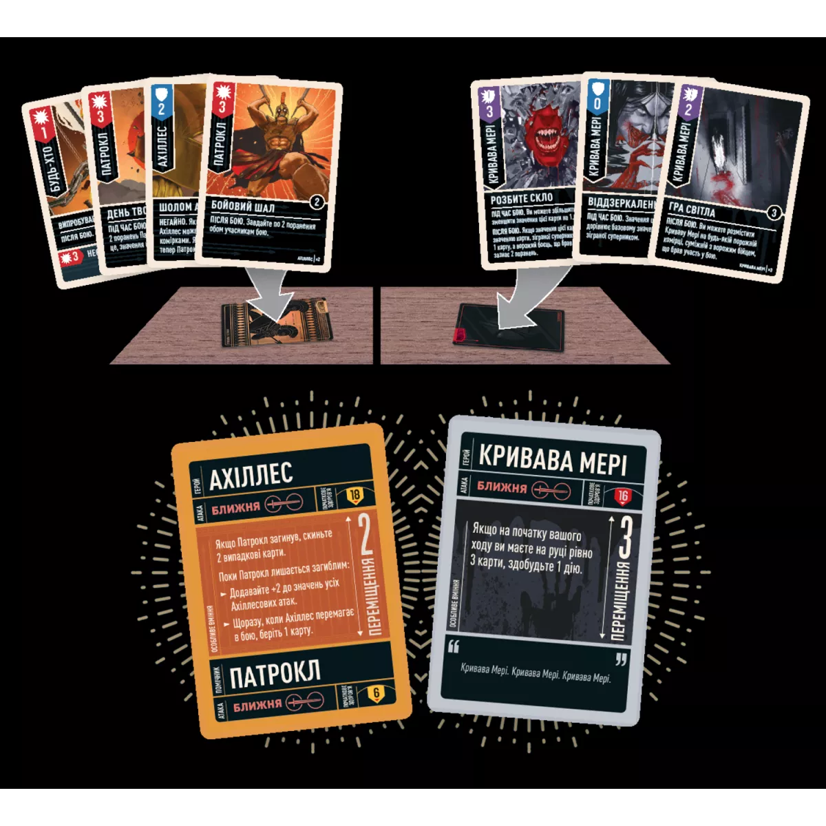 У кожного героя є унікальна колода карт, яка допоможе йому в битві. Незважаючи на його ослаблену п’яту, Архілес і його помічник Патрокл працюють разом, щоб вижити, Сунь Укун ховається за своїми численними клонами, Кривава Мері є жорстокою ланцюговою атакою, а Єнненга знищить своїх супротивників своєю армією! Переможе останній гравець.
