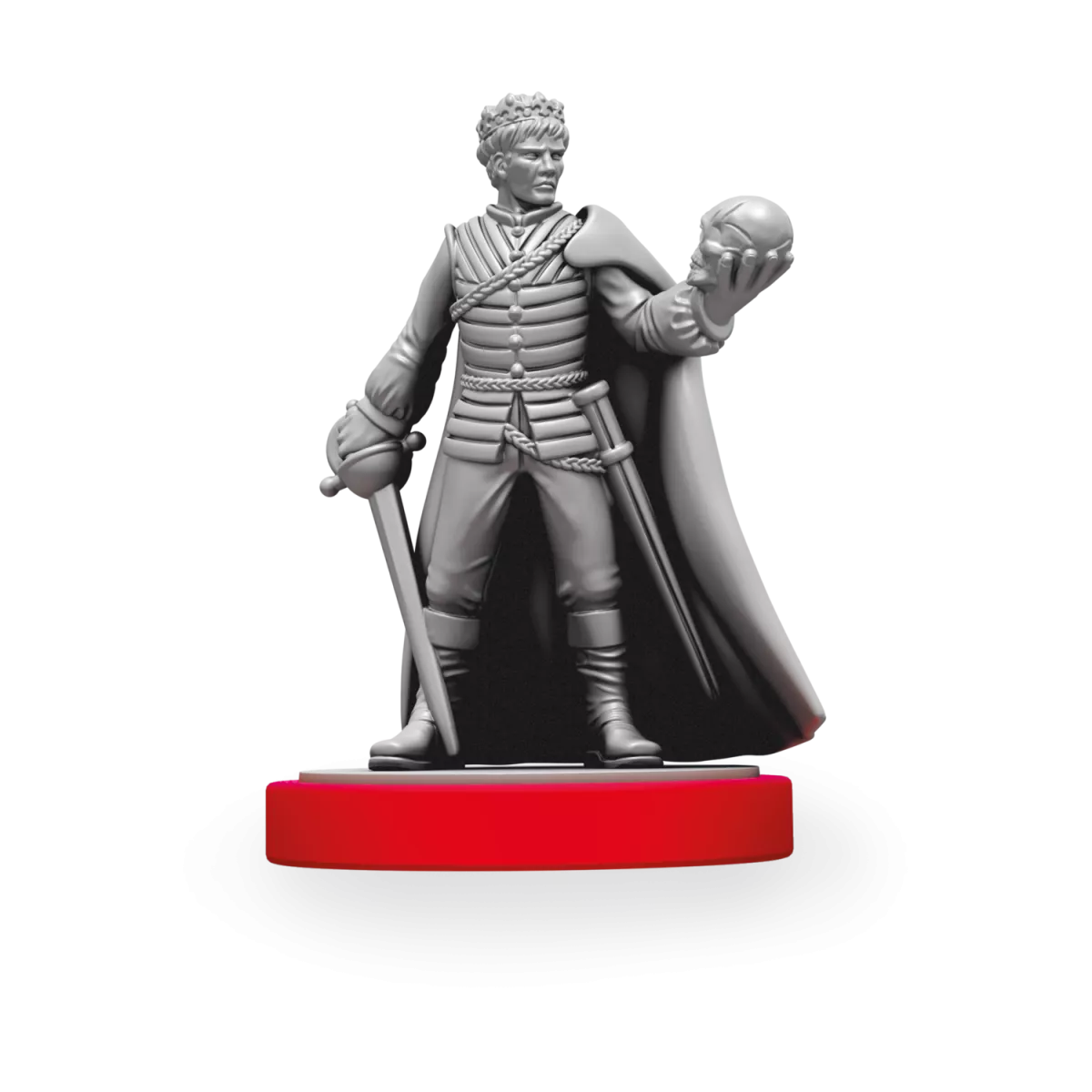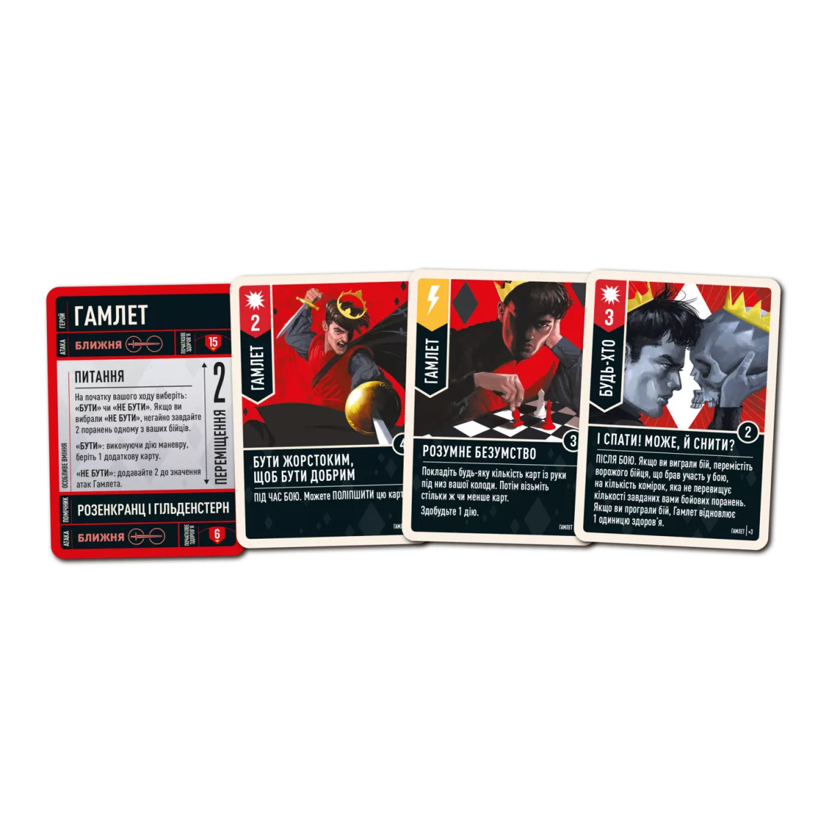 Гамлет. Бути чи не бути? Питання, яке вічно заганяє принца в глухий кут. На початку кожного ходу виберіть, якою стороною догори лежатиме жетон – «бути» або «не бути». Поки на жетоні «бути», щоразу за маневру беріть одну додаткову карту. Коли вибираєте «не бути», мусите негайно завдати двох поранень одному з ваших бійців, проте значення всіх атак Гамлета матимуть +2.