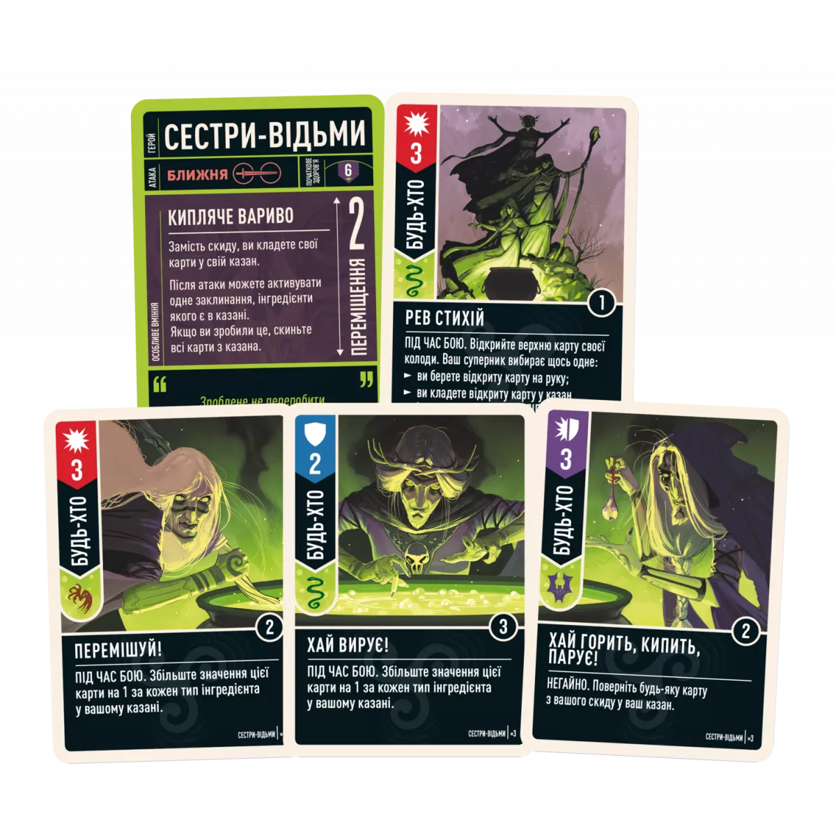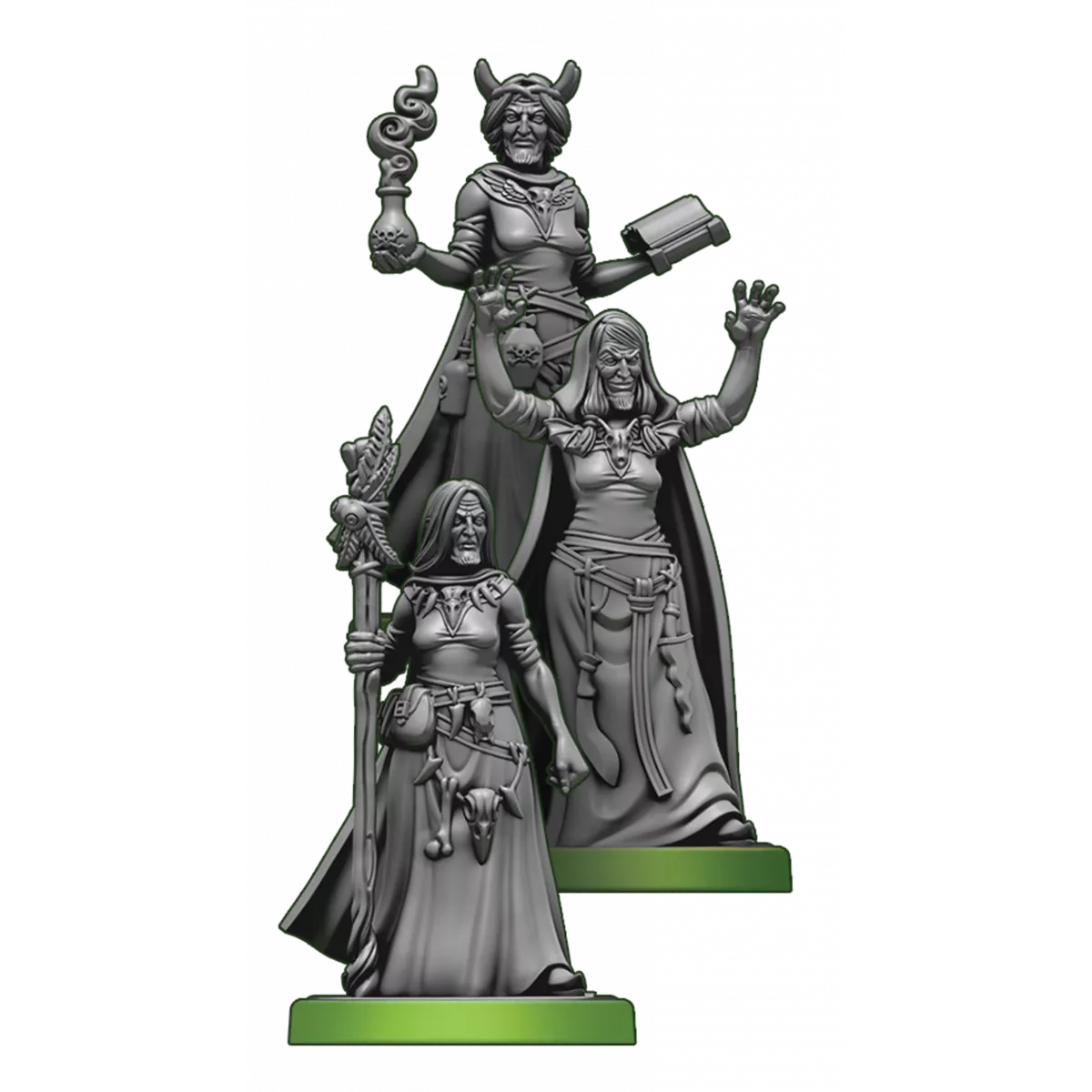 Сестри-відьми. Три сестри – це три герої, кожен із яких має власну фігурку й лічильник здоров’я. Усі карти в колоді сестер мають символ певного інгредієнта. Щоразу, коли маєте покласти карту дії до скиду, натомість відправте її в казан. У книзі біля казана є чотири заклинання, застосування кожного з яких вимагає наявності певних інгредієнтів. Після своєї атаки ви можете активувати заклинання, якщо маєте потрібні інгредієнти, й скинути всі карти з казана, зокрема й невикористані.