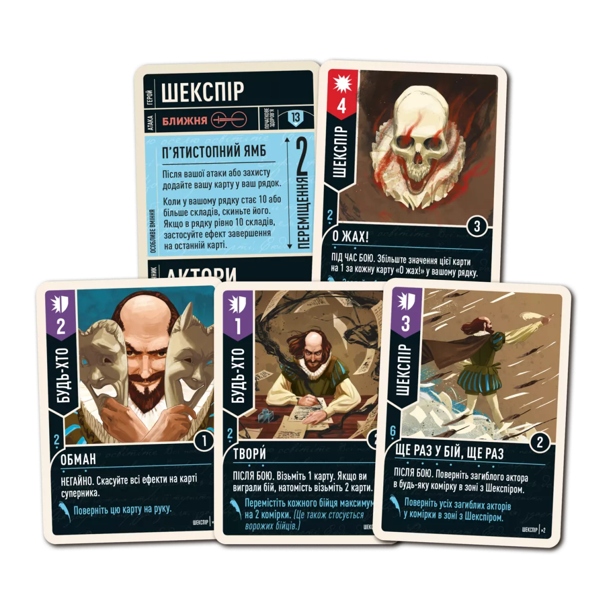 Шекспір. Ейвонський бард володіє вмінням під назвою «пʼятистопний ямб». Усі карти в колоді Шекспіра мають цифру, що вказує кількість складів у назві карти, а також ефект завершення. Щоразу, коли граєте бойову карту, замість того, щоб після бою відправити її до скиду, покладіть її горілиць перед собою, щоб додати до рядка. Якщо після цього в рядку сумарно є рівно десять складів, застосуйте ефект завершення останньої карти та скиньте всі карти з рядка. Якщо ж кількість складів більша за десять, скиньте всі карти з рядка без застосування ефекту.