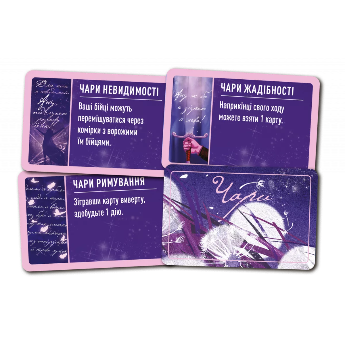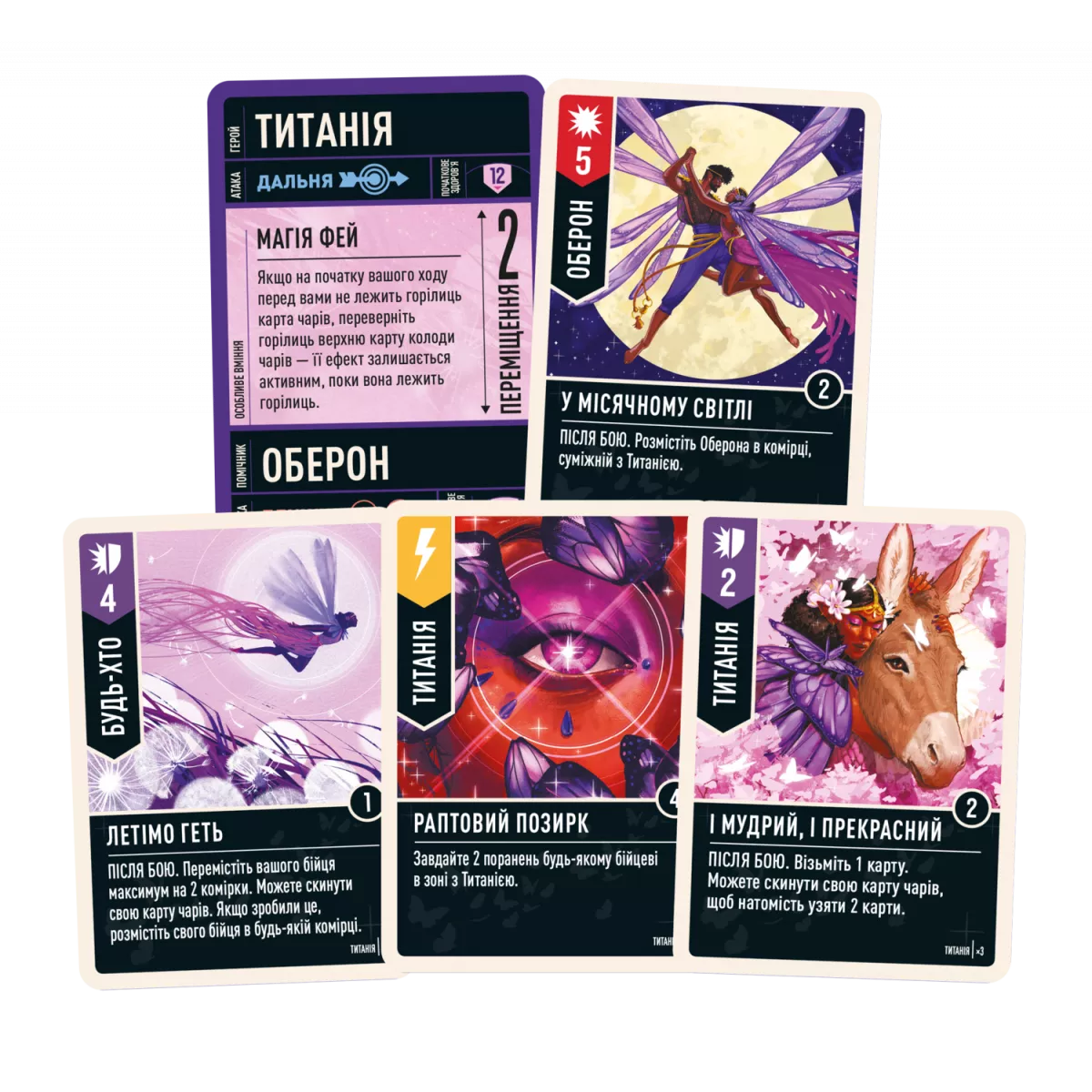 Титанія. Королева фей володіє потужними чарами. Титанія використовує колоду з шести карт чарів, кожна з яких має певний ефект. На початку ходу, якщо перед вами немає активної карти чарів, відкрийте верхню карту з колоди чарів. Вона буде активною, поки лежить горілиць на своєму місці. Ви можете скинути активну карту чарів за допомогою деяких ефектів карт дій. Проте коли карти чарів вичерпаються, ви не зможете утворити нову колоду зі скиду. Але деякі ефекти карт дій дозволять повернути чари в колоду.