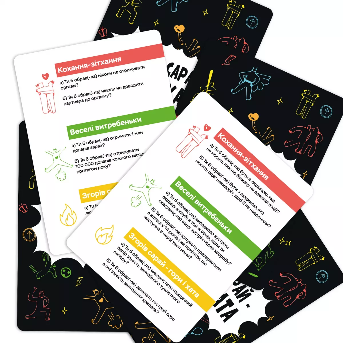 Гравець дістає картку і зачитує запитання-вибір, після чого всі інші намагаються відгадати який варіант обере активний гравець. На картах ви зустрінете дотепні, а часом крінжові ситуації, які змусять вас не лише реготати, а й дискутувати на різні теми.