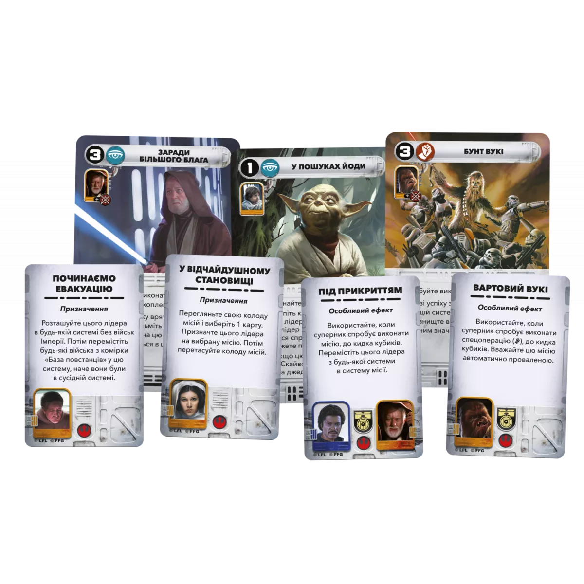• Фаза відновлення: гравці повертають лідерів у резерв, добирають нові карти місій і просувають чергу будівництва. Імперія запускає дроїдів-розвідників, а Повстанці добирають карти цілей. Раунд завершується пересуванням жетона на шкалі часу.