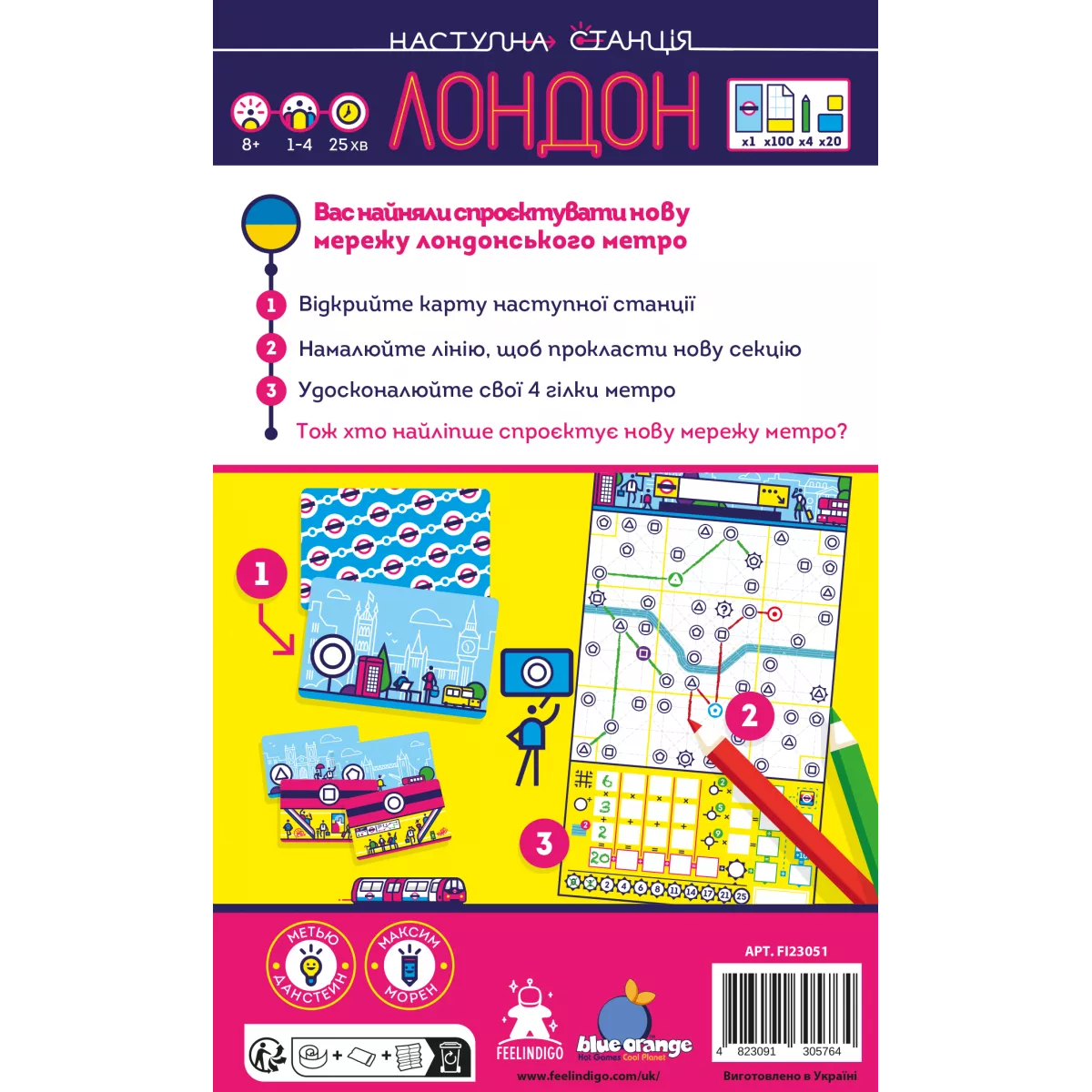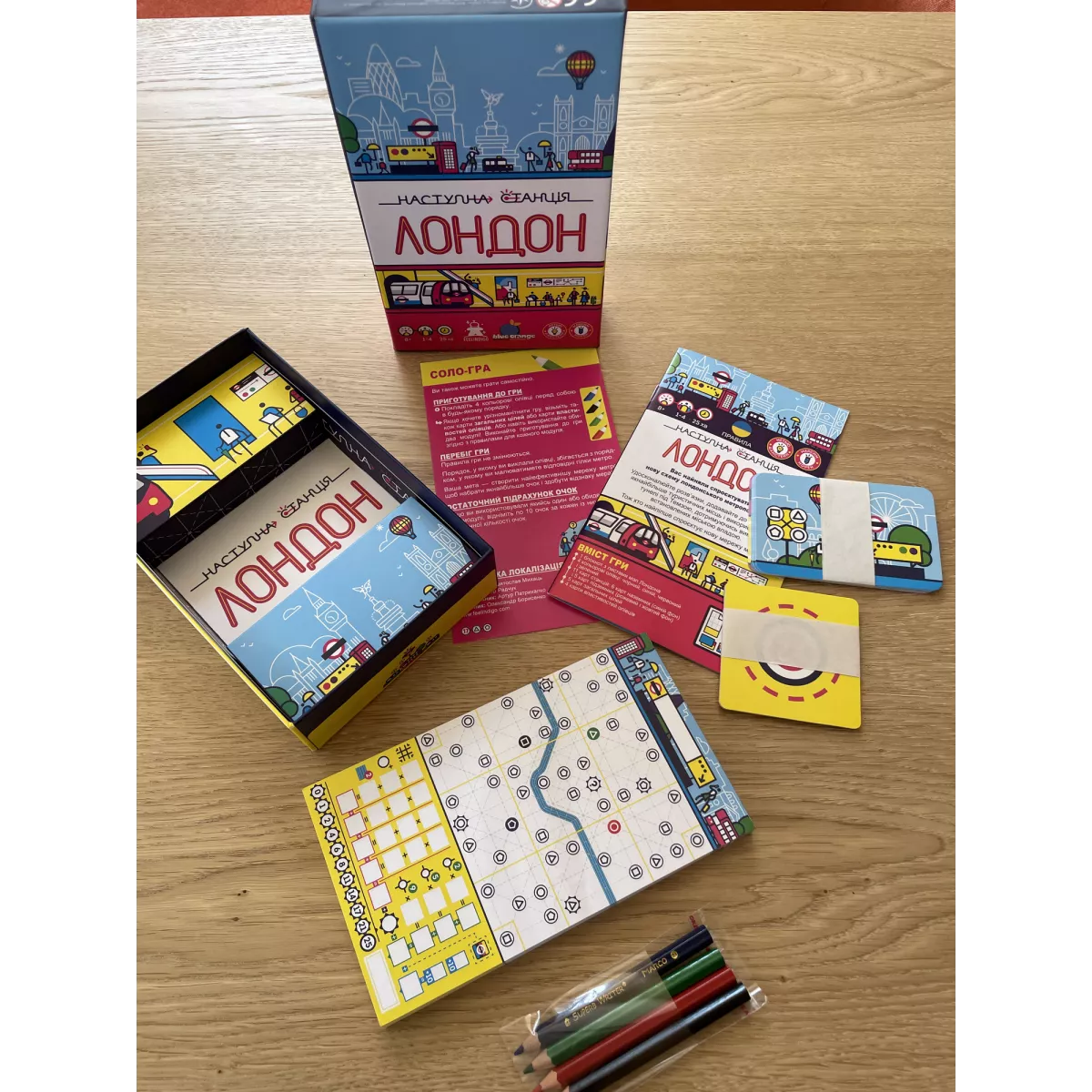 Лондонське метро - це справжній монумент праці та наполегливості! Чотириста кілометрів протяжності колій, річний потік людей сягає більше мільярда! Важко повірити, що колись один із найбільших у світі метрополітенів також був крихітним та складався з кількох гілок та десятка станцій. Тож у настілочці Наступна станція Лондон ви маєте змогу стати архітектором Лондонського метро у перші роки його заснування. Це швидка гра для компанії від 1 до 4 чоловік, яка заснована на механіці «відкрий та малюй». Щоходу з колоди маршрутів відкривається нова карта, яка вказує на тип станції, до якої вам треба приєднати колію. Та будьте обачні, адже перетинати вже побудовані колії не можна, такого Лондонське метро не витримає! У грі безліч аркушів для малювання, чому ж максимум можуть брати участь лише 4 гравці? А це пов’язано з механікою гри, адже вам доведеться будувати не одну гілку метро, а аж 4 різні. І якщо ви бачили карту метро, то знаєте, що для зручності кожен з маршрутів має власний колір. От і у нашій коробочці лежать 4 кольорових олівці, які щораунду передаються між гравцями, аби створити розгалужену систему маршрутів. Наприкінці гри гравці підраховують максимальну кількість районів, які охоплює метрополітен, чи заїжджає потяг у туристичні місця та чи виконані додаткові завдання від мерії. Хто зможе набрати найбільше переможних очок – того і будуть вітати, як славетного архітектора Лондонського метро! Якщо ви любите швидкі, абсолютно неконфліктні ігри на малювання шляхів, у яких можна просто відпочити, розв’язуючі головокрутки, то гра Наступна станція Лондон ідеально підійде для вашого вечірнього відпочинку! Та коли ж ви бажаєте вибратися з підземних тунелів та відправитись у незвідані землі, аби складати карти для наступних дослідників, зверніть увагу на гру Картографи, у якій вже можна взаємодіяти з іншими гравцями, трішки шкодячи їх планам.