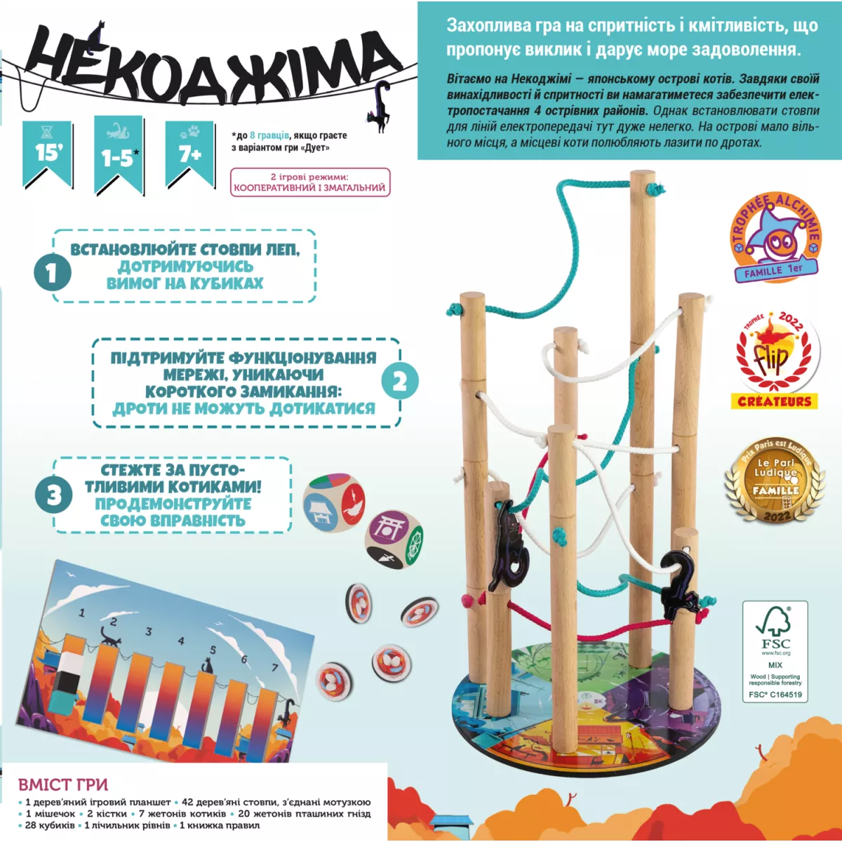 «Некоджіма» – це оригінальна дерев'яна гра на вправність і спритність, у якій ви встановлюватимете денчю (стовпи ЛЕП) і намагатиметеся підтримувати рівновагу в цій мережі. Складність у тому, що дроти не можуть дотикатися, щоб не відбулося коротке замикання, а це не так просто, як здається на перший погляд… а те, що коти гуляють дротами, може спричинити КОТОстрофічні наслідки!