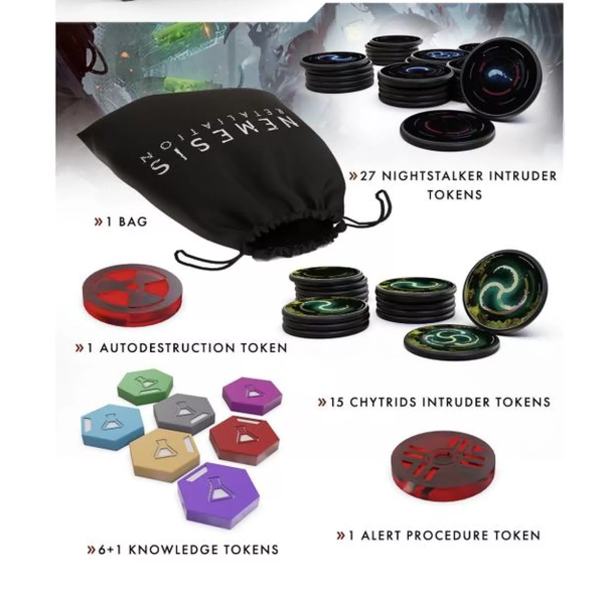 У коробці 1 Bag, 27 Nightstalker intruder tokens, 15 Chytrid intruder tokens, 6+1 Knowledge tokens, 1 Autodestruction token, 1 Alert Procedure token, 1 Vent Control, 1 Time token
