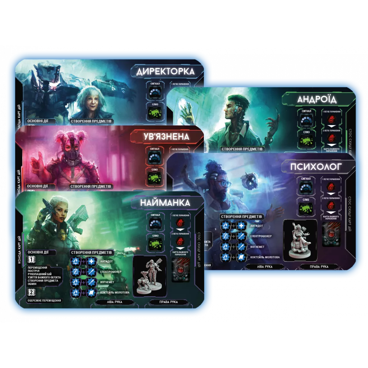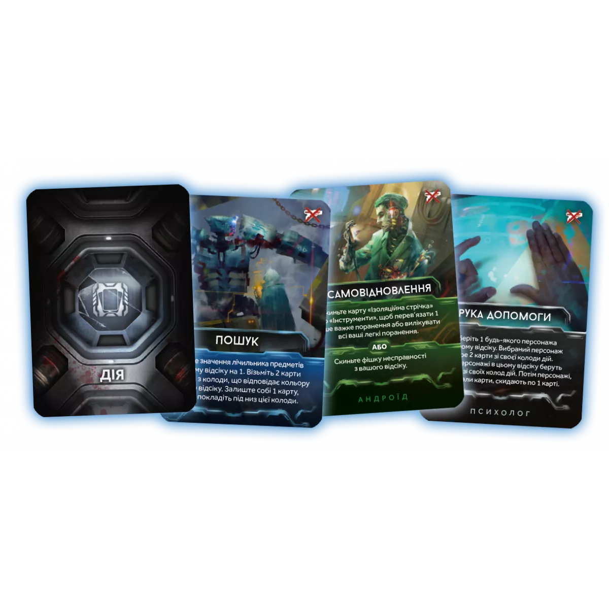 Андроїд. Андроїд може полагодити себе лише за допомогою певних предметів і своєї карти дії «Самовідновлення». Андроїд доволі потужний, проте має обмежену автономність. Коли фішка на треку часу досягає клітинки «5», системи андроїда вимикаються і його фігурка вилучається з поля. Предмет «Екстрене джерело живлення» дає змогу андроїду функціонувати довше. Якщо гравець не отримає цей предмет, андроїд закінчить гру раніше. Андроїд не може бути зараженим, тому він відразу сканує свої карти інфекцій і зазнає легкого поранення, якщо на карті є напис «ЗАРАЖЕНИЙ».
