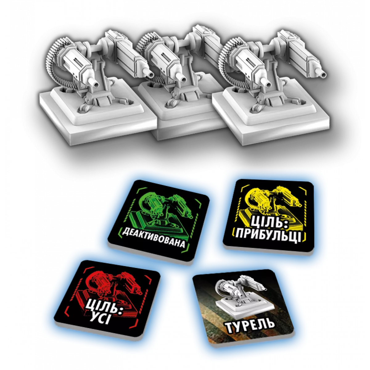 Фігурку турелі розміщують у відсіку, якщо відкрито відповідний жетон дослідження. Перемішайте три різні жетони стану турелі та покладіть їх стосом долілиць біля фігурки відповідної турелі. Верхній жетон у стосі визначає поточний стан турелі. Цей жетон відкривається, коли будь-який персонаж уперше переміщується у відсік з туреллю. Турель можна знищити, зігравши карту дії «Руйнування». На кроці «Поранення від вогню» фази подій прибульці завжди знищують активовані турелі у своїх відсіках.