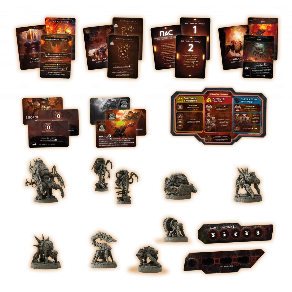 | У коробці | 50+ деталізованих фігурок, 6 двосторонніх плиток персонажів, 40+ жетонів, 220+ карт |
