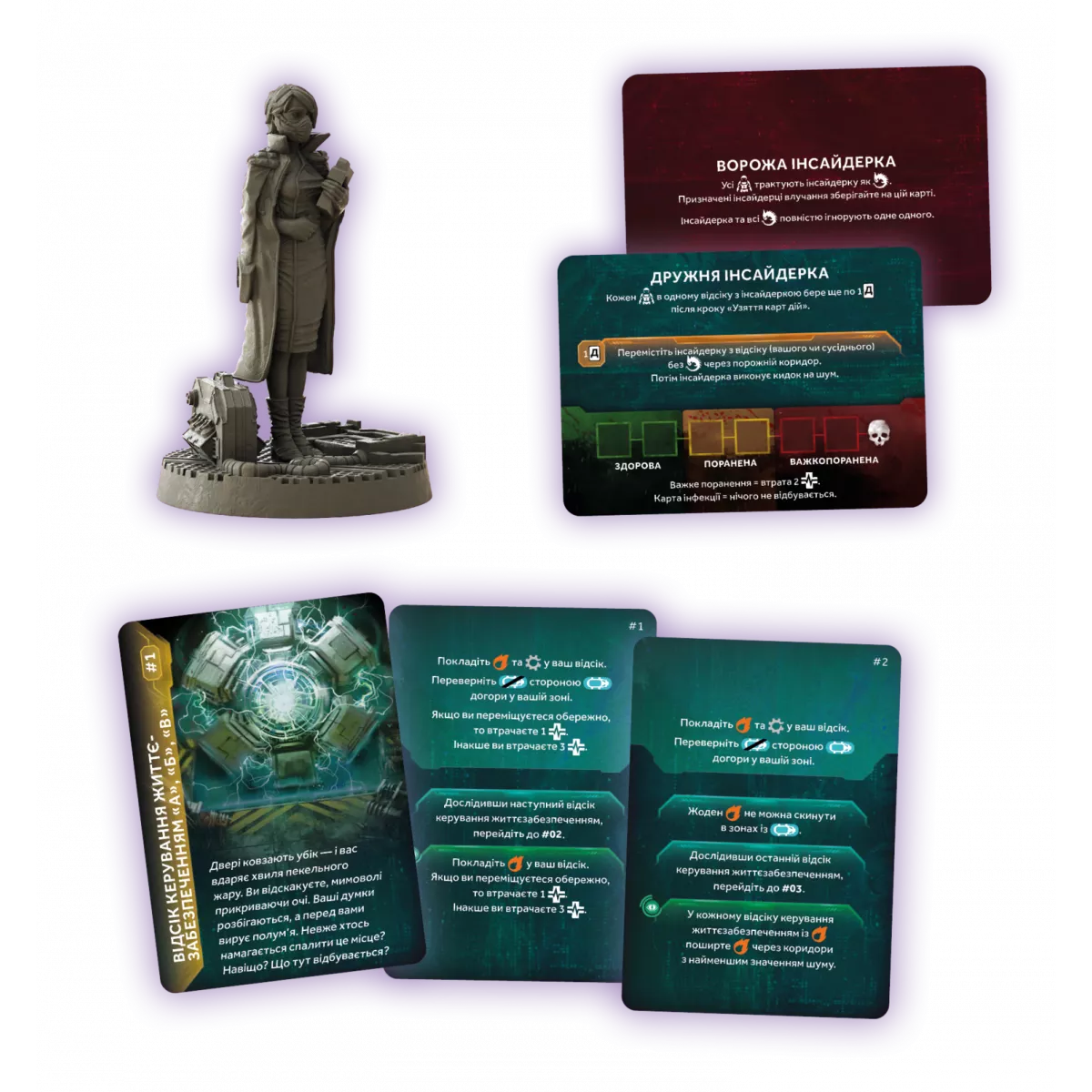 Лицьова сторона карти містить короткий вступ, а зворот — чотири типи ефектів: негайний ефект, постійний ефект, нову дію або ефект дослідження. Кожна група карт відсіку — одна історія інсайдерки, що розкривається протягом партії.