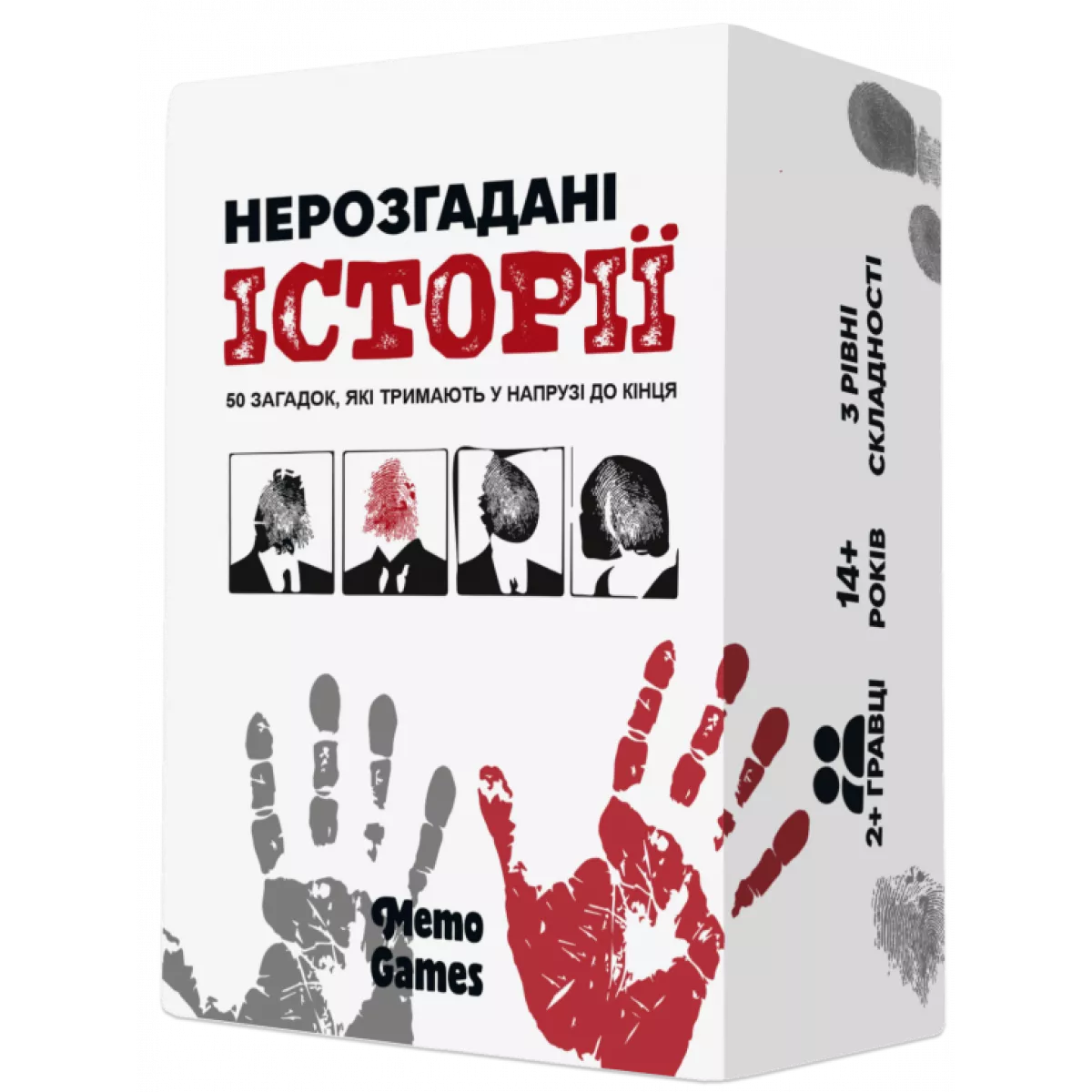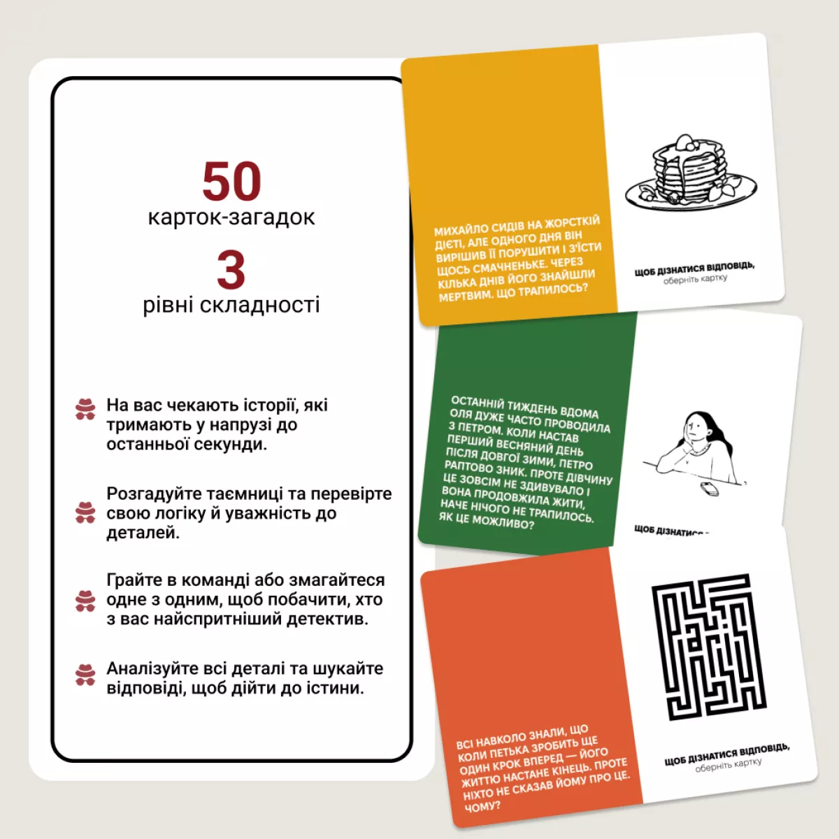 В коробці — короткі детективні історії, які змусять вас напружити свої дедуктивні здібності та інтуїцію. Кожна з 50-ти карток – новий сюжет з неочевидною розв'язкою. Щоб її розгадати, вам та вашим друзям доведеться мислити поза шаблонами та звертати увагу на деталі.