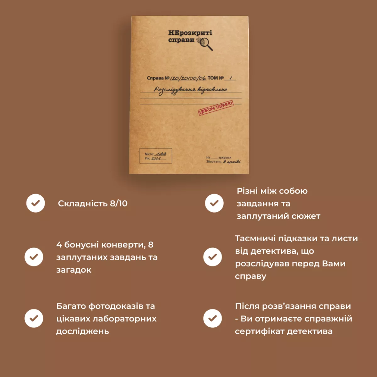 У коробці 55+ докуменів слідства, , 4 бонусні конверти, , 8 заплутаних завдань та загадок