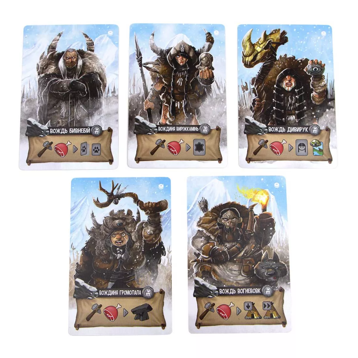 У коробці 75 карт племені (по 15 карт 5 типів), 10 карт культури (5 для кожного модуля), 60 карт тварин (по 10 карт 5 типів + по 5 карт 2 типів), 5 карт вождів, Правила