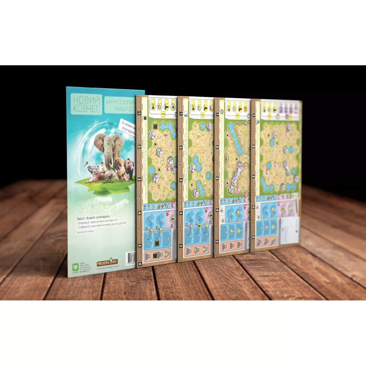 В наборі 4 планшети з п'ятьма новими мапами зоопарків, одна з яких повторюється на одному боці планшетів для турнірної гри, а інші чотири - унікальні для кожного гравця.