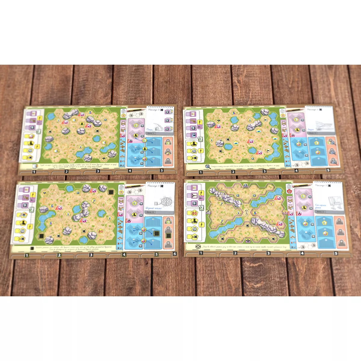 У коробці 4 мапи зоопарків, Сторона А - турнірна мапа зоопарку «1», Сторона Б - одна з мап зоопарку від «11» до «14», лист правил