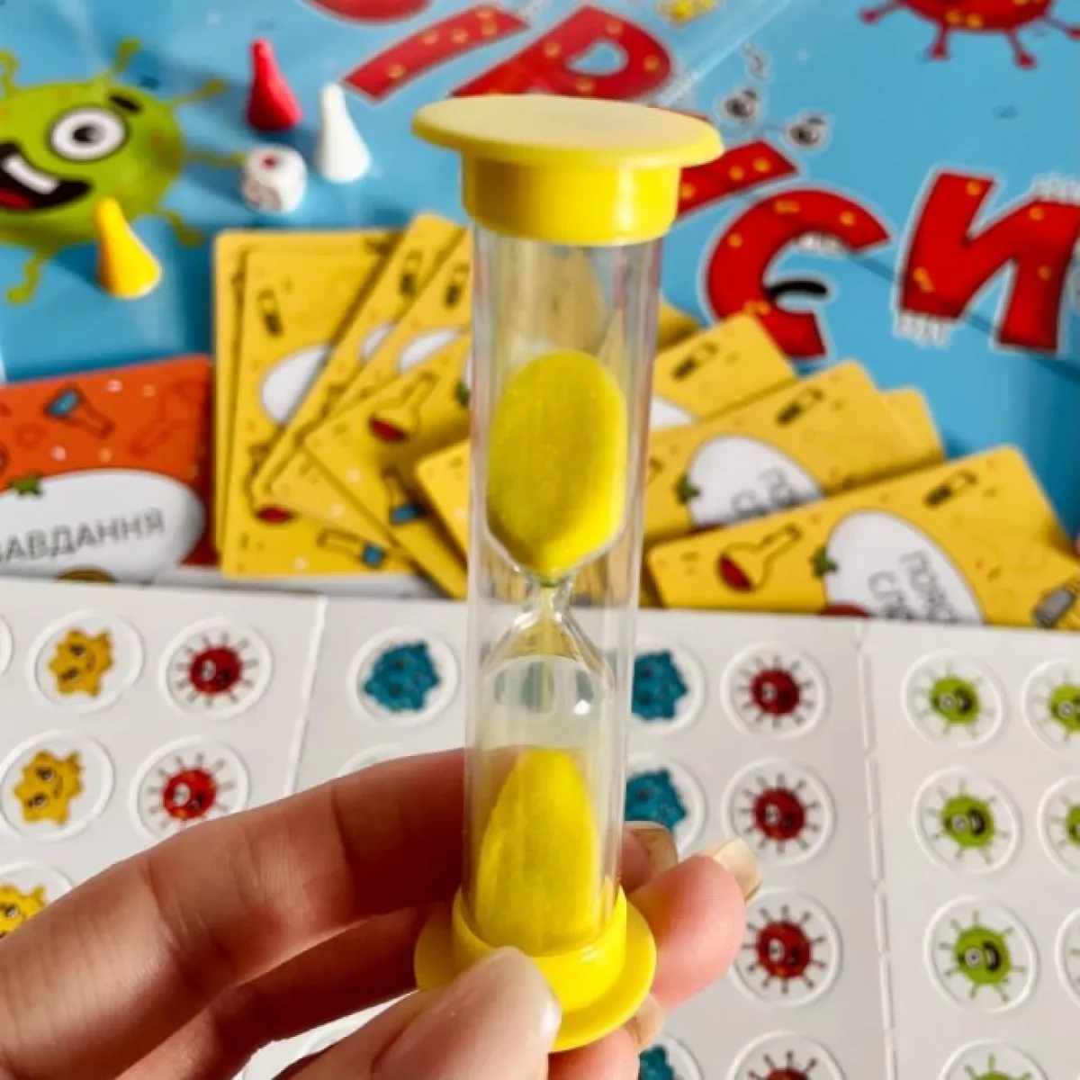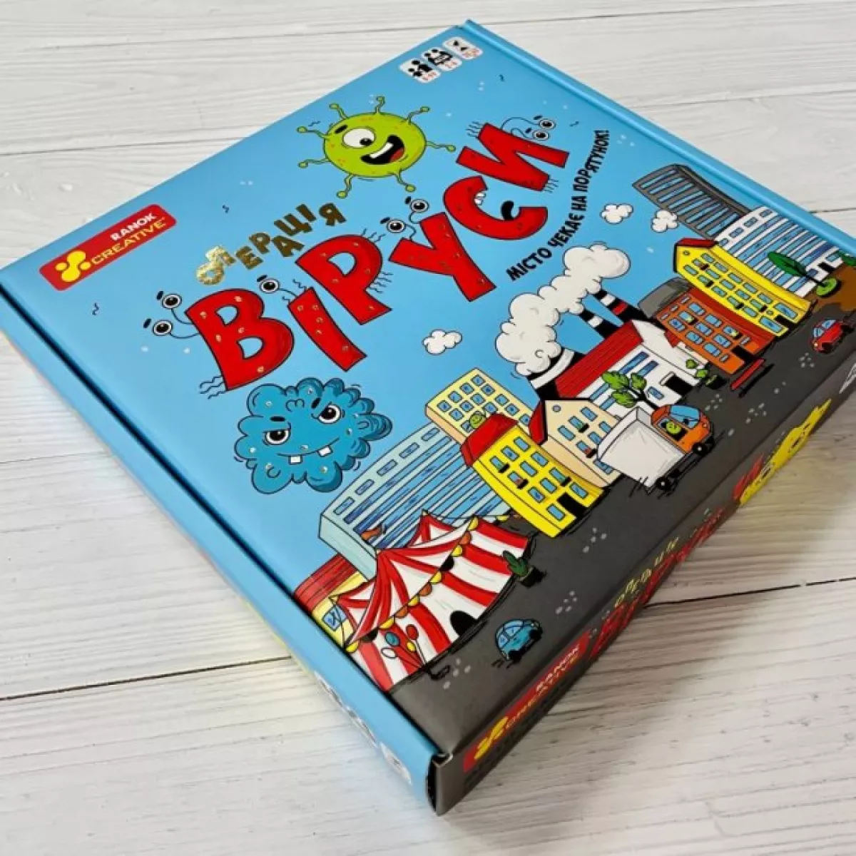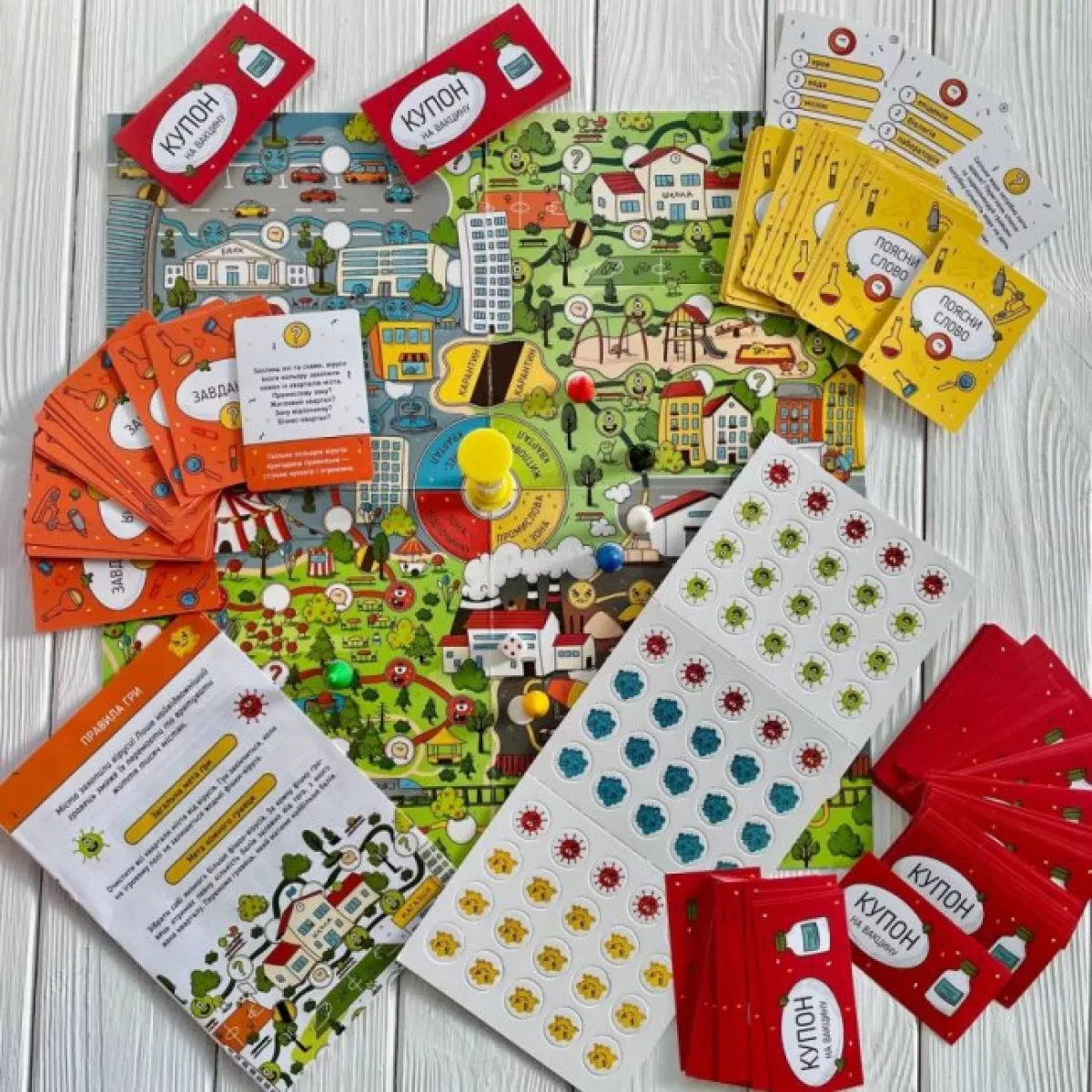 У коробці - карти-завдання,, - ігрове поле,, - фішки-віруси,, - купони на вакцину,, - правила гри, - словник наукових термінів.