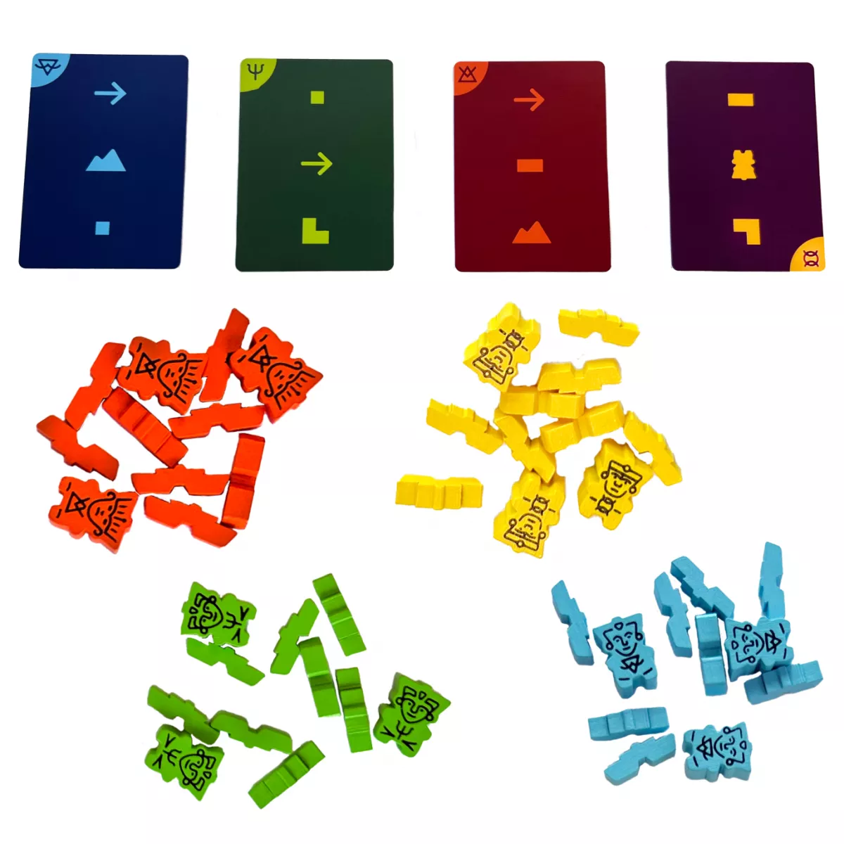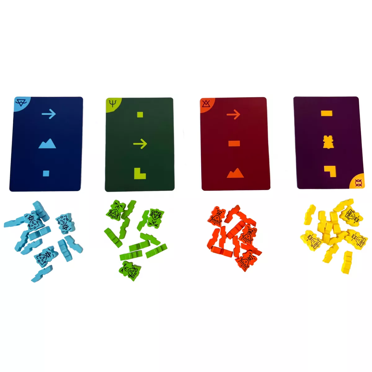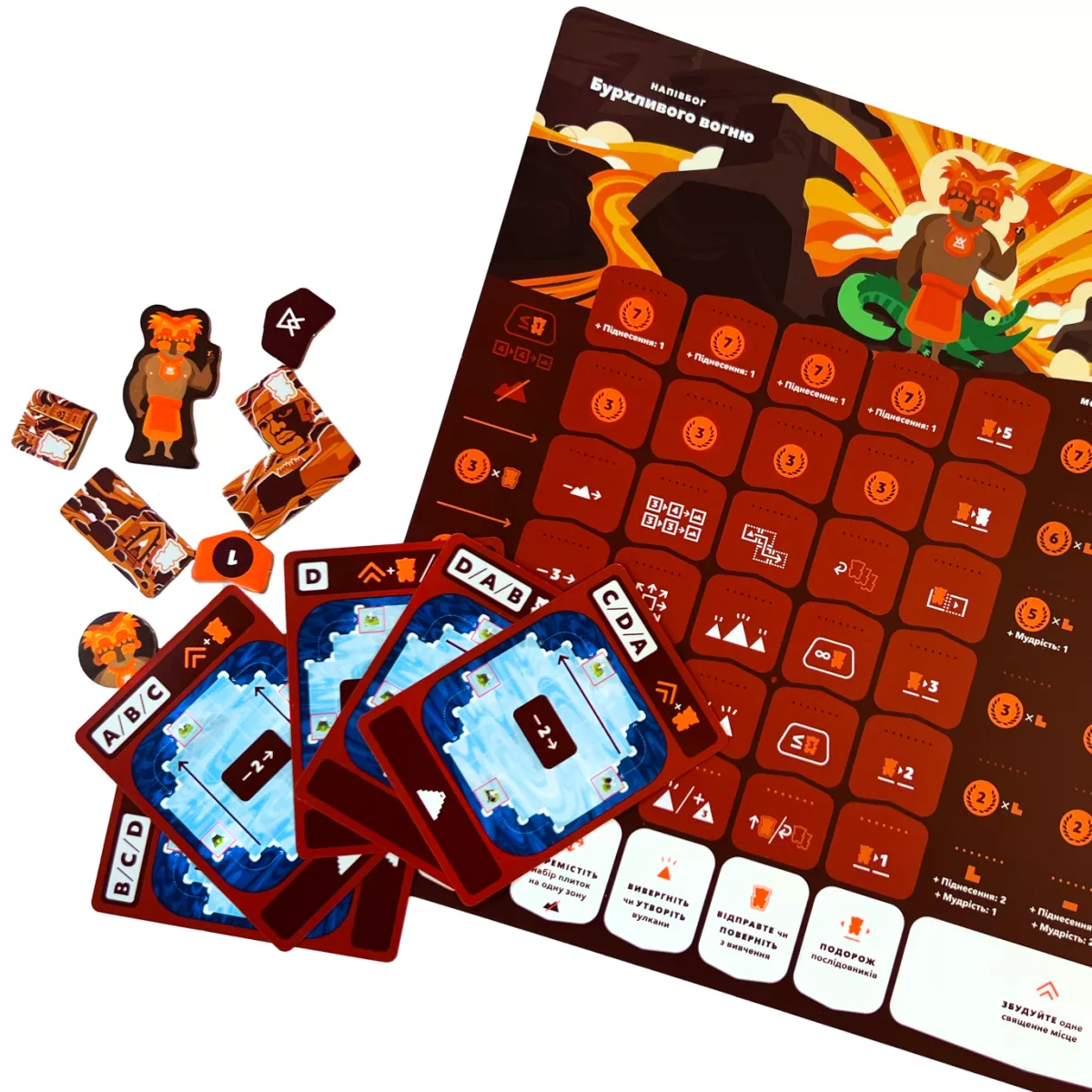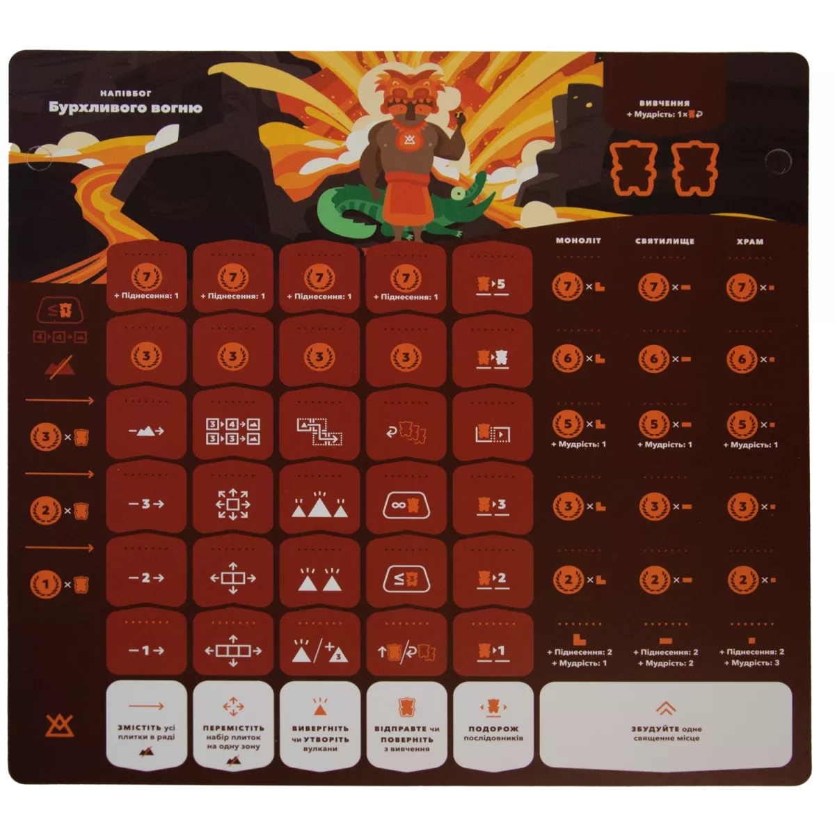 У коробці двостороннє ігрове поле, 72 плитки суходолу (48 суходіл, 12 гори, 12 острови), 48 вулканів (1-4 рівнів), 52 карти Автоми (колода на напівбога), 36 плиток священних місць (3 моноліти, 3 святилища, 3 храми на гравця), 32 послідовники (8 на гравця), 32 ліміти мудрості (8 на гравця), 4 планшети гравців, 4 фішки напівбогів (і змінні жетони), двосторонній трек піднесення, планшет очок, нефритовий ягуар (жетон останнього гравця), жетони провидінь (6 на гравця), правила гри