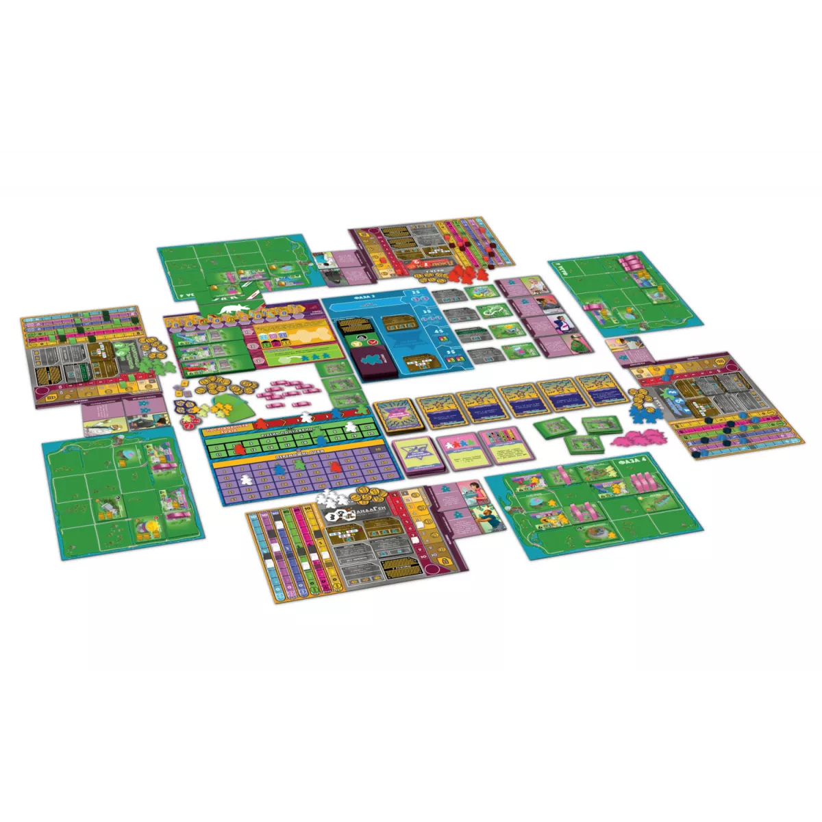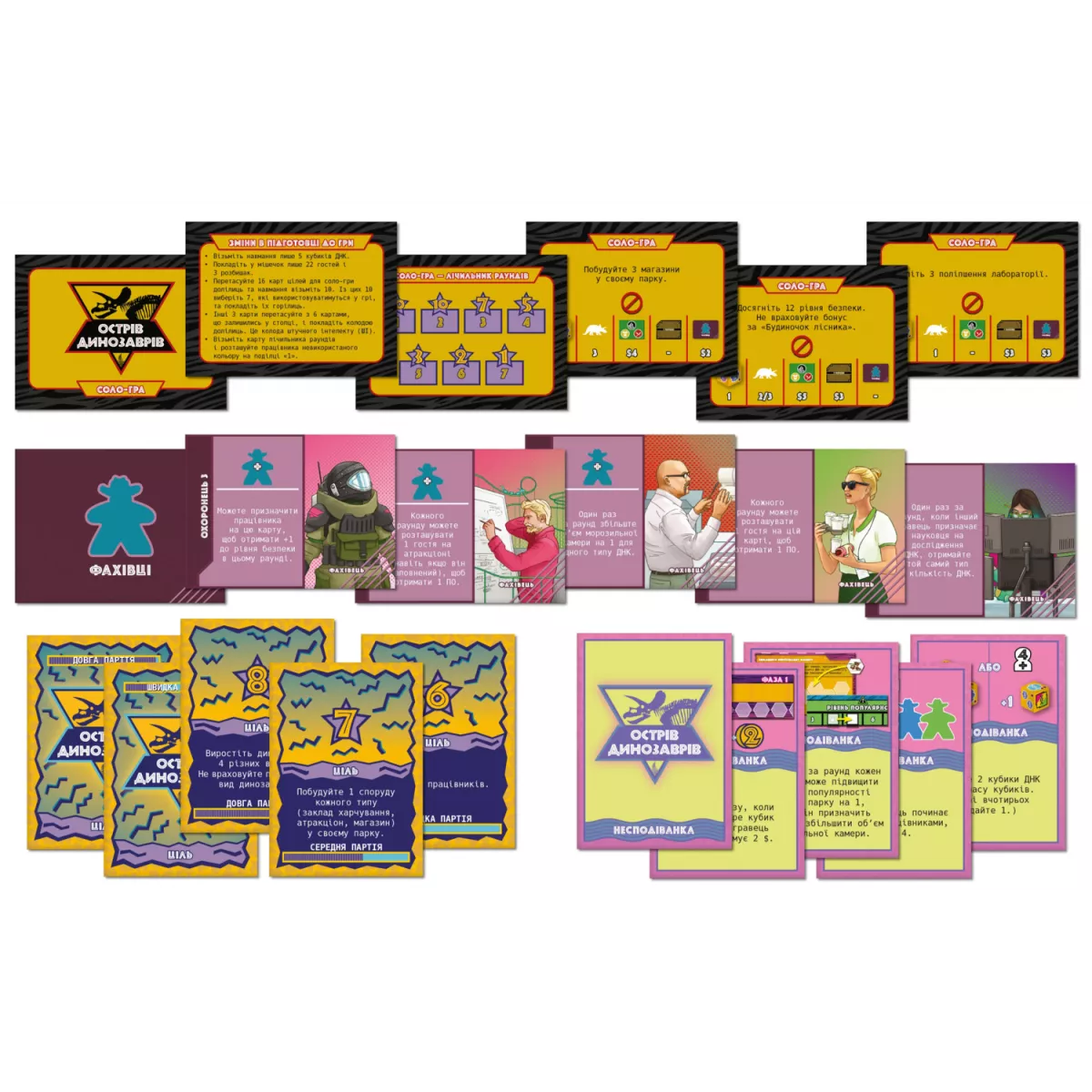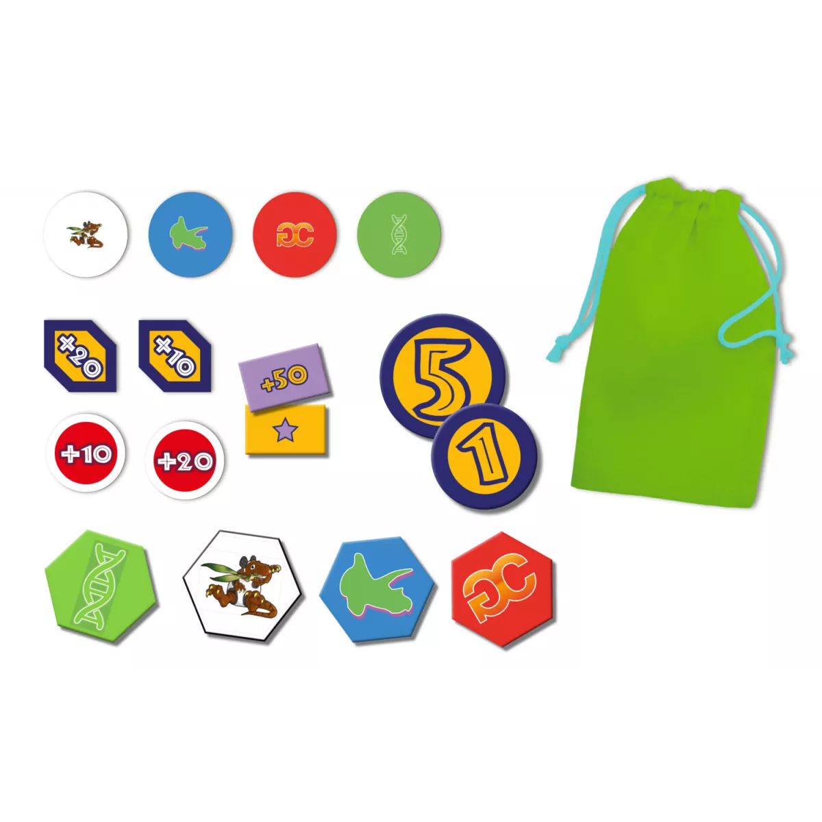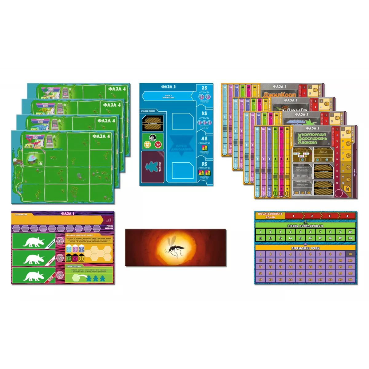 У коробці 81 жетон монет (53 по 1 $, 28 по 5 $), 80 фігурок відвідувачів (70 звичайних та 10 хуліганів), 64 кубика-маркера, 50 фігурок динозаврів, 39 карт завдань, 36 фігурок робітників, 33 плитки поліпшень лабораторії, 30 плиток споруд, 29 плиток загонів, 24 жетони корпорацій, 22 карти фахівців, 17 плиток геномів, 17 карт для одиночної гри, 12 жетонів вчених, 12 жетонів-модифікаторів, 11 карт нововведень, 10 кубиків, 4 планшети лабораторій, 4 планшети парків, планшет досліджень, планшет ринку, планшет підрахунку очок, жетон першого гравця, мішечок, бонусні жетони, правила гри