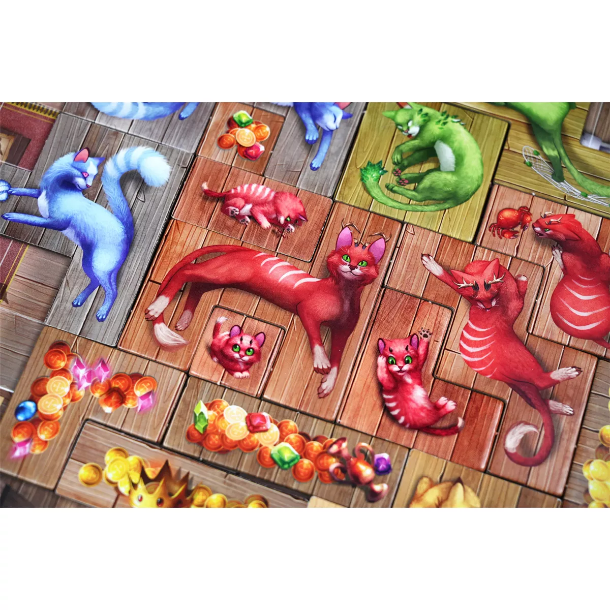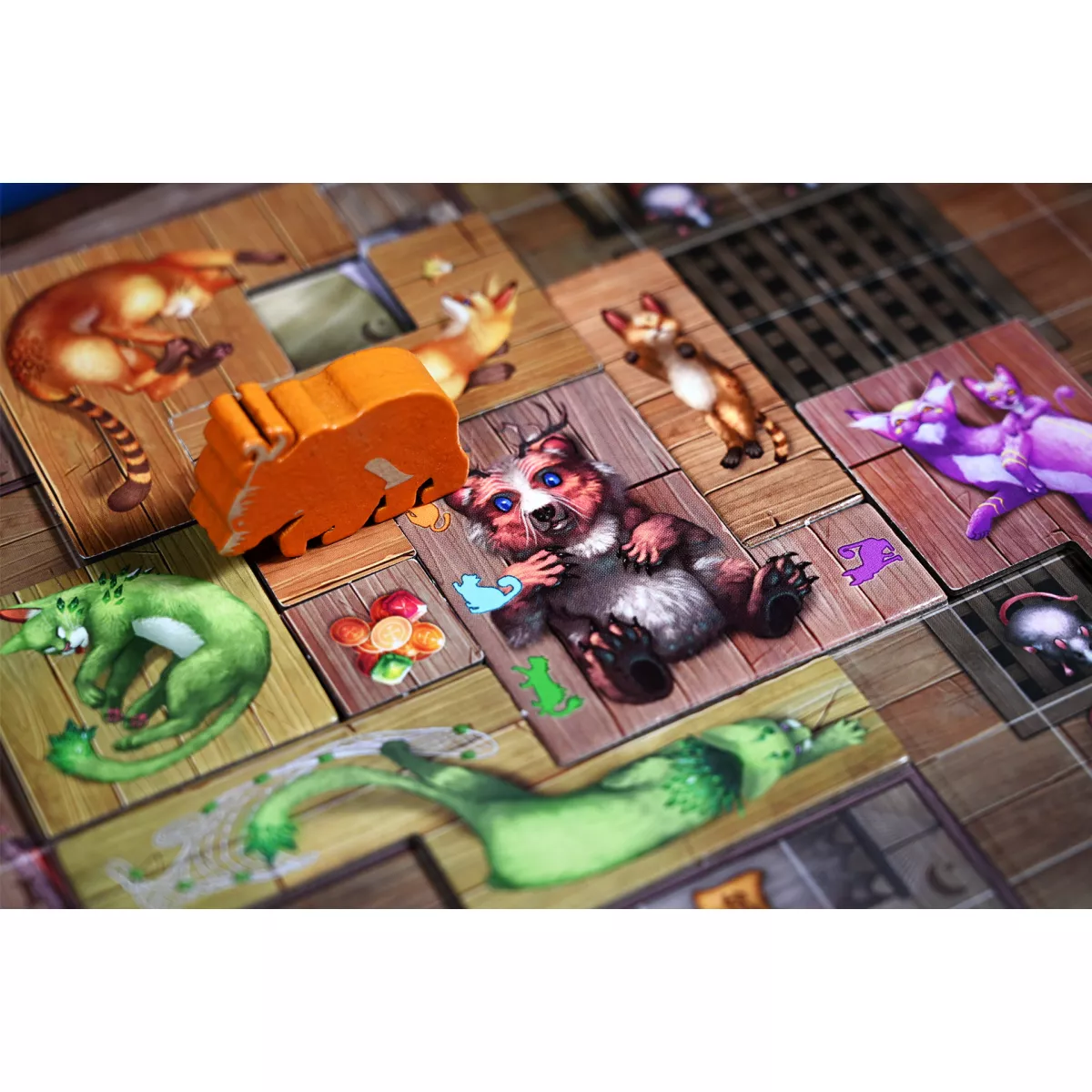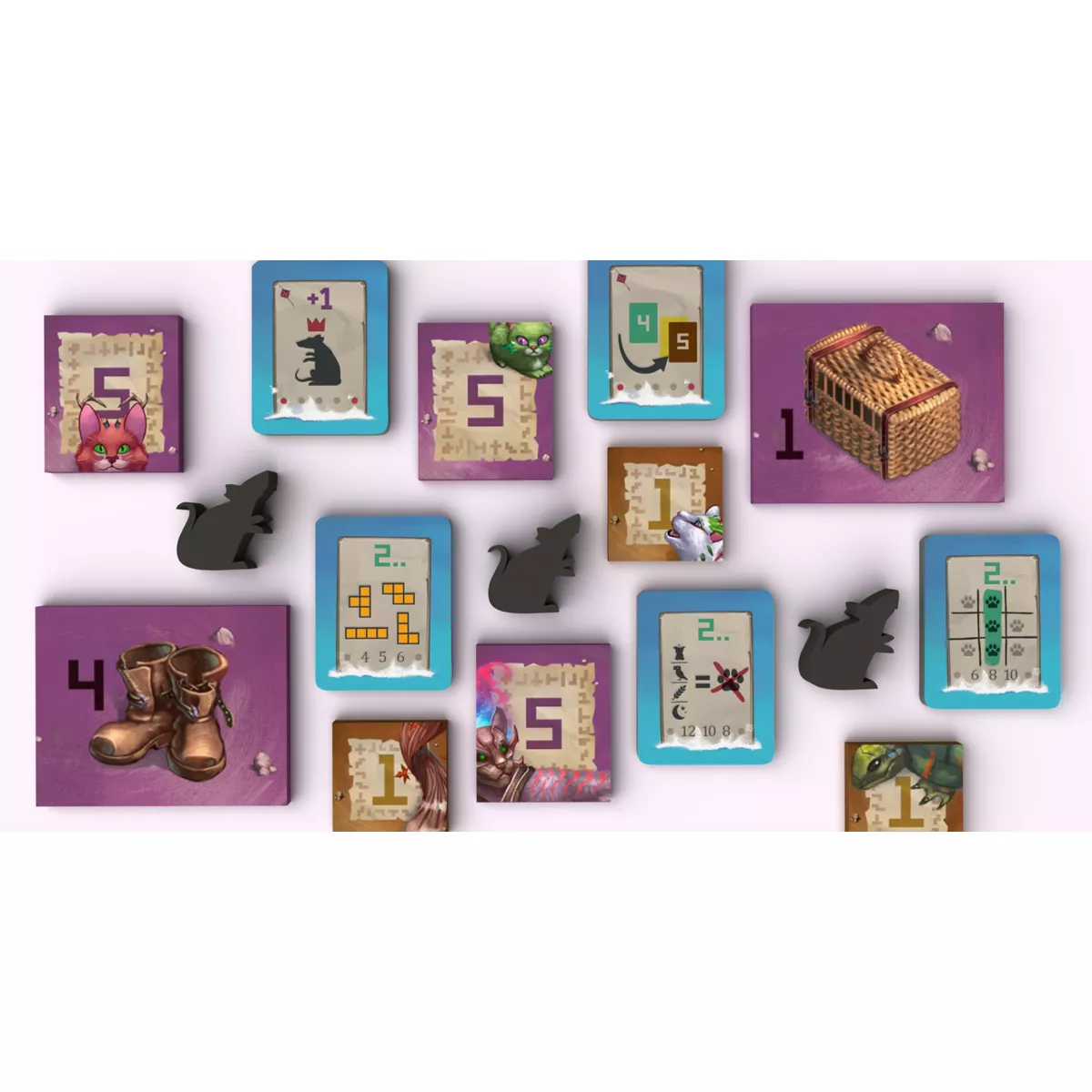 У коробці 25 фігурок звірят (по 5 кожного типу), 18 дерев’яних щурів, 20 плиток кошенят (по 4 кожного кольору) 18 плиток звірят 15 плиток подій, 1 модуль завдань (8 карт завдань), 7 карт для сімейної гри, 3 мішечки (1 для звірят, 1 для кошенят і 1 для подій), 10 жетонів уживаних кошиків 64 жетони очок (32 x «1 ПО», 32 x «5 ПО»), 2 книжечки правил (звичайна гра й сімейна гра), 1 записник для очок