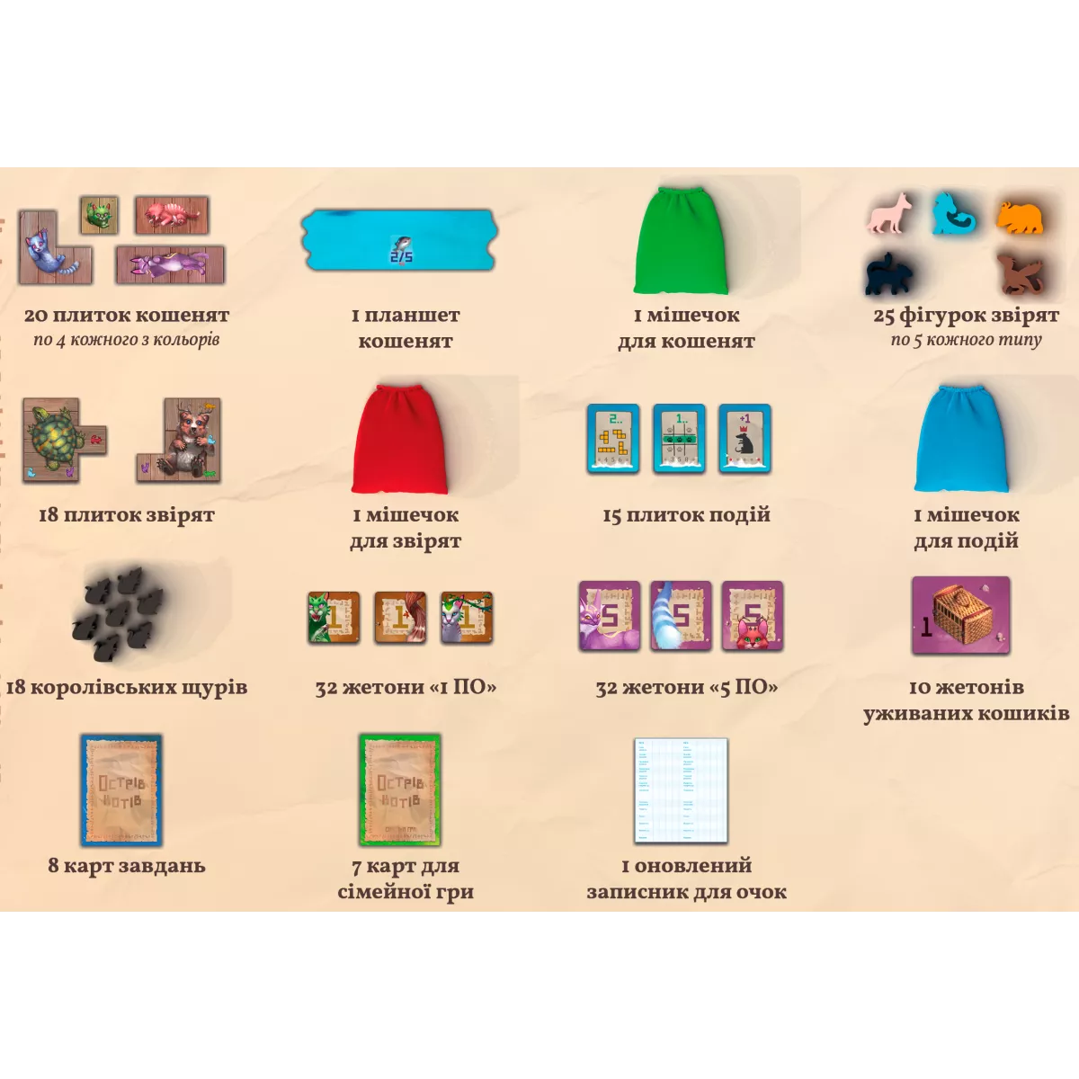 Доповнення «Острів котів: Кошенята і звірята» складається з трьох окремих модулів - «Кошенята», «Звірята» і «Події», які можна використовувати як разом, так і окремо. Також у комплекті невеликий модуль нових завдань. Якщо ви хочете врізноманітнити базову гру, розширити стратегічні можливості та спробувати нові тактики, тоді Joy наполегливо радить купити дане доповнення.