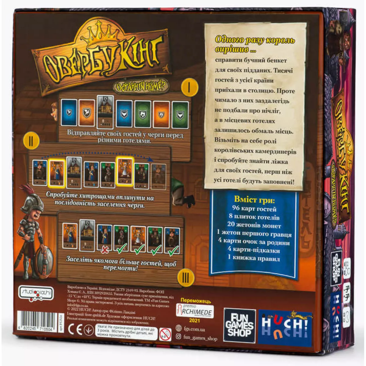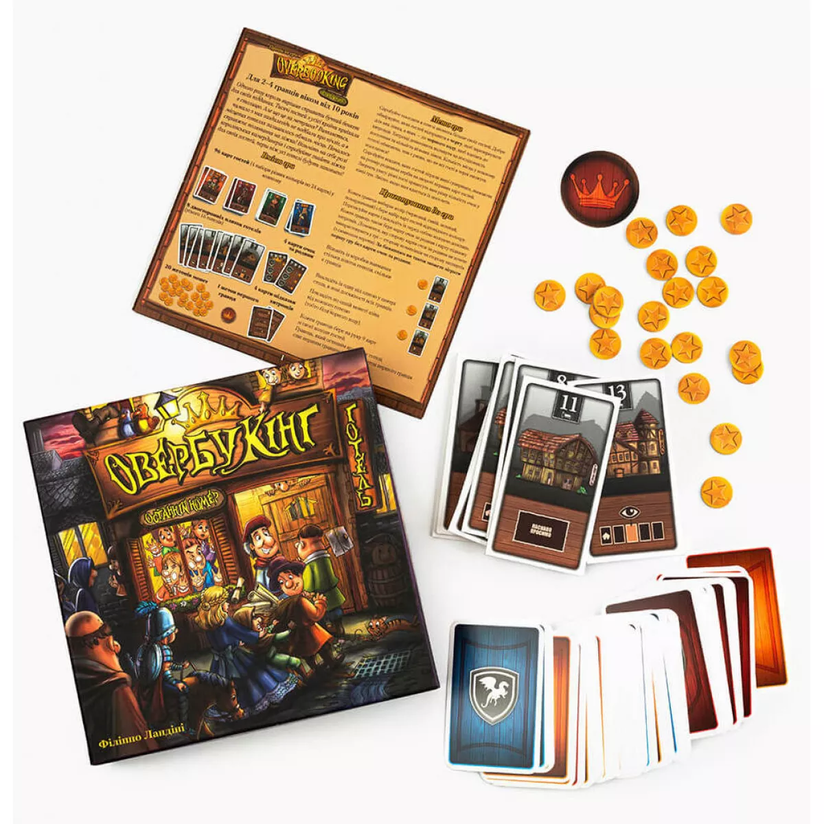 У коробці 96 карт гостей, 8 плиток готелів, 20 жетонів монет, 1 жетон першого гравця, 4 карти очок за родини, 4 карти-підказки, 1 книжка правил