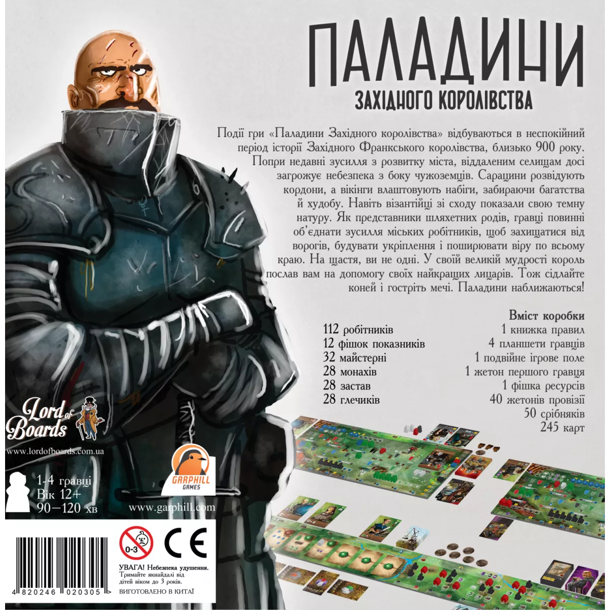Славетне Західно-Франкське королівство близько 900 років мало своїх паладинів для захисту територій від нападів сарацинів, вікінгів та інших ворогів. Ці дикуни не дають спокійно розвивати міста та поселення, забираючи всі багатства та скот. На захист своїх земель доводиться ставати благородним мужам і дамам. Об’єднайте сили міщан, аби побудувати укріплення та захиститися від постійних набігів загарбників. Та й поширити віру на всіх своїх територіях – це теж важлива справа. Користуйтеся допомогою відважних лицарів і прославляйте короля в нашій новій локалізації Паладини Західного Королівства (Paladins of the West Kingdom). Тільки один із вас заслужить милість правителя та визнання ваших заслуг перед народом. За віру та правду вступаються Паладини! У цій економічній стратегії гравці протягом семи раундів намагатимуться заробити якомога більше переможних очок. Даються вони за будівництво споруд і застав, доручення монахам і за битви з іноземними ворогами. Кожного раунду вам допомагатимуть паладини з унікальними характеристиками, а виконуватимуть різноманітні завдання робочі. Розвивайте треки сили, віри та впливу, щоби відкрити нові можливості та швидше досягти успіху. Зробимо все можливе, аби захистити свої землі Гра буде тривати 7 раундів, протягом яких і потрібно заробити якомога більше переможних балів. Стартує раунд із того, що ви обираєте собі паладина, а там й отримуєте 6 робітників. Потім усі по черзі виконують по одній дії, поки всі не спасують. Наприкінці раунду оновлюється ігрове поле, щоби розпочати новий раунд. Коли паладини та таверни вибрані (й отримані робочі), можна переходити до виконання дій. Дією тут вважається розміщення робітника чи декількох на своєму планшеті або на карті милості короля задля отримання різноманітних бонусів: ресурси, карти, переможні очки, розміщення будівель і багато іншого. Врахуйте колір робочих, які необхідні для кожної локації. Усі гравці ходять за годинниковою стрілкою, поки не спасують. Наприкінці раунду дозволяється залишити у своєму запасі до трьох робочих. Ігрове поле оновлюється, де замінюються загарбники та міщани. Гра завершується після сьомого раунду. Підрахуйте переможні очки та визначте переможця партії. А ви вірите в Паладинів? Паладини Західного Королівства – це прекрасний зразок економічної стратегії для всієї сім’ї. Тут доволі високий рівень взаємодії між вами, але прямої агресії немає. Загальний ринок міщан і загарбників змушує кожного разу міняти план своїх дій, адже хтось із опонентів може просто у вас перед носом забрати потрібну картку. Та й кожного раунду проходить вибір таверн, від якого залежить набір робітників для майбутніх дій. Отримання бонусів за монастирі та аванпости теж відбувається на загальному ігровому полі. Кожного разу доводиться ретельно продумувати свої дії, адже тут є дуже багато всього. Варіативність гри на високому рівні, що дозволяє насолоджуватися ігровим процесом знову і знову.