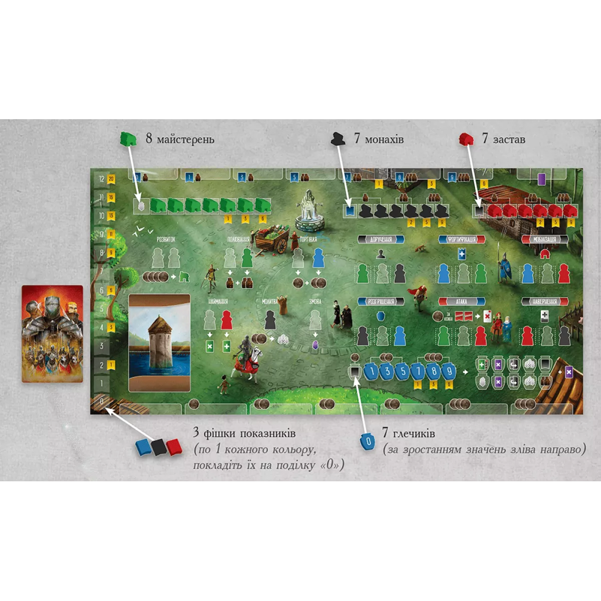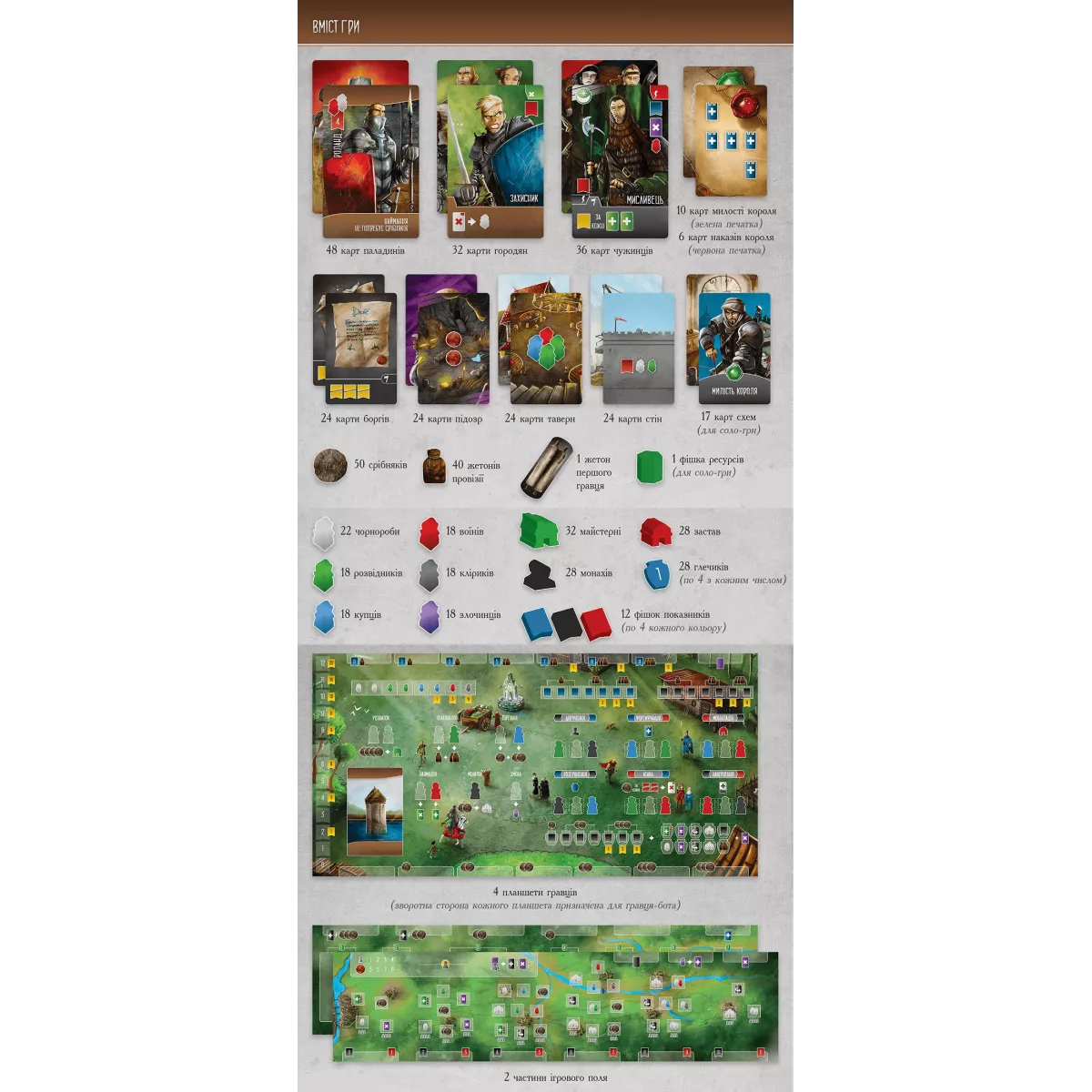 У коробці 22 фішки різноробів;, 18 фішок розвідників;, 18 фішок торговців;, 18 фішок воїнів;, 18 фішок кліриків;, 18 фішок злочинців;, 28 фішок ченців;, 32 фішки майстерень;, 28 фішок застав;, 12 фішок параметрів (по 4 кожного кольору);, 28 глечиків (по 4 кожного номіналу);, 32 карти містян;, 48 карт паладинів;, 36 карт іноземців;, 24 карти боргів;, 10 карт милості короля;, 24 карти таверн;, 24 карти підозр;, 6 карт наказів короля;, 24 карти стін;, 17 карт інтриг;, 50 жетонів срібла;, 40 жетонів припасів;, 1 жетон першого гравця;, 2 частини ігрового поля;, 4 планшети гравців;, Правила гри.