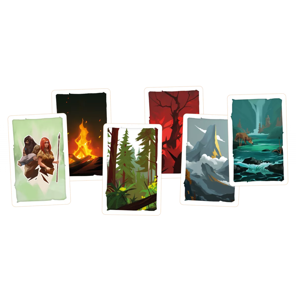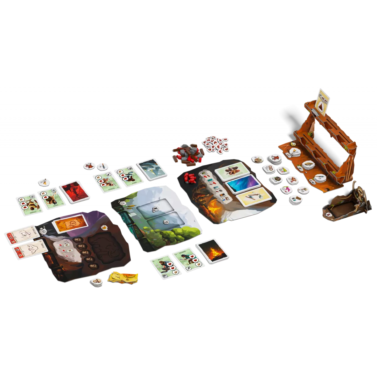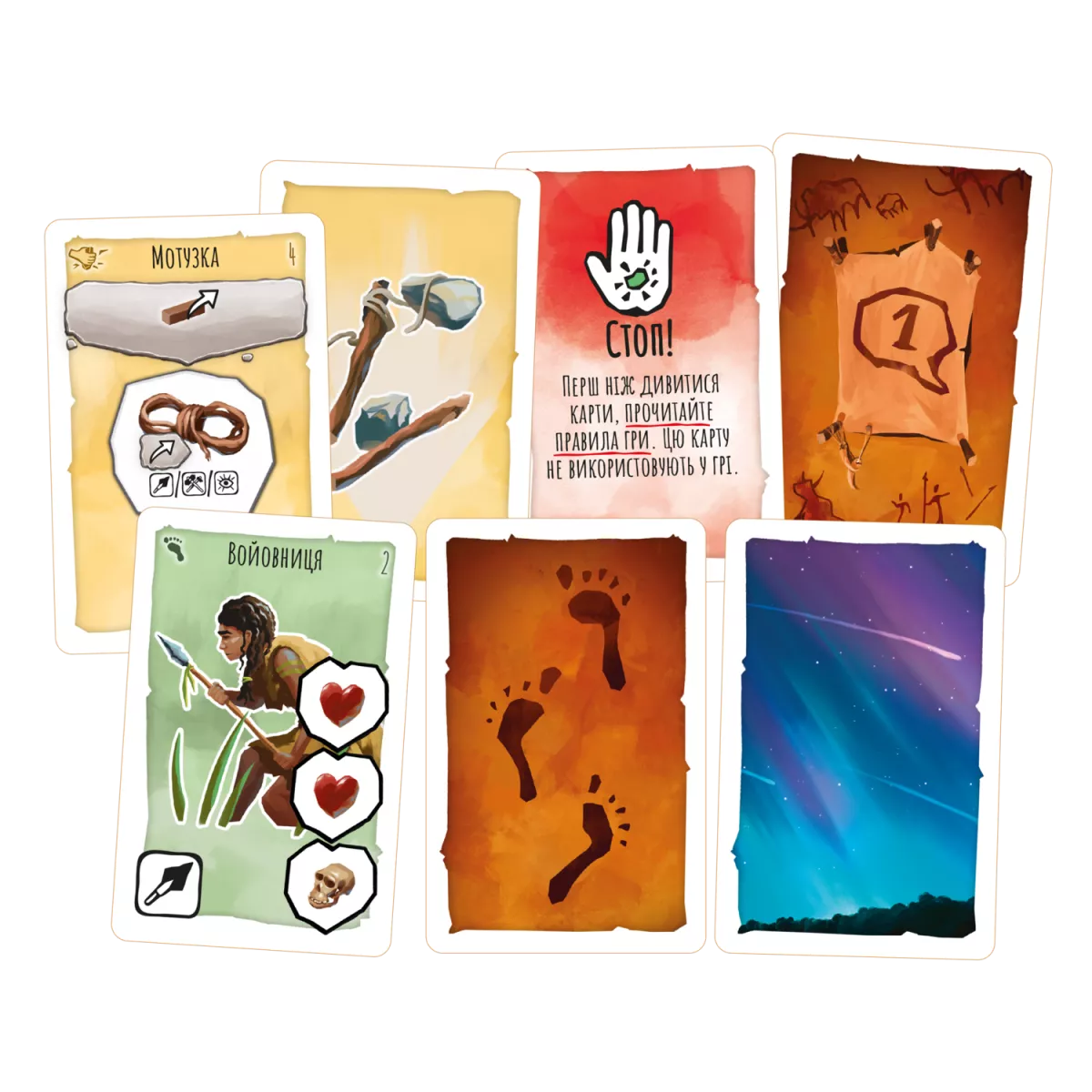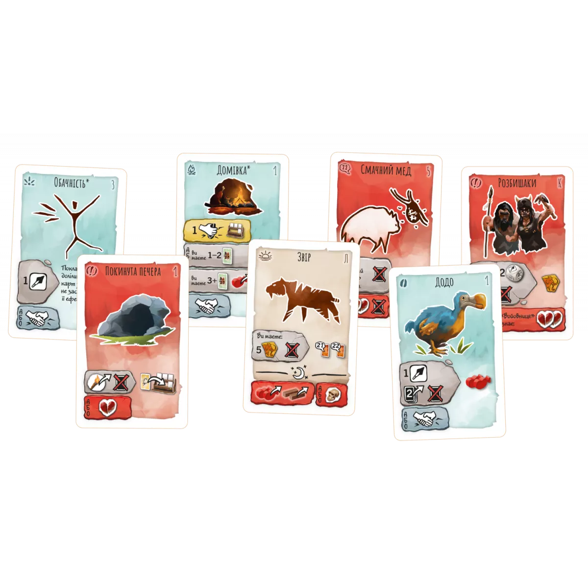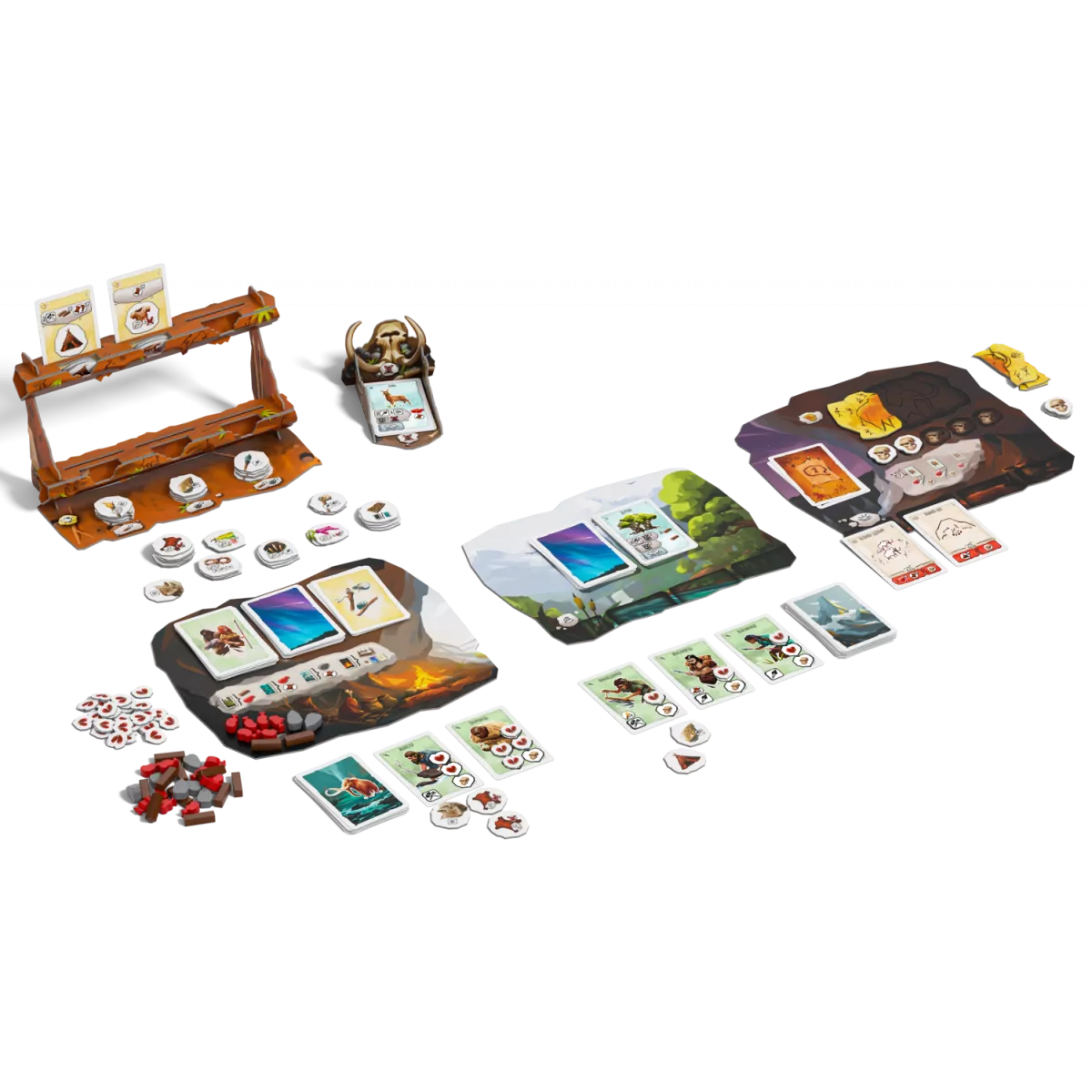 У коробці 3 планшети, 1 кладовище мамонтів, 1 майстерня, 222 карти, 40 фішок ресурсів, 48 жетонів знарядь, 40 жетонів поранень, 5 жетонів черепів, 5 переможних жетонів, 2 кубики, правила гри