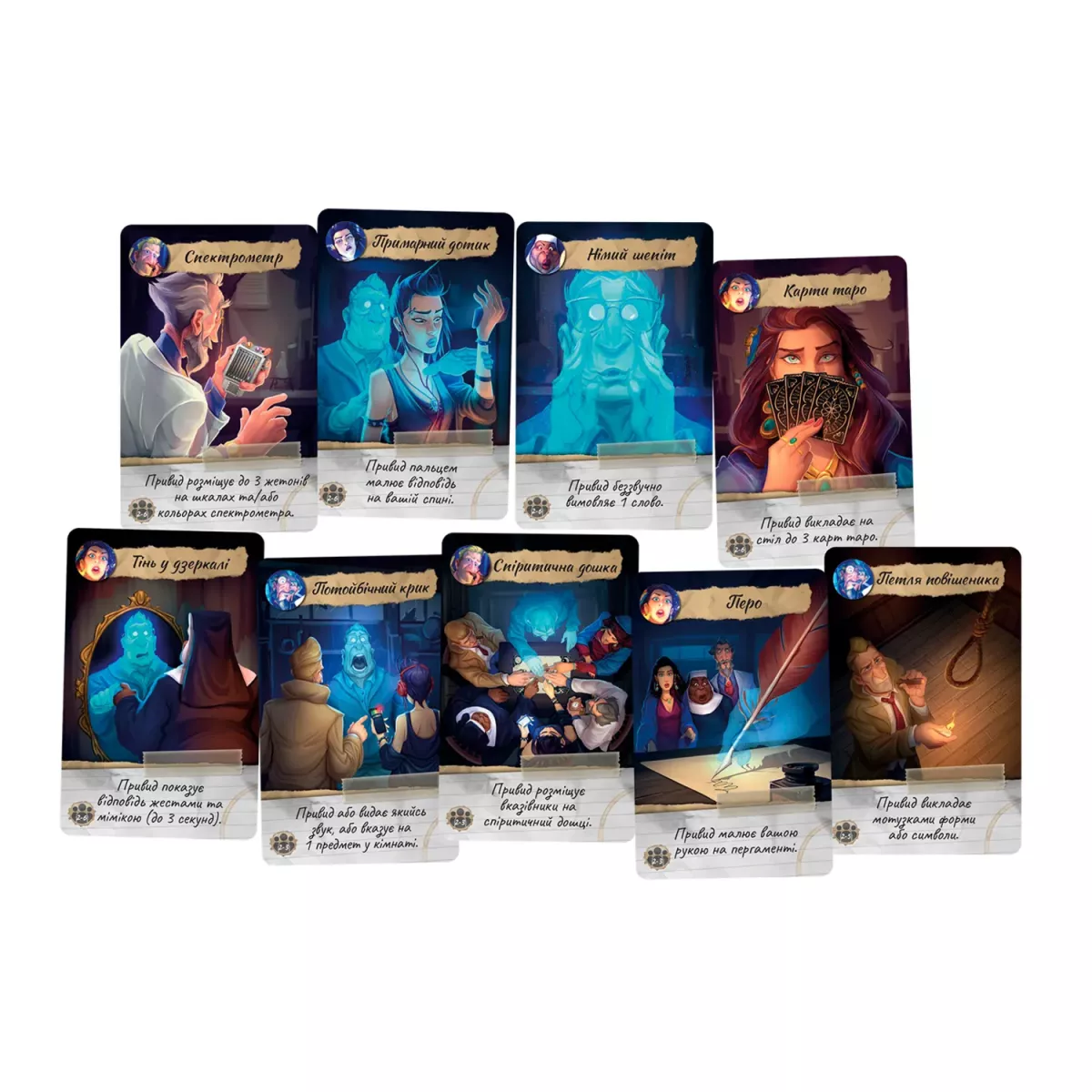 • Роль Привида: Гравець-Привид знає всю правду про вбивство – хто був жертвою, хто вбивця, де сталося злочин, що стало знаряддям вбивства та мотив. Його завдання – передати цю інформацію детективам, використовуючи лише доступні паранормальні методи. Привид не може говорити, тому йому доведеться проявити максимальну винахідливість, малюючи на спіритичній дошці, передаючи підказки через карти Таро, маніпулюючи інтерактивними картами чи навіть використовуючи мотузки для вузлів палача. Це роль, що вимагає творчості та тонкого розуміння того, як інші гравці інтерпретують сигнали.