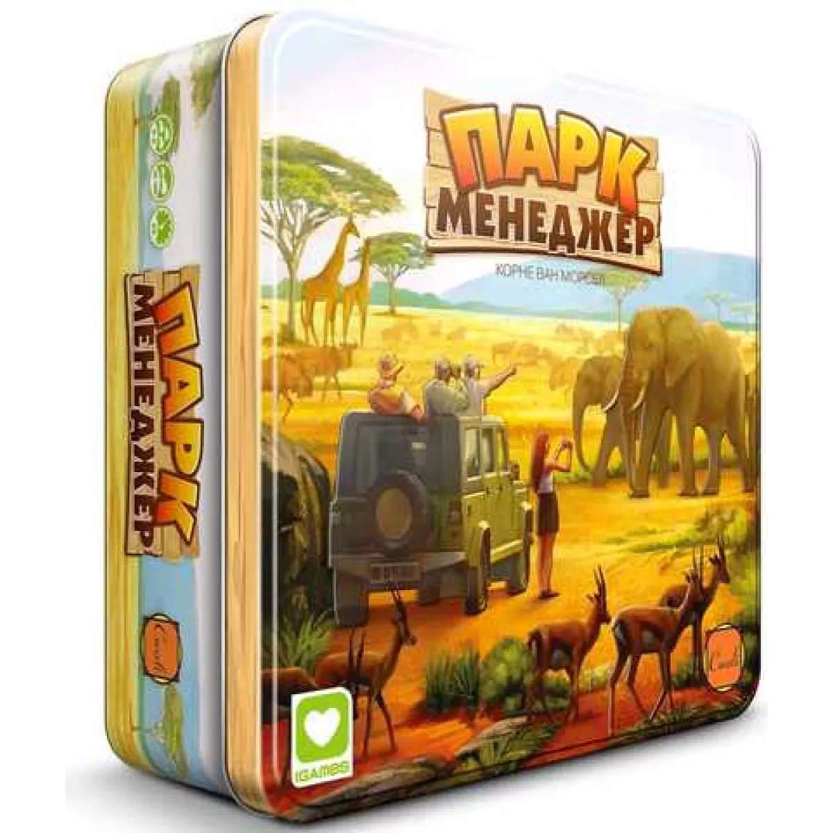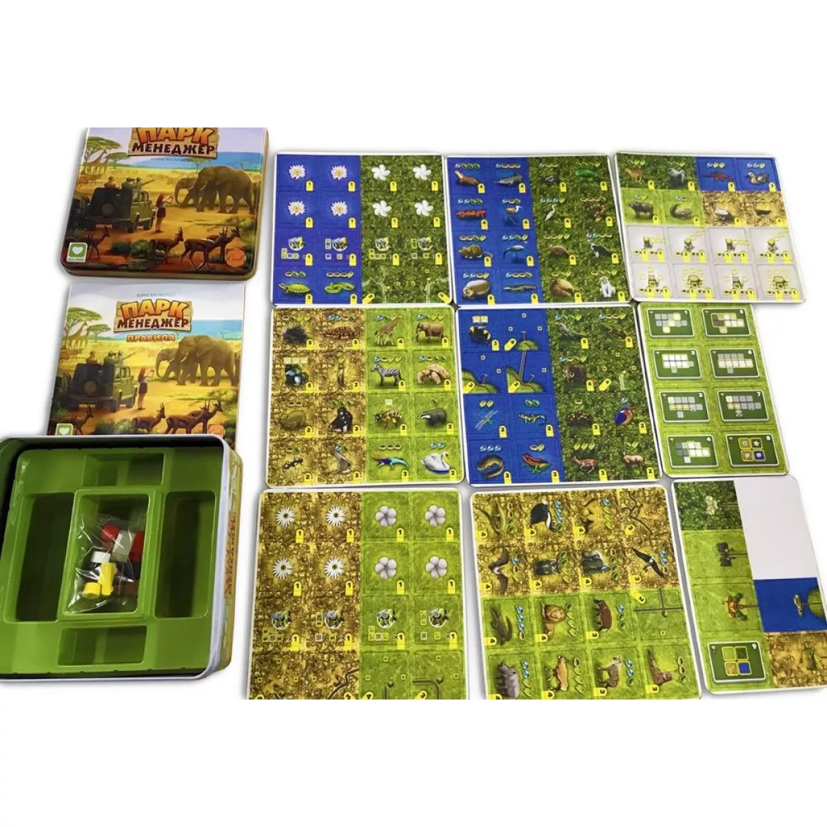 Парк Менеджер - створіть власний природний оазис Ви ніколи не були у справжньому національному парку? Або хочете взяти участь в створенні власного мальовничого куточка для диких створінь? Мене звуть Лорд «володар настільних ігор» і я пропоную вам побудувати справжній рай на землі, де співіснують тварини і люди. Прямо зараз беріть свою форму менеджера, і ми почнемо освоювати нові території. Основна мета - побудувати величний парк, де житимуть зебри, шимпанзе, леви, крокодили, дикі кабани. Але для кожного виду повинні бути створені всі умови, наближені до життя в дикій природі. І саме тут починається найцікавіше! Які правила? 1. Кожен гравець розміщує в'їзд в парк перед собою на столі. 2. Помістіть поле для рахування очок в центр столу. 3. Поставте фішки для переможних очок на значення «0» на поле для рахування очок. 4. Перетасуйте всі частини парку і складіть зовнішньою стороною вгору стопкою поруч. 5. Перемішайте 9 завдань і викладіть 3 з них (по 1-му для кожного року) на спеціально позначеному місці на поле для підрахунку очок. 6. Виберіть першого гравця. Хід передаватиметься за годинниковою стрілкою. Можливості Парк Менеджер безмежні • Можливо вибрати необхідну ділянку під забудови парку. • Припаркувати свій джип на порожнє місце. • Можна додати свою частину парку на ринок. • Приєднувати додаткову частини до основного парку. • Брати участь в щорічному змаганні. • Робити ландшафт більш мальовничим і отримувати бонусні бали. • Різноманітність флори. Поповнюйте парк новими тваринами і робіть його більш привабливим для туристів. Але пам'ятайте, для тварин повинні бути створені всі умови!