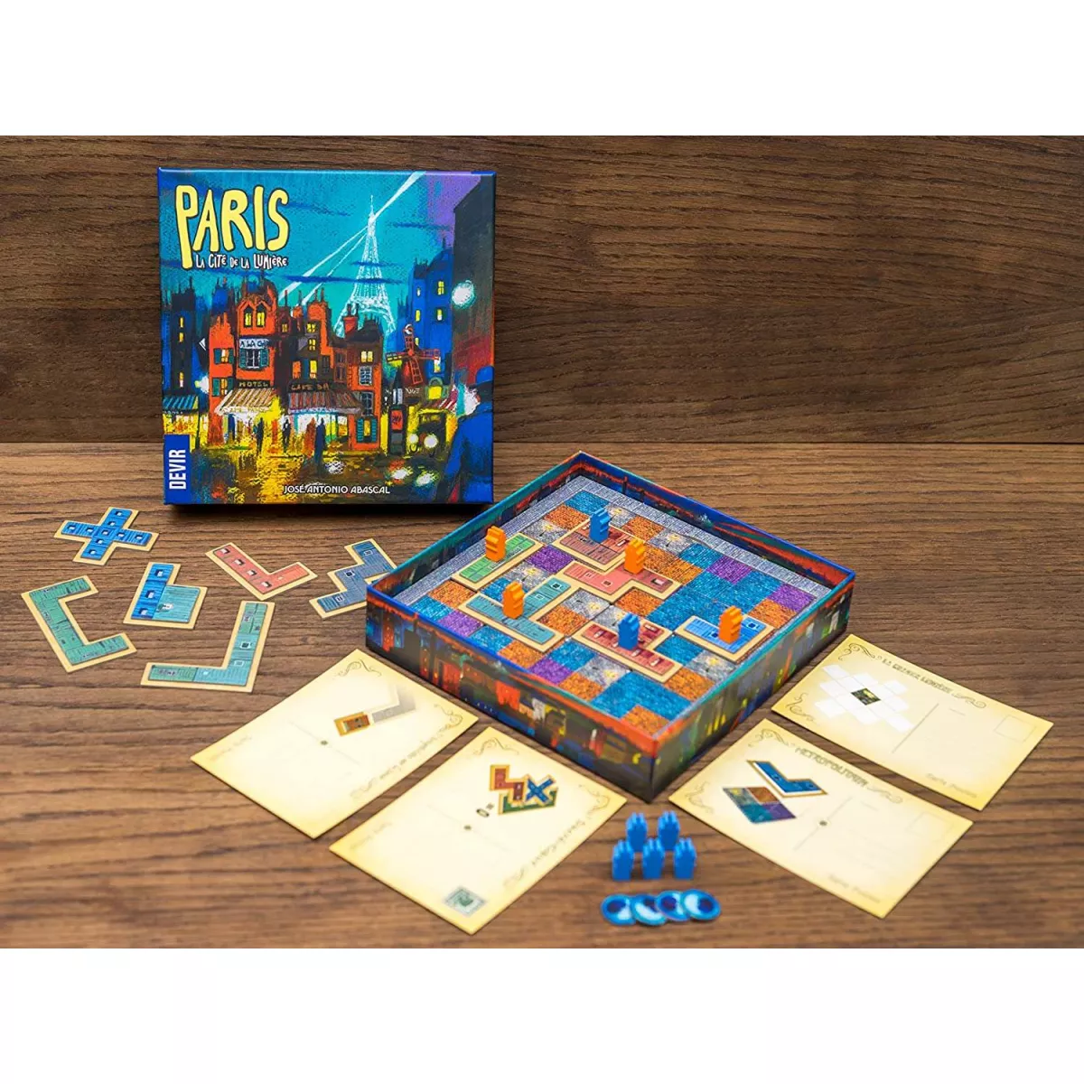 Знаєте чому затишний Париж із давніх-давен називають Містом вогнів? У який би час ви туди не потрапили, ледь не кожна вуличка буде яскраво освітлена. До 1889 року цим займалися гасові ліхтарі, але потім їх замінили електричні стовпи. Самі розумієте, наскільки це зручно та економно в порівнянні з величезними витратами гасу. Ну що, ви готові надихати красою вулиць туристів у настільній грі Париж: Місто вогнів? Аби нічого не згоріло випадково Ласкаво просимо до настільної гри Париж: Місто вогнів. Це досить цікава стратегія із механікою викладання поліміношних тайлів на ігрове поле. Воно тут, до речі, розміщується в коробці, що доволі зручно. Брати участь у партії може лише два гравці, тож дуель на вас очікує справді захоплива. Кожен учасник на початку партії отримує 8 квадратів бруківки, а також 7 димарів свого кольору та 4 жетони дій. Визначте того з вас, хто ходитиме першим, після чого можна розпочинати гру. Кожна партія поділяється на 2 етапи. Під час першого ви будете розміщувати бруківку на ігрове поле, а також набирати собі поліміношні будівлі на майбутнє. Дозволяється виконувати тільки одну дію з двох у свій хід. Тайли будівель можуть складатися з декількох елементів: квадратів вашого кольору чи кольору суперника, нейтрального кольору або просто з ліхтарями. Перший етап одразу ж закінчується, як тільки вся бруківка буде розміщена на ігровому полі. У другому етапі вже настає пора розміщувати раніше отримані будівлі на ігровому полі. Ставити їх потрібно так, щоби вони лежали саме на ваших територіях, ще й максимально були оточені ліхтарями. Саме це тут приносить найбільше переможних очок. Але є і другий варіант дії, який можна використати на цьому етапі. На столі будуть розміщені спеціальні листівки з одноразовими потужними властивостями. Кожен учасник матиме можливість скористатися чотирма такими. Коли більше будівель розміщувати немає можливостей і всі листівки були використані, наступає кінець гри. Підрахуйте переможні очки та визначте переможця партії. Буде яскраво! Париж: Місто вогнів – гра з досить простими правилами, але надзвичайно цікавим ігровим процесом. Кожного разу розташування ваших квадратів і квадратів суперника на ігровому полі буде унікальним. Та й використання всіх листівок серйозно урізноманітнює гру. І що дійсно важливо – кожне рішення тут залежить саме від вас і вашого опонента!
