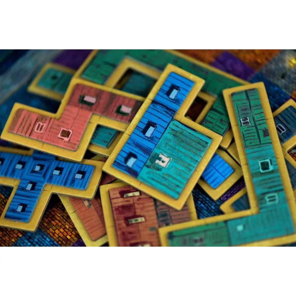 У коробці Поле (вбудоване в коробку); , 16 плиток бруківки; , 12 картонних будівель; , 14 дерев'яних димоходів; , 2 картонні фігурки персонажів; , 7 плиток особливих предметів; , 8 жетонів дій; , 12 листівок дій; , Правила гри