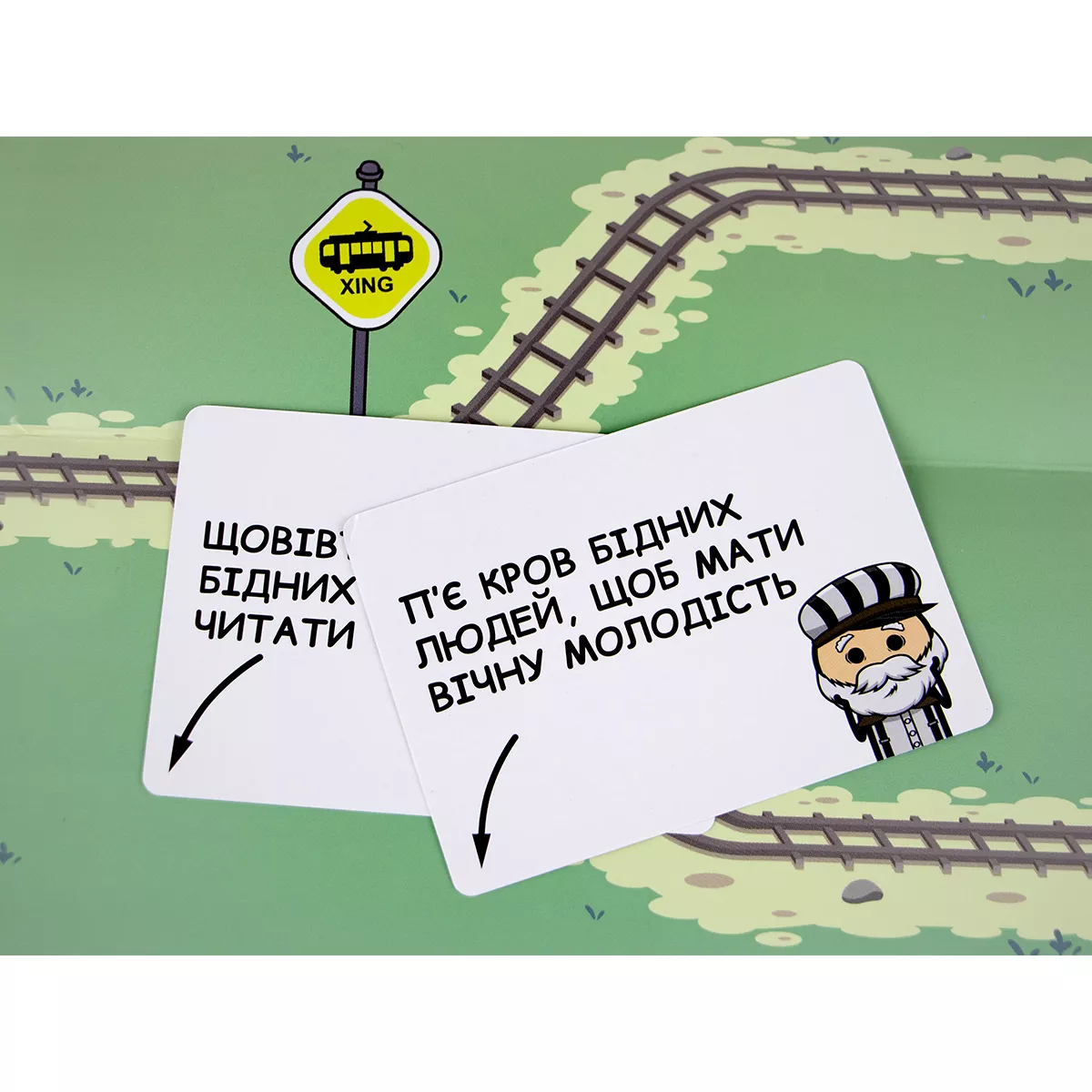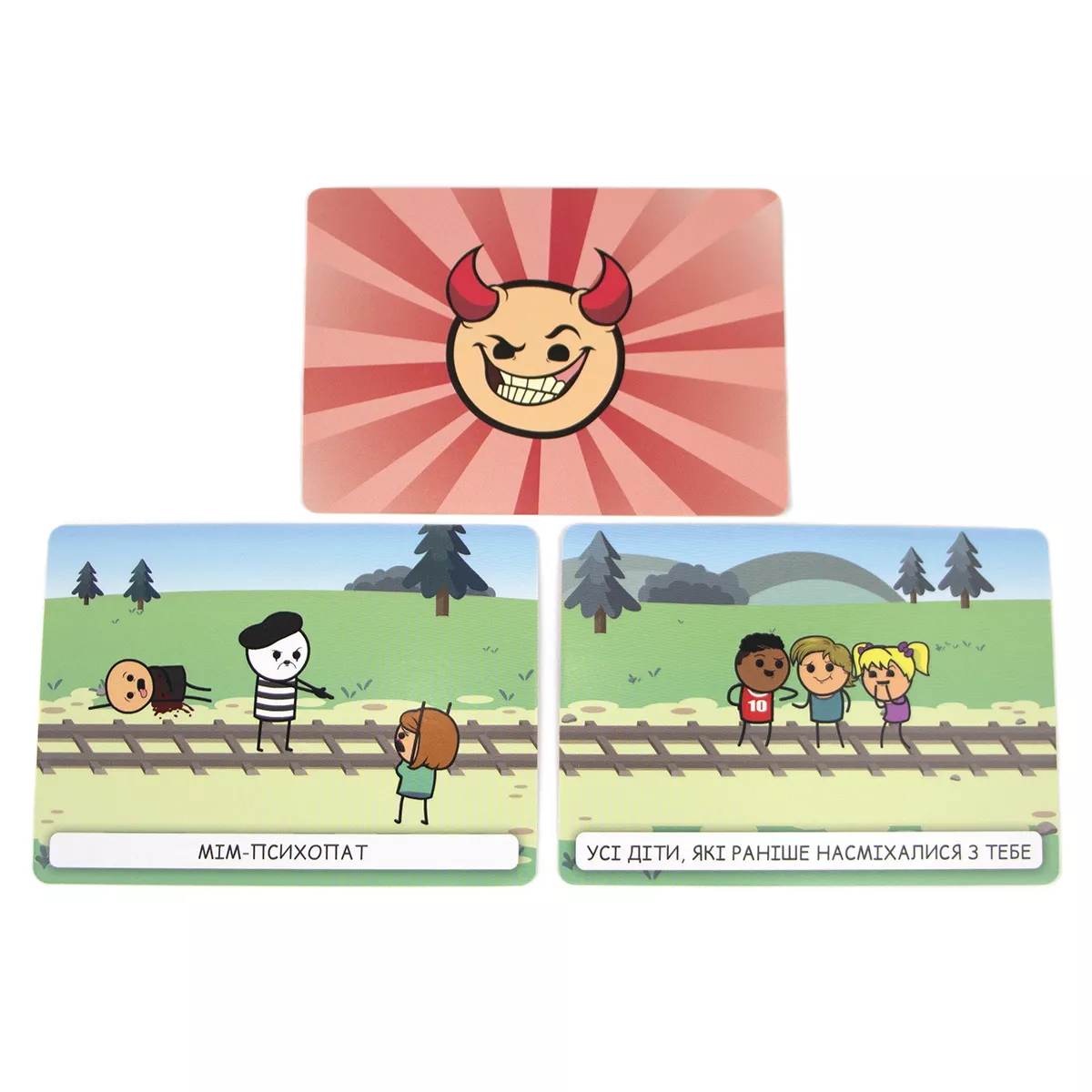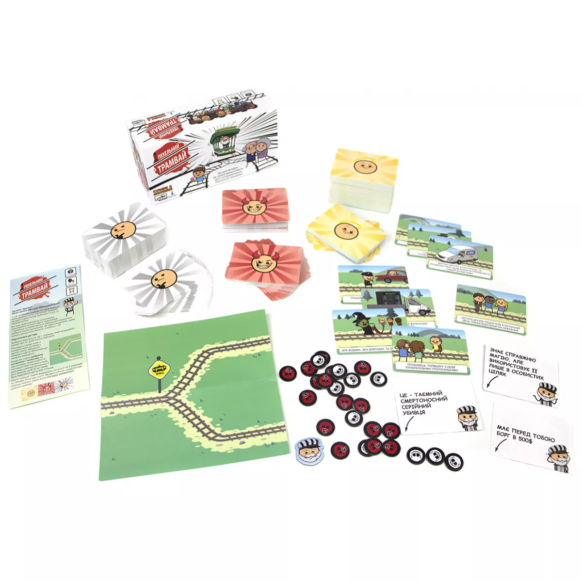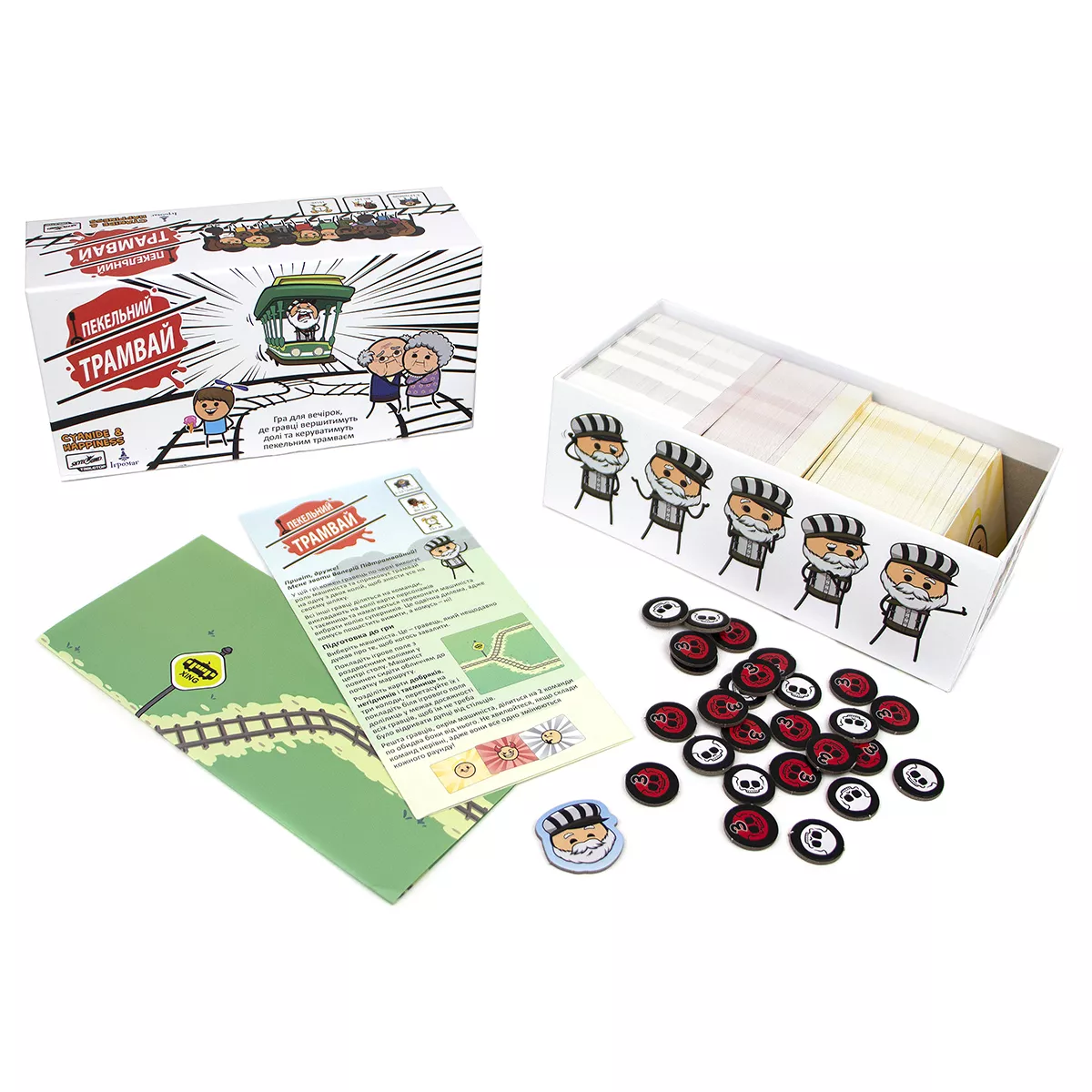 Увага! Гра не має на меті пропаганду насильства, ігор на трамвайних коліях, але точно принесе багато веселощів, чорного гумору і насильства, притаманних коміксам «Ціанід та щастя». Відомий вислів «не трамвай, об’їде!» є досить зручним у більшості випадків, окрім одного… А якщо таки трамвай? Виходить, об’їхати перешкоду нема як! Хіба що є розвилка колій і можна екстренно звернути на іншу дорогу. Головне, аби там не опинилася ще серйозніша перешкода. Саме гра Пекельний Трамвай поставить кожного з гравців перед «дилемою вагонетки»: куди поїхати, аби світ отримав найменше шкоди? А що ж буде, якщо в цю дилему додати ще й чорного гумору всім відомих «Ціанід та щастя»? (якщо ці витвори ще не знайомі, бігоменько отримувати новий досвід!) Ох, вийде просто пекельна суміш жартів, дебатів та гарного настрою, який точно не залишить всіх гравців ще довго! Про що ж гра? Кожен з гравців по черзі стає водієм того самого трамваю, якому доведеться зробити вибір: на яку колію звернути? Інші гравці діляться на дві команди, кожна з яких повинна переконати машиніста відправитися до їх суперників, аби здобути перемогу в раунді. Команда отримує три карти добра, одну з яких викладає собі на колію. Це може бути як діти, що вибігли на колії, так і лось, занесений до Червоної книги. А також обирають одну з карт зла, аби покласти її на колію супротивника. Якщо поруч із тим же лосем стоїть зомбі, який почне епідемію, то може Червона книга того не вартує?.. Чи таки вартує? І, здавалося б, тепер саме час переконувати машиніста обрати вірний шлях, але у команд залишився ще один козир у рукаві – карта таємниць! Саме ці карти можуть перевернути ситуацію до гори дриґом, розкриваючи деякі факти про тих, хто знаходиться на коліях. Як вплине на рішення машиніста те, що мила дівчинка Марічка, яка випадково вибігла бавитися на колію, насправді є реінкарнацією Гітлера та хоче захопити увесь світ? Марічко-Марічко, як так, ми ж вірили тобі! Якщо ви вже вигадуєте, які каверзи будете підкидати на колію супротивника, або ж подумки обираєте, куди б спрямувати ваш трамвай, - купуйте гру Пекельний Трамвай, кличте друзів на вечірку та будьте готові до справжнього чорного-пречорного гумору! Якщо ж далеко відходити від теми колій не хочеться, але давити колесами дітей, бабусь та мімів-маніяків поки що не мрія життя, краще спокійненько побудуйте власну залізнодорожну імперію на дикому заході у грі Pioneer Rails.