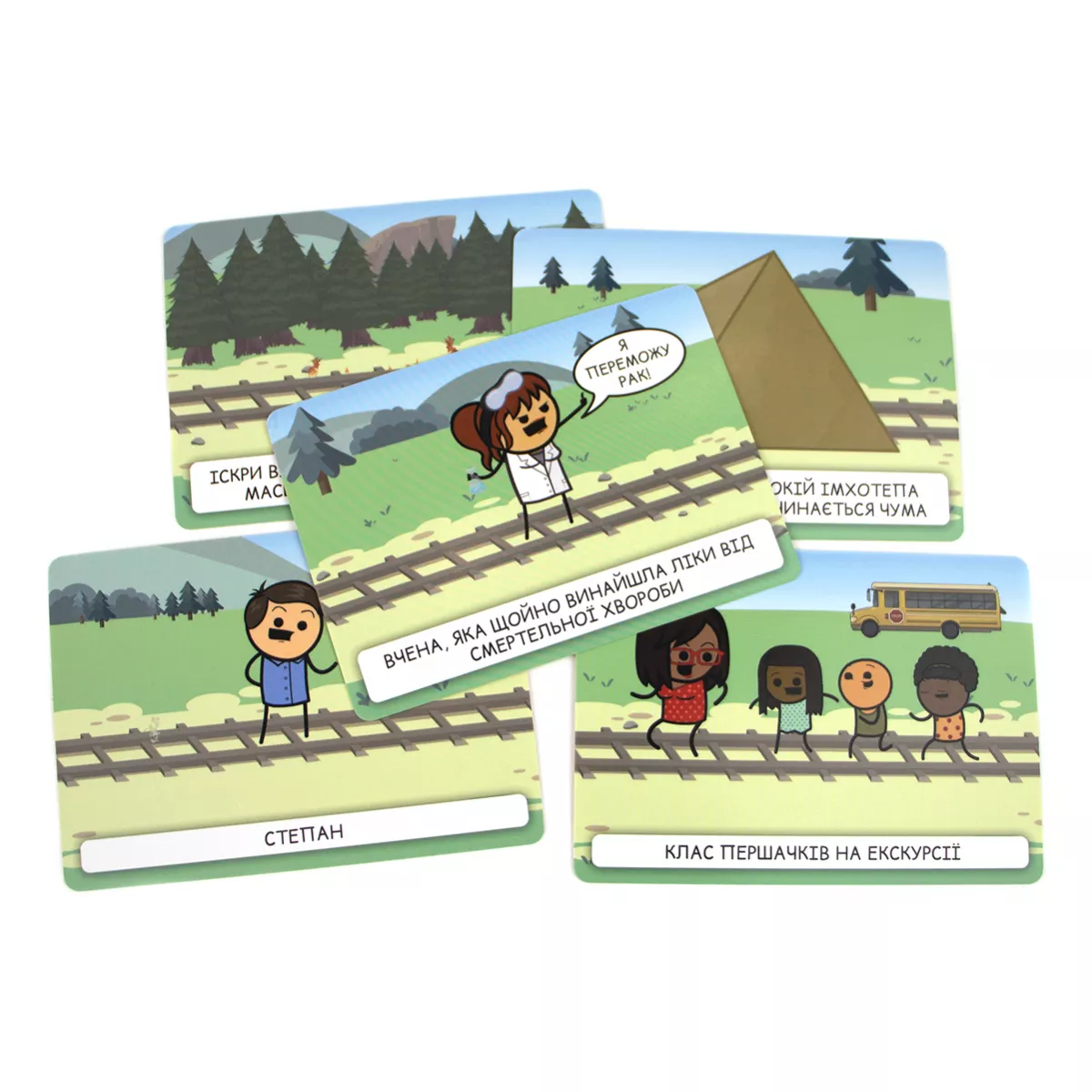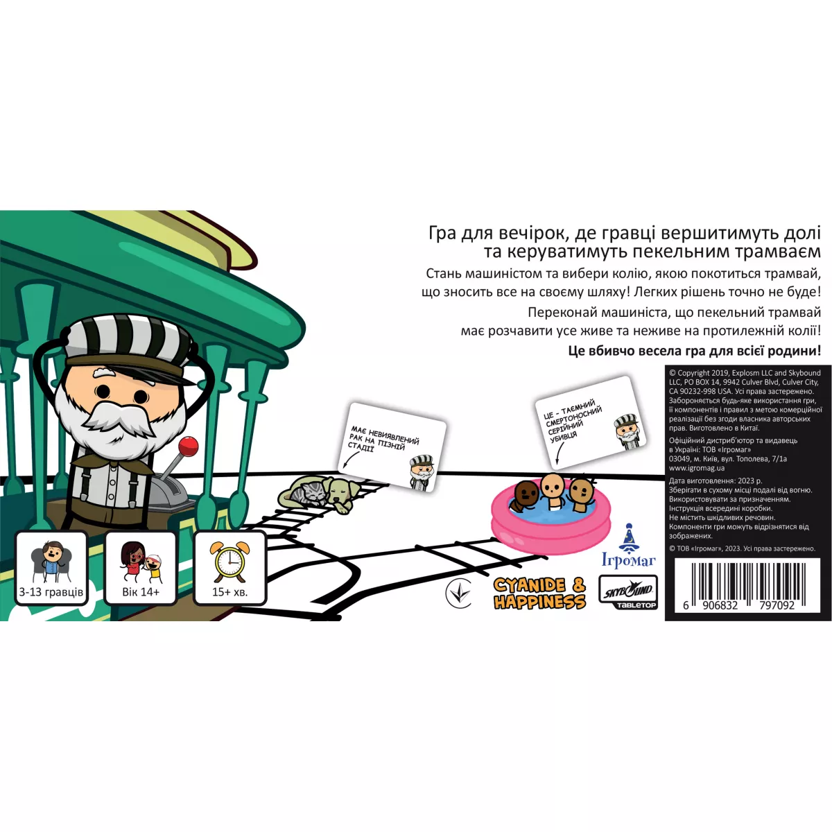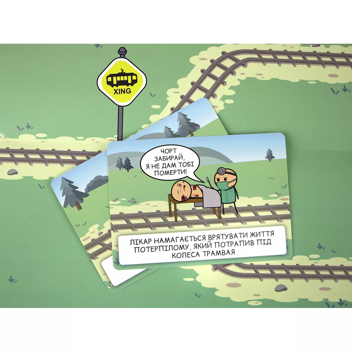 Увага! Гра не має на меті пропаганду насильства, ігор на трамвайних коліях, але точно принесе багато веселощів, чорного гумору і насильства, притаманних коміксам «Ціанід та щастя». Відомий вислів «не трамвай, об’їде!» є досить зручним у більшості випадків, окрім одного… А якщо таки трамвай? Виходить, об’їхати перешкоду нема як! Хіба що є розвилка колій і можна екстренно звернути на іншу дорогу. Головне, аби там не опинилася ще серйозніша перешкода. Саме гра Пекельний Трамвай поставить кожного з гравців перед «дилемою вагонетки»: куди поїхати, аби світ отримав найменше шкоди? А що ж буде, якщо в цю дилему додати ще й чорного гумору всім відомих «Ціанід та щастя»? (якщо ці витвори ще не знайомі, бігоменько отримувати новий досвід!) Ох, вийде просто пекельна суміш жартів, дебатів та гарного настрою, який точно не залишить всіх гравців ще довго! Про що ж гра? Кожен з гравців по черзі стає водієм того самого трамваю, якому доведеться зробити вибір: на яку колію звернути? Інші гравці діляться на дві команди, кожна з яких повинна переконати машиніста відправитися до їх суперників, аби здобути перемогу в раунді. Команда отримує три карти добра, одну з яких викладає собі на колію. Це може бути як діти, що вибігли на колії, так і лось, занесений до Червоної книги. А також обирають одну з карт зла, аби покласти її на колію супротивника. Якщо поруч із тим же лосем стоїть зомбі, який почне епідемію, то може Червона книга того не вартує?.. Чи таки вартує? І, здавалося б, тепер саме час переконувати машиніста обрати вірний шлях, але у команд залишився ще один козир у рукаві – карта таємниць! Саме ці карти можуть перевернути ситуацію до гори дриґом, розкриваючи деякі факти про тих, хто знаходиться на коліях. Як вплине на рішення машиніста те, що мила дівчинка Марічка, яка випадково вибігла бавитися на колію, насправді є реінкарнацією Гітлера та хоче захопити увесь світ? Марічко-Марічко, як так, ми ж вірили тобі! Якщо ви вже вигадуєте, які каверзи будете підкидати на колію супротивника, або ж подумки обираєте, куди б спрямувати ваш трамвай, - купуйте гру Пекельний Трамвай, кличте друзів на вечірку та будьте готові до справжнього чорного-пречорного гумору! Якщо ж далеко відходити від теми колій не хочеться, але давити колесами дітей, бабусь та мімів-маніяків поки що не мрія життя, краще спокійненько побудуйте власну залізнодорожну імперію на дикому заході у грі Pioneer Rails.