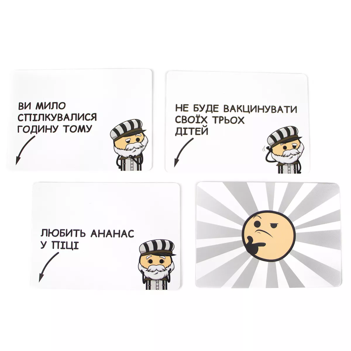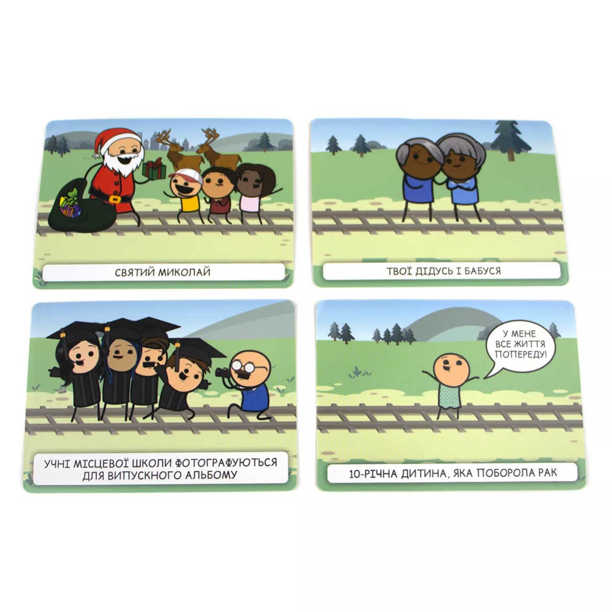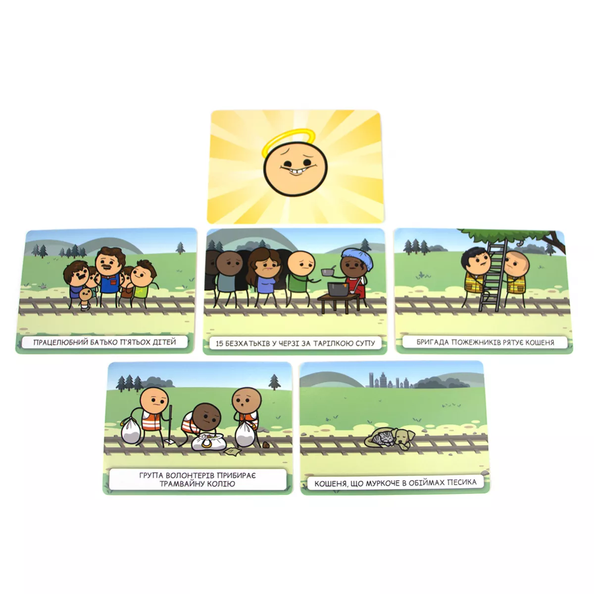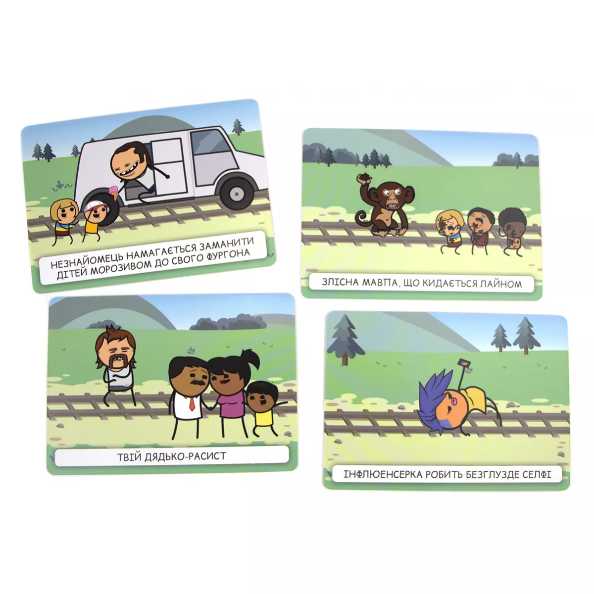 Увага! Гра не має на меті пропаганду насильства, ігор на трамвайних коліях, але точно принесе багато веселощів, чорного гумору і насильства, притаманних коміксам «Ціанід та щастя». Відомий вислів «не трамвай, об’їде!» є досить зручним у більшості випадків, окрім одного… А якщо таки трамвай? Виходить, об’їхати перешкоду нема як! Хіба що є розвилка колій і можна екстренно звернути на іншу дорогу. Головне, аби там не опинилася ще серйозніша перешкода. Саме гра Пекельний Трамвай поставить кожного з гравців перед «дилемою вагонетки»: куди поїхати, аби світ отримав найменше шкоди? А що ж буде, якщо в цю дилему додати ще й чорного гумору всім відомих «Ціанід та щастя»? (якщо ці витвори ще не знайомі, бігоменько отримувати новий досвід!) Ох, вийде просто пекельна суміш жартів, дебатів та гарного настрою, який точно не залишить всіх гравців ще довго! Про що ж гра? Кожен з гравців по черзі стає водієм того самого трамваю, якому доведеться зробити вибір: на яку колію звернути? Інші гравці діляться на дві команди, кожна з яких повинна переконати машиніста відправитися до їх суперників, аби здобути перемогу в раунді. Команда отримує три карти добра, одну з яких викладає собі на колію. Це може бути як діти, що вибігли на колії, так і лось, занесений до Червоної книги. А також обирають одну з карт зла, аби покласти її на колію супротивника. Якщо поруч із тим же лосем стоїть зомбі, який почне епідемію, то може Червона книга того не вартує?.. Чи таки вартує? І, здавалося б, тепер саме час переконувати машиніста обрати вірний шлях, але у команд залишився ще один козир у рукаві – карта таємниць! Саме ці карти можуть перевернути ситуацію до гори дриґом, розкриваючи деякі факти про тих, хто знаходиться на коліях. Як вплине на рішення машиніста те, що мила дівчинка Марічка, яка випадково вибігла бавитися на колію, насправді є реінкарнацією Гітлера та хоче захопити увесь світ? Марічко-Марічко, як так, ми ж вірили тобі! Якщо ви вже вигадуєте, які каверзи будете підкидати на колію супротивника, або ж подумки обираєте, куди б спрямувати ваш трамвай, - купуйте гру Пекельний Трамвай, кличте друзів на вечірку та будьте готові до справжнього чорного-пречорного гумору! Якщо ж далеко відходити від теми колій не хочеться, але давити колесами дітей, бабусь та мімів-маніяків поки що не мрія життя, краще спокійненько побудуйте власну залізнодорожну імперію на дикому заході у грі Pioneer Rails.