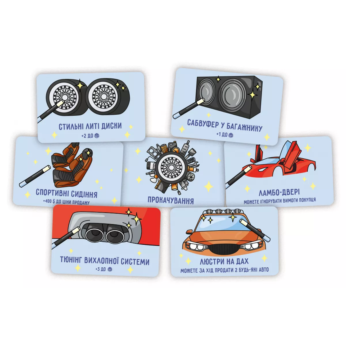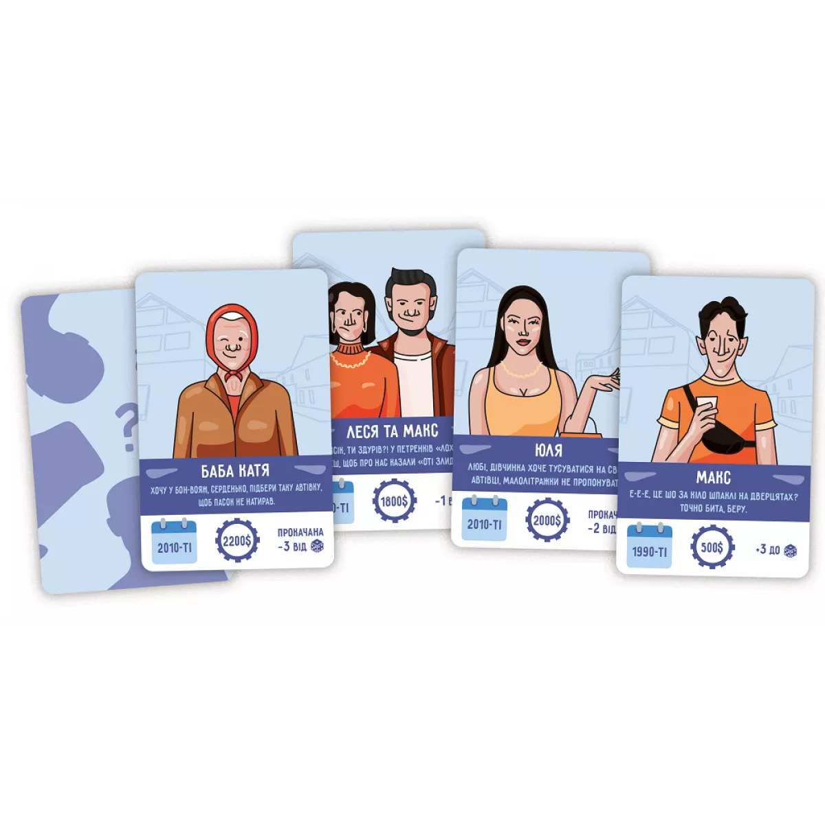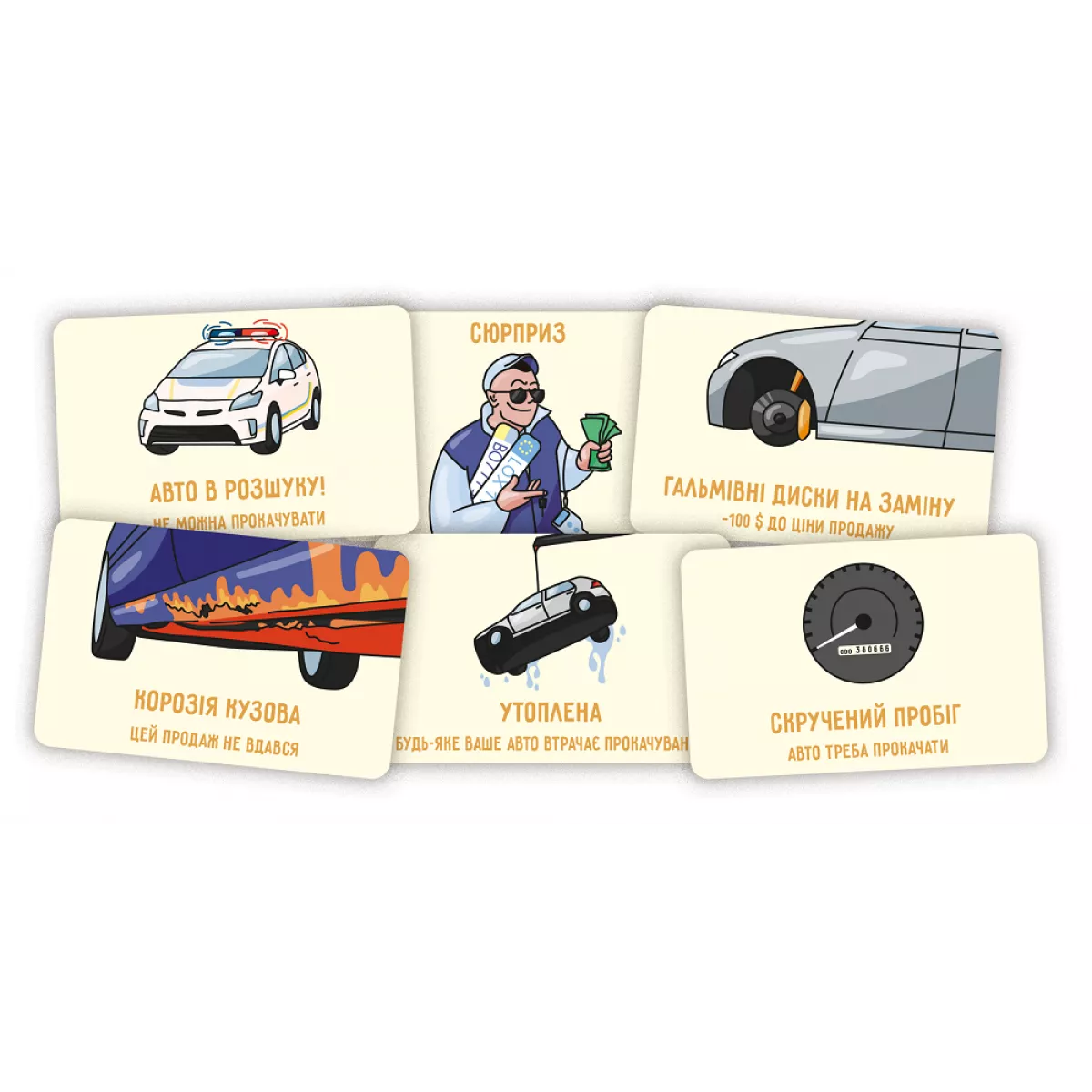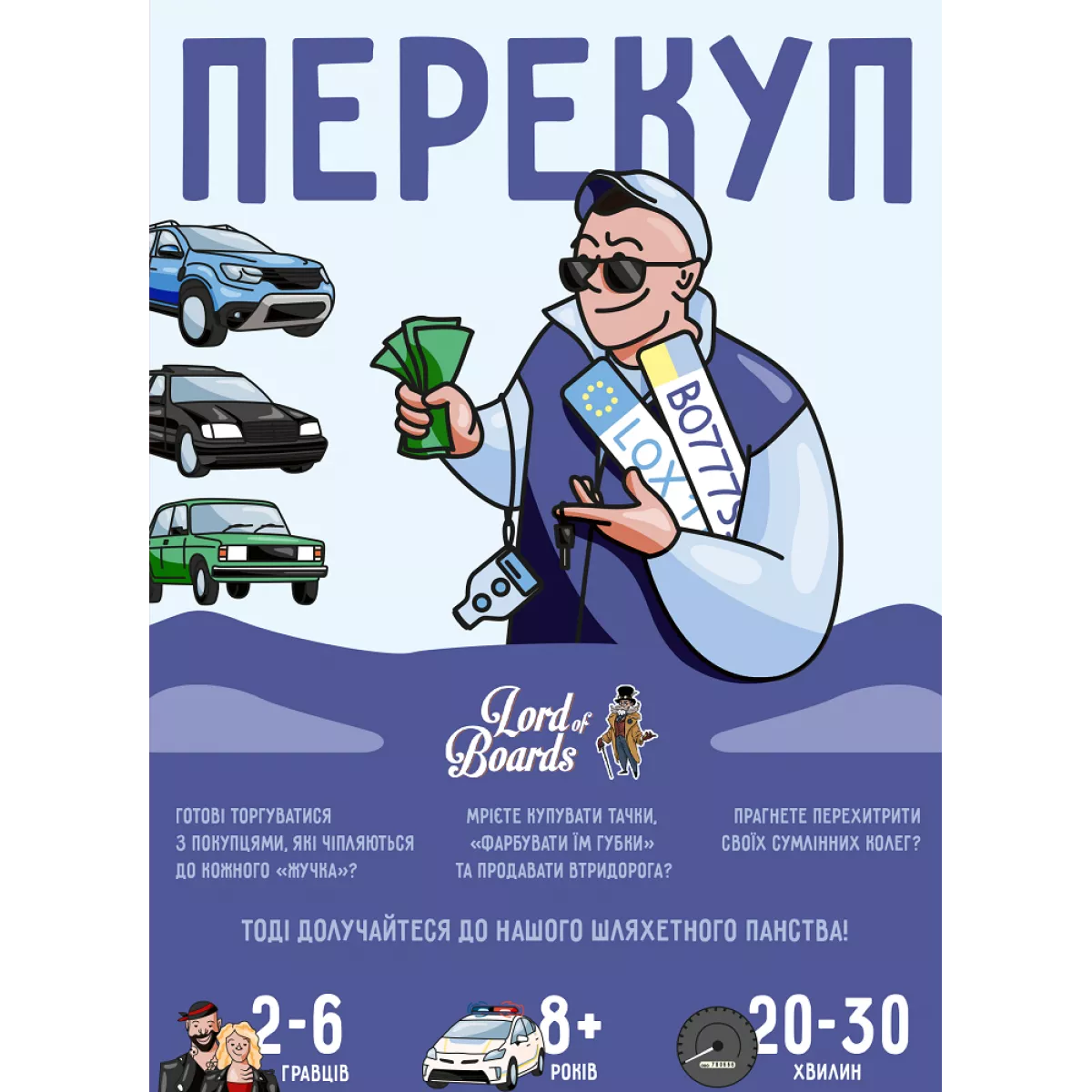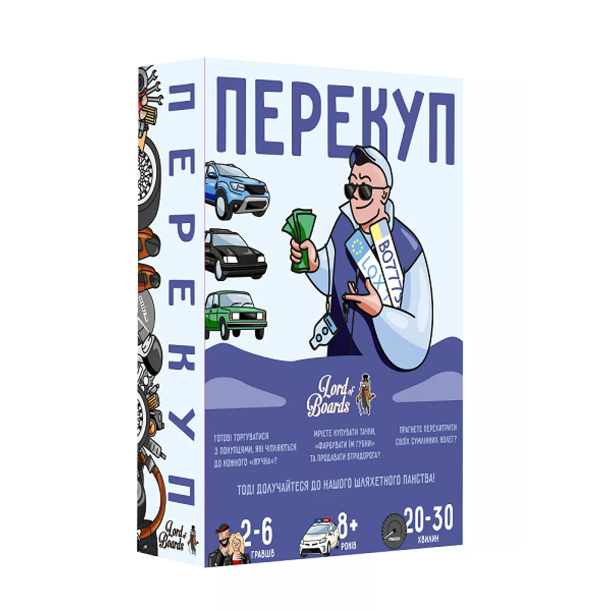 Приготуйтеся перетворитися на справжнього перекупника вживаних авто і налаштовуйтеся робити великі гроші! Щоб досягти успіху в цій справі, доведеться скуповувати автомобілі з пробігом, тюнінгувати їх і продавати дорожче. Однак не варто вважати покупців наївними – вони дуже ретельно перевірятимуть кожну деталь та шукатимуть «жучки» на фарбі. Може статися і так, що на етапі продажу розкриються деякі неприємні сюрпризи, здатні зіпсувати плани навіть досвідченого перекупу. Перекуп – це швидкий колодобудівний філер невисокої важкості з елементами економіки. Він гарно підійде як для досвідчених гравців, так і для початківців. Гра створена українським автором, то ж однозначно варта вашої уваги та підтримки. Усередині коробки ви знайдете багато візуально знайомих компонентів: карти, кубик, жетони грошей та шпаргалки для початківців, які допоможуть швидко зрозуміти і поринути в ігровий процес. Ласкаво просимо до шляхетного перекупського панства! Приготуйтеся вести справжній бізнес, торгуватися та грамотно розпоряджатися грошима. Гра підійде для великої компанії та захопить всю вашу увагу, але не поспішайте, якщо хочете стати по-справжньому успішним. Партія починається з того, що всім учасникам роздають гроші, які вони вкладають у справу. У центрі столу розкладаються чотири колоди з наступними картами: Автомобілі. Покупці. Прокачування. Сюрпризи. Після цього з усіх стосів, за винятком «Сюрпризів», потрібно викласти горілиць певну кількість карт, сформувавши ринок попиту та пропозиції. Тут будуть доступні для купівлі автомобілі, а також покупці, які шукають той чи інший варіант. Гравець, який останнім здійснював купівлю або продаж, починає гру першим. Ігровий процес поділений на кілька фаз, під час яких учасникам доступні певні дії: Фаза придбання. Учасники почергово можуть купити будь-яке одне авто і одне прокачування. Останнє встановлюється на автомобіль та підвищує шанси на його продаж або вартість. Також після покупки потрібно взяти картку зі стопки «Сюрпризи» і покласти поряд за автомобілем, не розкриваючи її. Про проблему автомобіля власник дізнається лише тоді, коли настане час продавати його. Фаза продажу. Тепер гравці продають свої автівки. За хід можна шукати покупця лише для однієї машини за поодинокими винятками. На картці покупців зазначені їхні побажання, вимоги та сума, яку людина готова заплатити. Щоб продати машину, необхідно, аби вона відповідала цим умовам. Наприклад, дехто шукає щось із автопрому 1990-х, але з обов’язковим прокачуванням. Виконавши всі умови та підвищивши шанси продажу, вам ще доведеться кинути кубик – і це найцікавіше! Після кидка вам треба додати та/або відняти значення на інших картах та якщо в підсумку вийшло від 4 до 6, то продаж успішний. Таким чином, хоча ви можете впливати на вірогідність продажу, частіше за все лишається шанс, що покупець відмовиться навіть від найкращого варіанту – все, як і в реальному  житті! Фаза оновлення ринку. Коли всі випробували фортуну під час продажу авто, потрібно прибрати карти на ринку, що залишилися. Вони скидаються, а на стіл викладаються нові автомобілі, покупці та прокачування. Автівки у власності перекупів, що не вдалося продати, лишаються в них. Жетон першого гравця передається людині ліворуч, гравці переходять у новий раунд, знову купляють, по