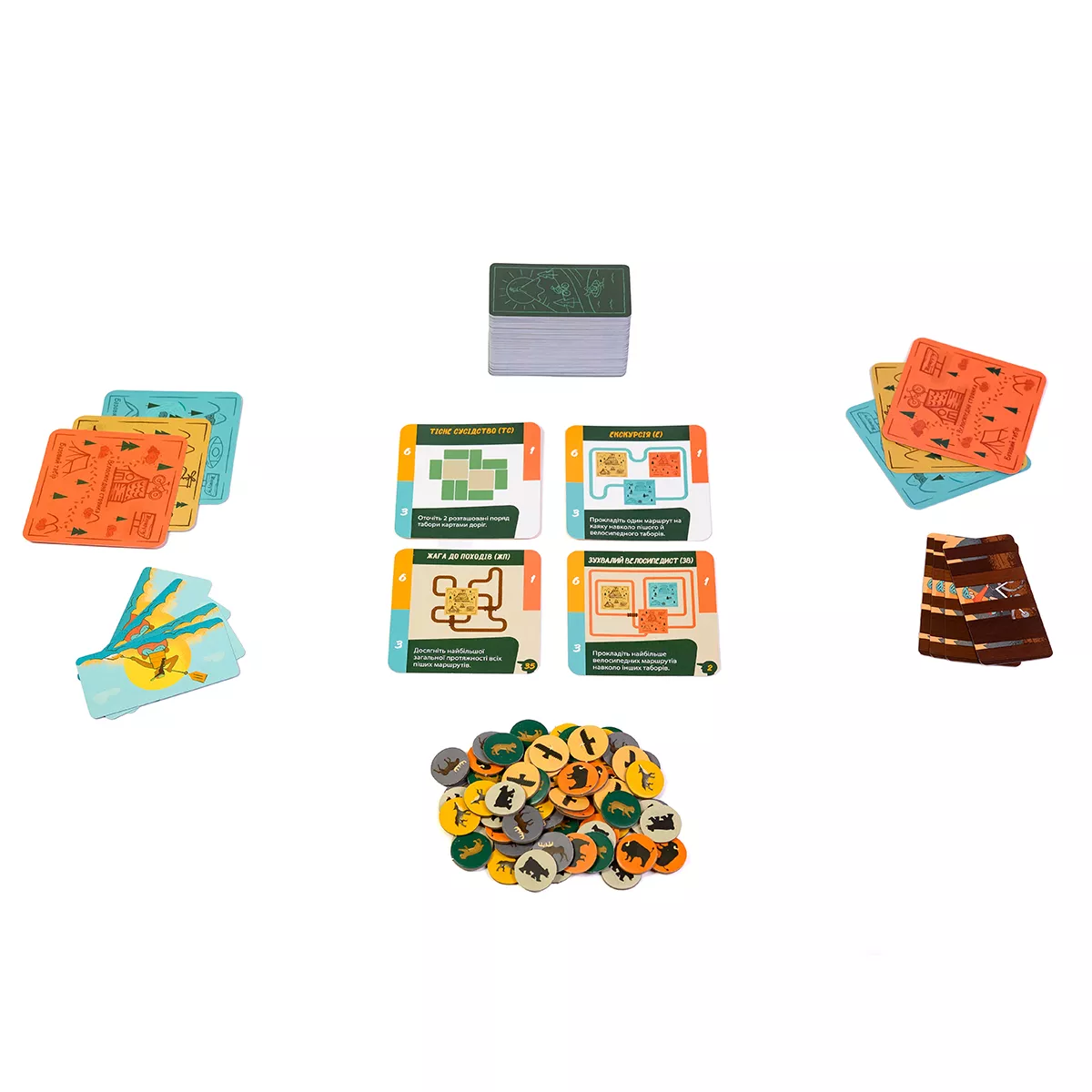 У коробці 3 набори по 4 карти табору, 12 карт завдань, 4 набори по 4 карти гравців, 135 карт доріг, карта соло-режиму, правила гри