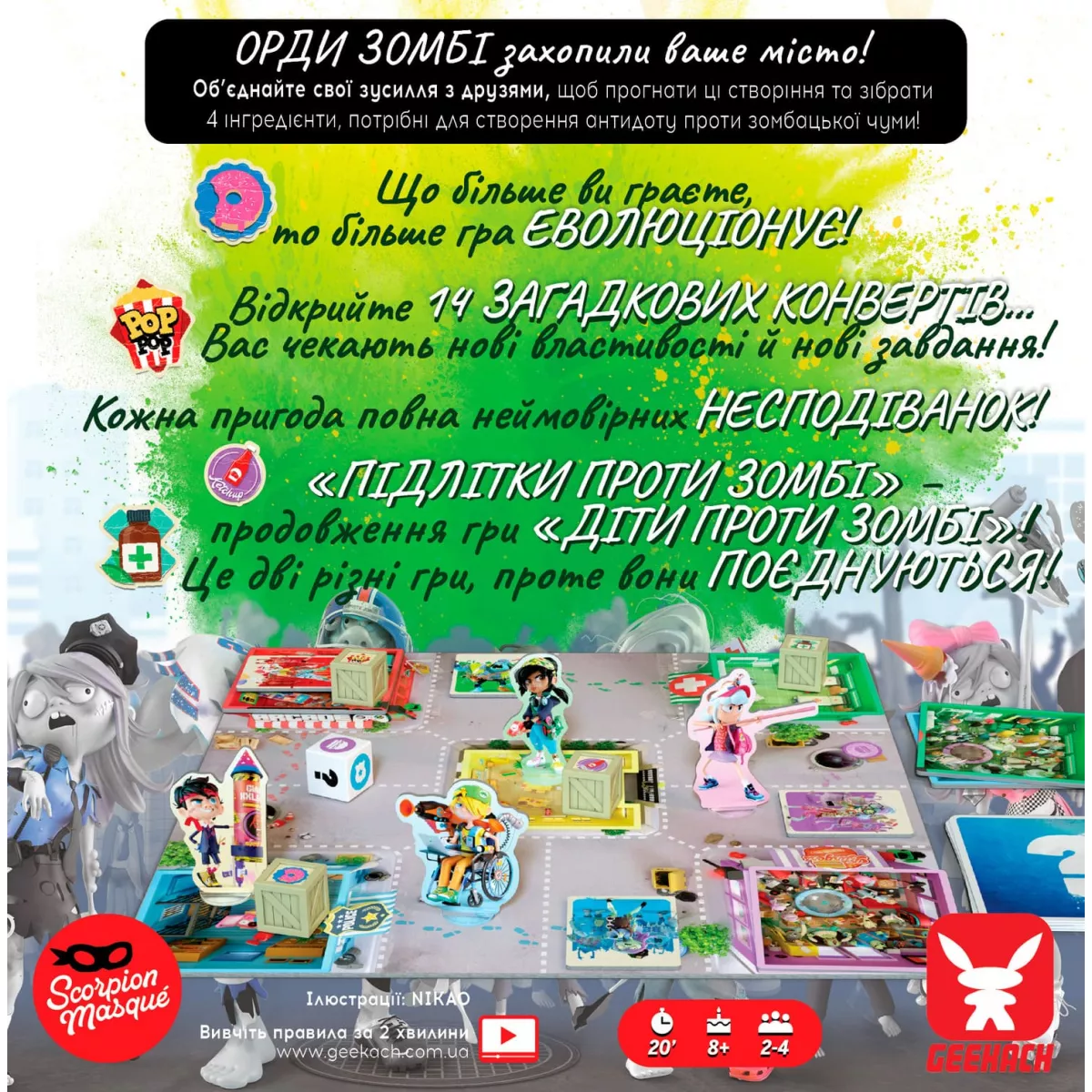 «Підлітки проти зомбі» - кооперативна гра з механікою спадку. Учасники проходять кампанію, поступово змінюючи гру, наклеюючи наліпки, прокачуючи своїх героїв й отримуючи сильніших ворогів. У комплекті десять конвертів еволюції з секретними компонентами. Вони відкриваються в міру проходження кампанії. Також є 4 конверти з досягненнями.