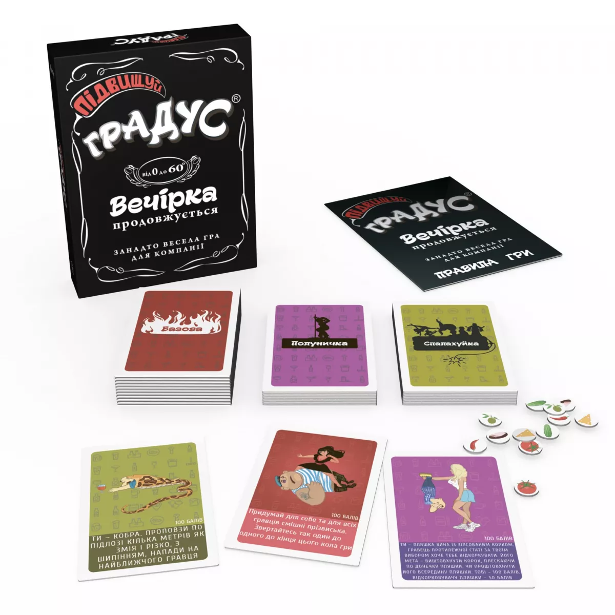 Настільна гра для компанії Підвищуй Градус - неперевершений ХІТ для вибухової вечірки, гучного застілля або крутого корпоративу! Це одночасно і класна гра для вечірки, в яку можна грати в компанії від 3 до 12 осіб, і продовження самої веселої алкогри для компанії Градус. Рецепт запального настрою: збери друзів, накрий стіл та підвищуй-підвищуй Градус. Незабутній відрив забезпечений! А на десерт в коробці з грою - пікантна колода Полуничка (використовується, якщо хо ...). А ще можна приготувати ульотний коктейль з новими завданнями: змішай гру Підвищуємо Градус з грою Градус! Що в коробці? 1. Базова колода  - півлітра крутих завдань. 2. Запальничка - чекушка запальних приколів. 3. Полуничка - 250 мл пікантного десерту. Може містити сліди: планшети гравців, жетони та правила гри. Міністерство охорони здоров'я попереджає: в цій грі алкоголь можливий, але НЕ обов'язковий!