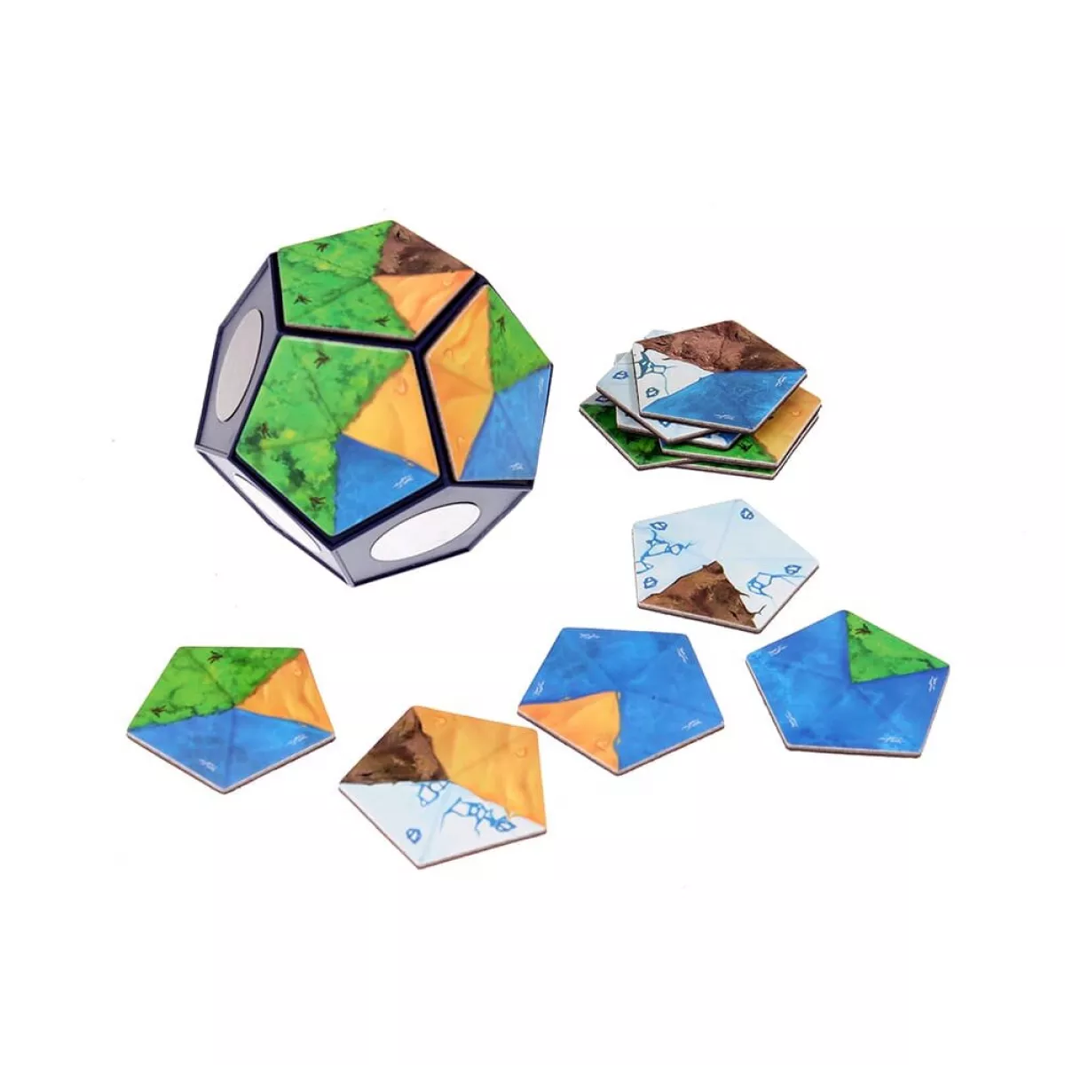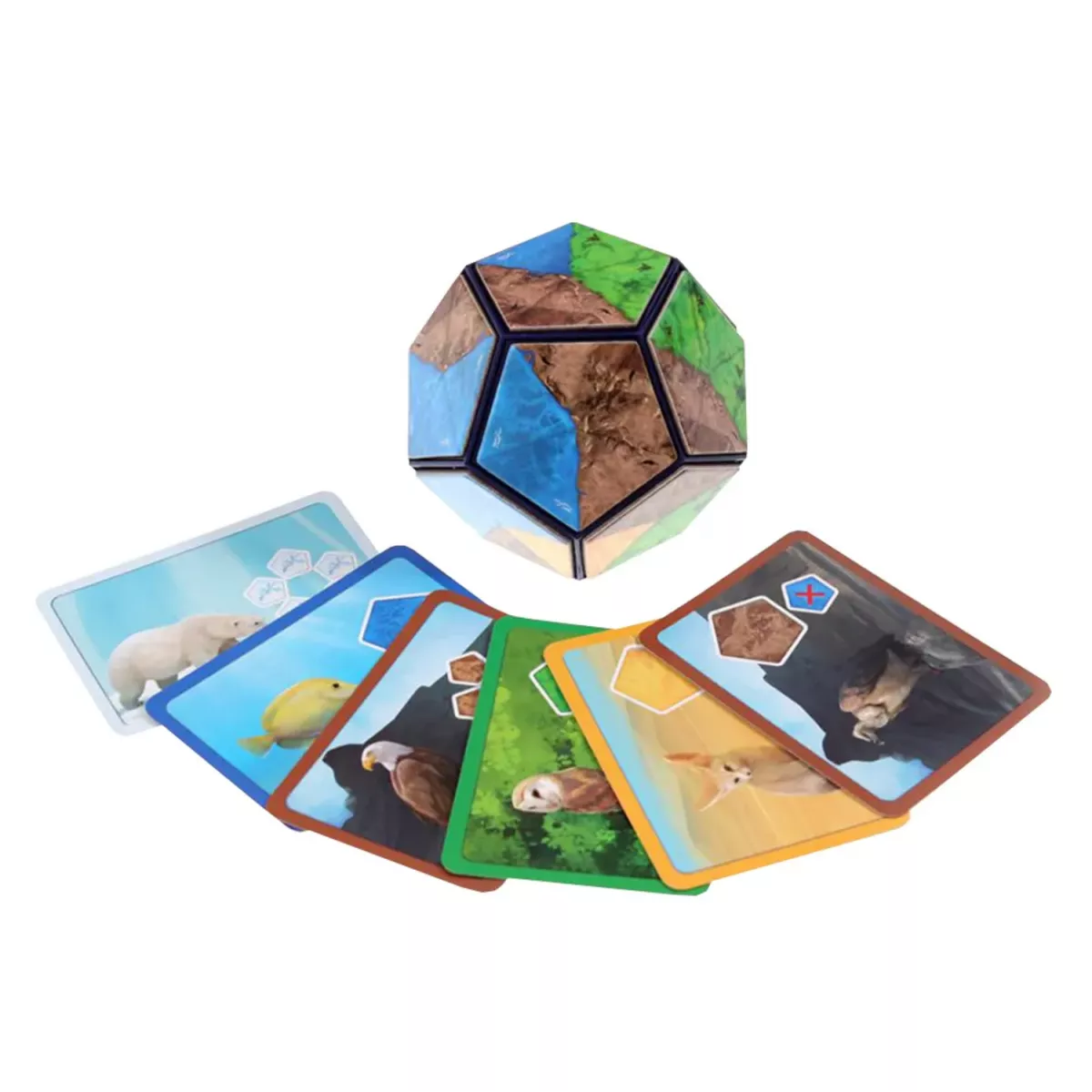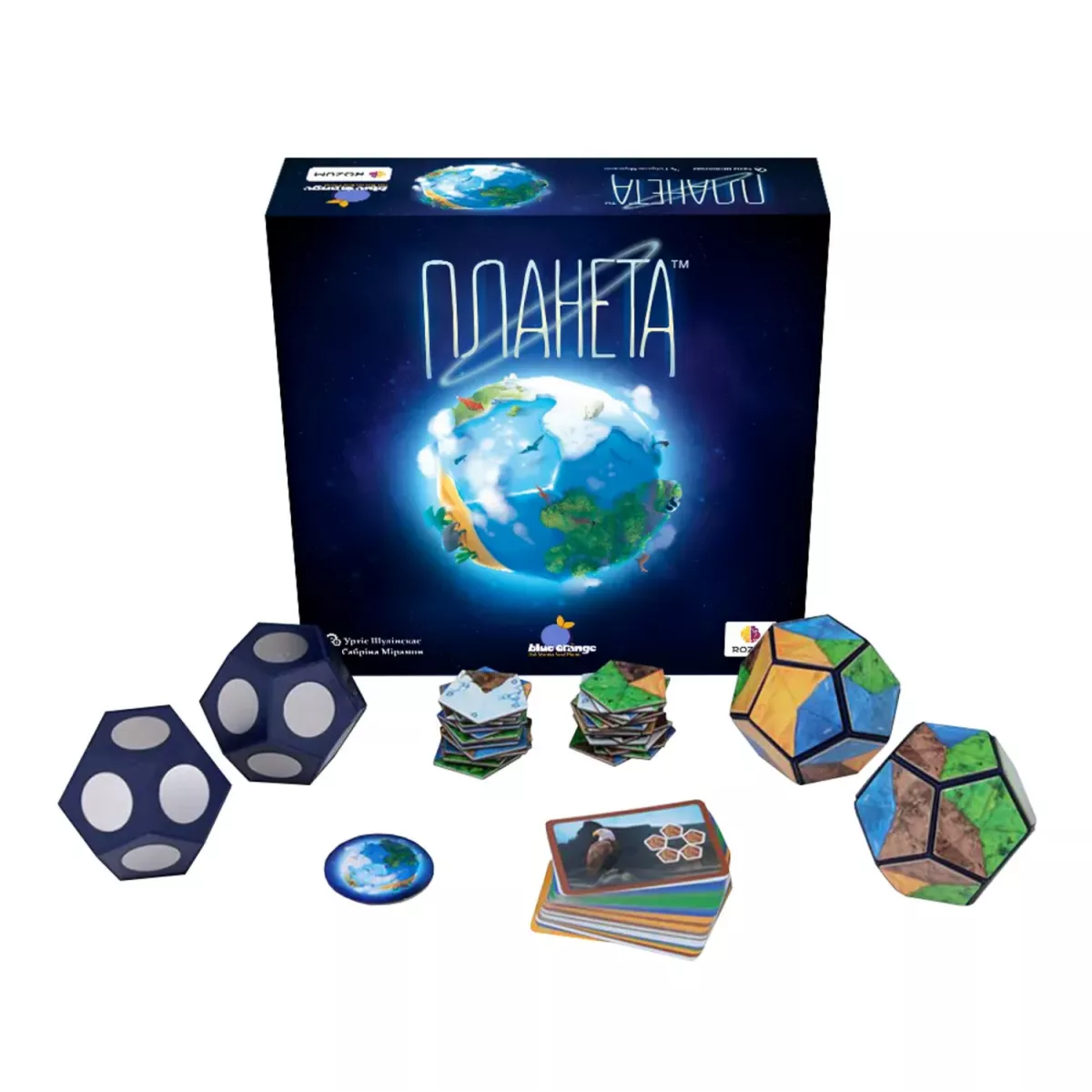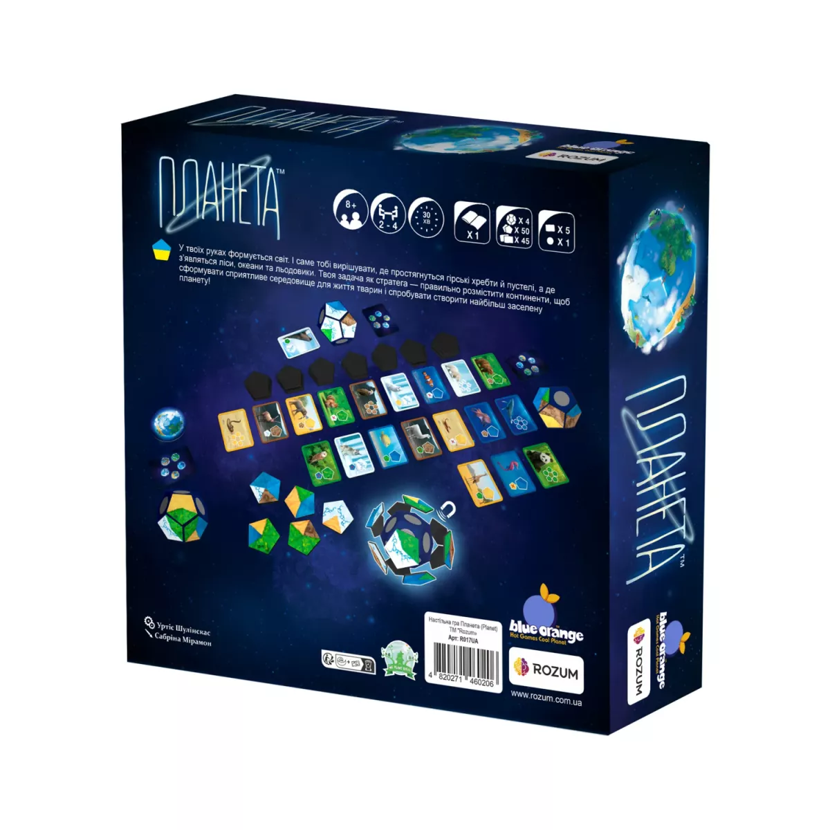 Вам хотілося колись пограти у Бога? При чому починаючи із самого початку – із створення власної планети, обрання різних типів місцин і заселення їх тваринами! Сьогодні є така змога у дуже незвичайній грі Планета (Planet). Що ж такого незвичайного у цій настілочці? Обмеження у кількості граців, а саме від 2 до 4, обумовлено тим, що в коробочці лежать 4 об’ємні основи для  планет! Це не пласкі карти, на яких вам треба малювати території, а макет справжньої планети, кожна грань якої має магніт. Час створювати новий всесвіт! Гравці по черзі обирають один із доступних у цьому раунді тайлів із різними типами місцин, таких як гори, пустелі, океани, ліси тощо. Цей тайл прикріплюється на магнітах до вашої планети, утворюючи її нову поверхню. У подальших ходах ви ще й маєте змогу поторгуватися за тварин, що будуть у вас жити, а у пізніх раундах навіть за кількох одночасно. Тільки торги будуть проходити таким чином, що ви скоріше рекламуєте себе для цих тварин. Гігантський кальмар захоче жити на планеті з найбільшою кількістю океанів та найменшою кількістю пустель, ведмедю потрібно, щоб ліси були поруч із горами, а ящірки захочуть жити там, де буде багато відокремлених пустель. Кожна тварина, що обрала саме вас, принесе наприкінці гри переможні очки. Та це не єдиний спосіб їх заробити, адже на початку гри ви отримаєте таємну мету, яку саме планету варто побудувати – льодяний шар, лісовий рай, або пустельного розпеченого двійника Арракісу. Гра Планета стане чудовим придбанням у будь-яку колекцію настілочок, адже вона підійде і для дорослих, дозволяючи продумувати власну стратегію розбудови планети на багато ходів вперед, і для дітей, з якими можна грати по спрощених правилах, але незвична форма «ігрового поля» дозволить більше розвинути просторові здібності та уяву. Та якщо вам потрібні ще більш різноманітні види та поєднання тварин, а гра на двовимірній площині не є великою проблемою, зверніть увагу на гру Каскадія, яка є однією з найкращих абстрактних ігор у світі!
